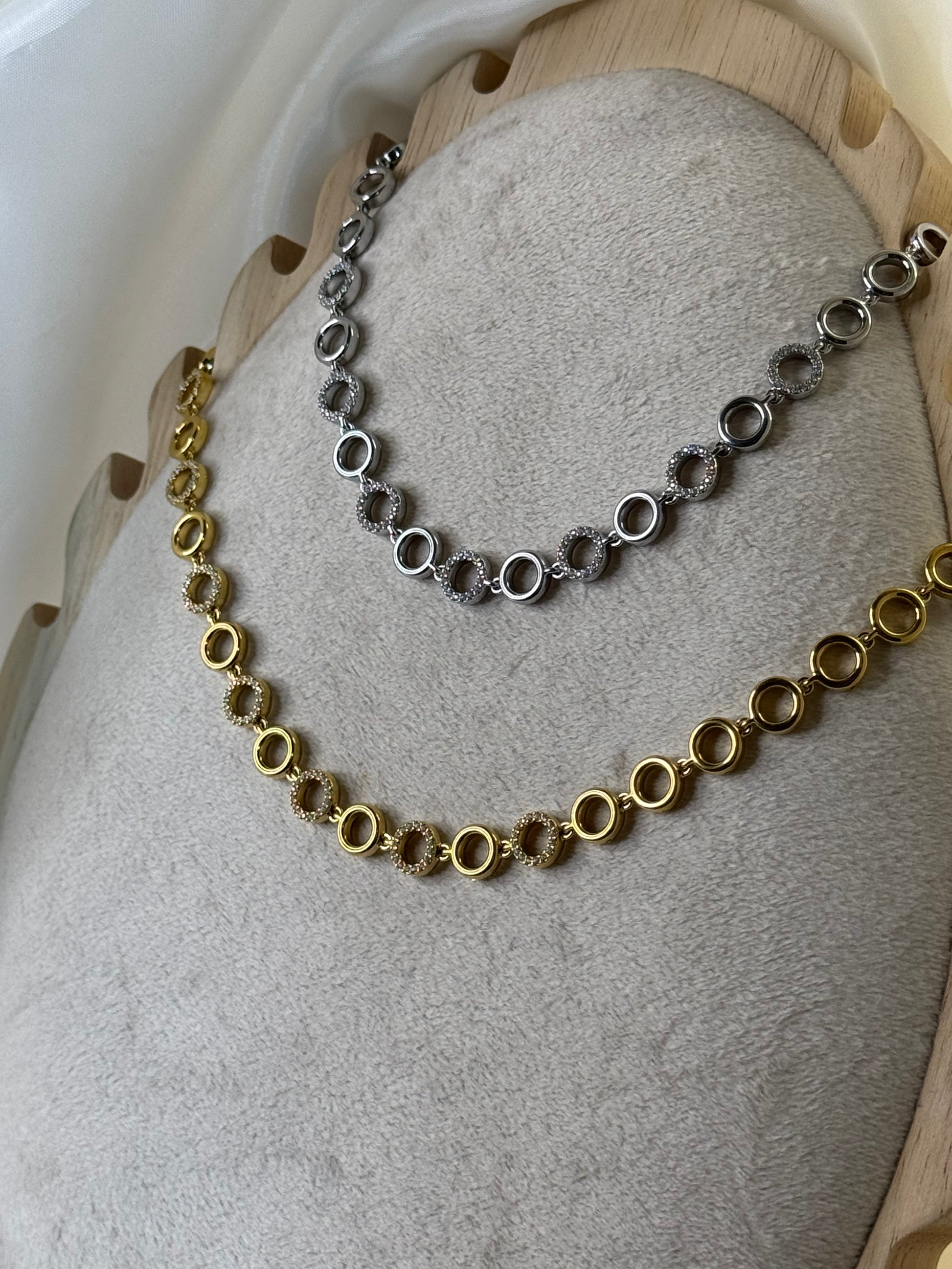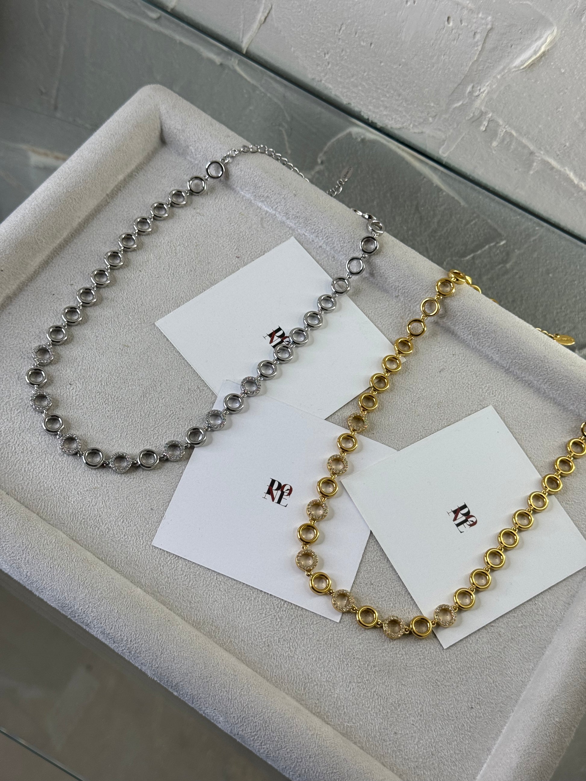 Ένα κομψό κολιέ με μοντέρνο σχεδιασμό από ενωμένους κρίκους, που αποπνέει διαχρονική φινέτσα. Ιδανικό για να φορεθεί μόνο του ή σε layering με άλλα κοσμήματα, προσδίδει λάμψη και στυλ σε κάθε εμφάνιση.