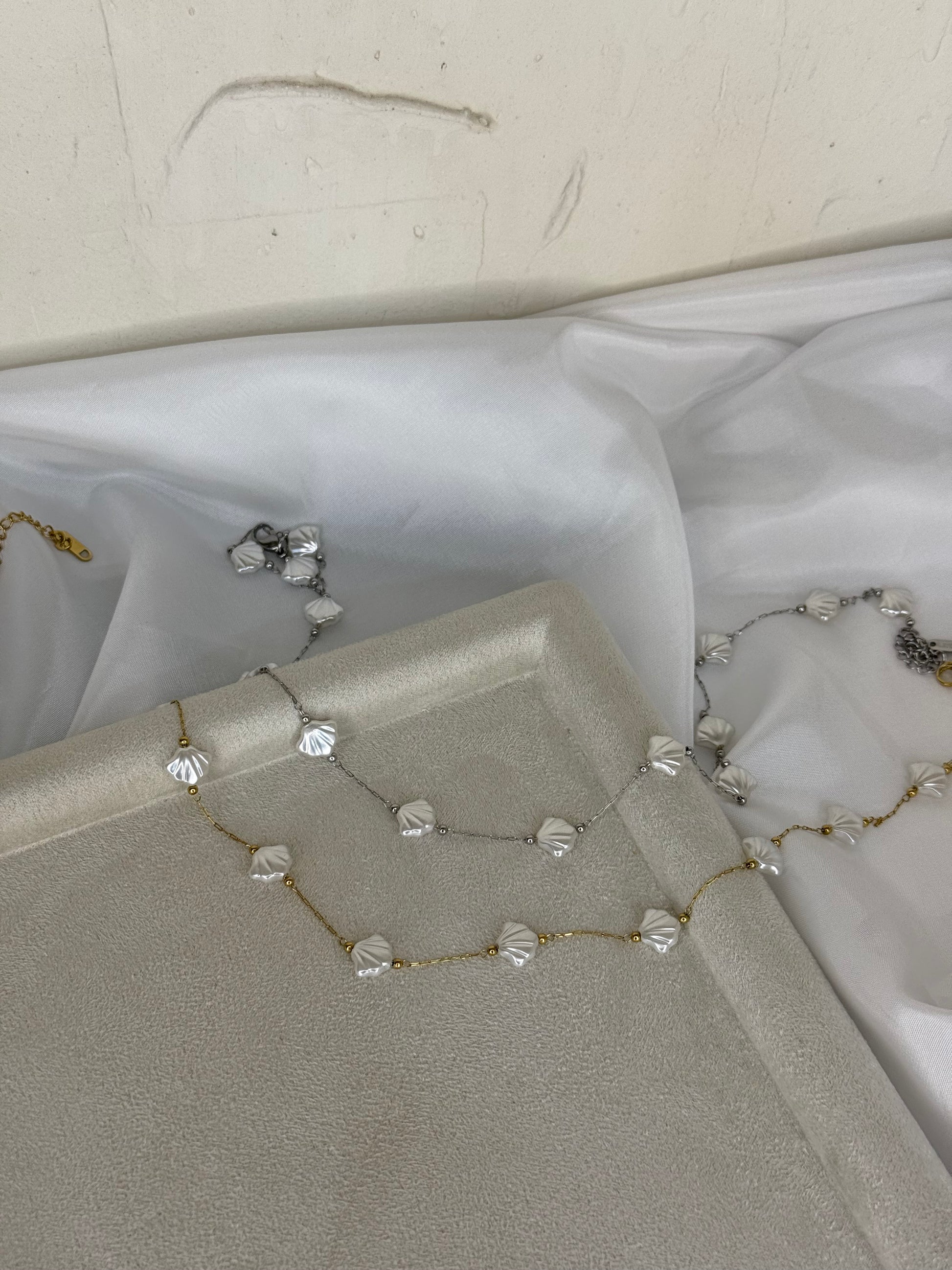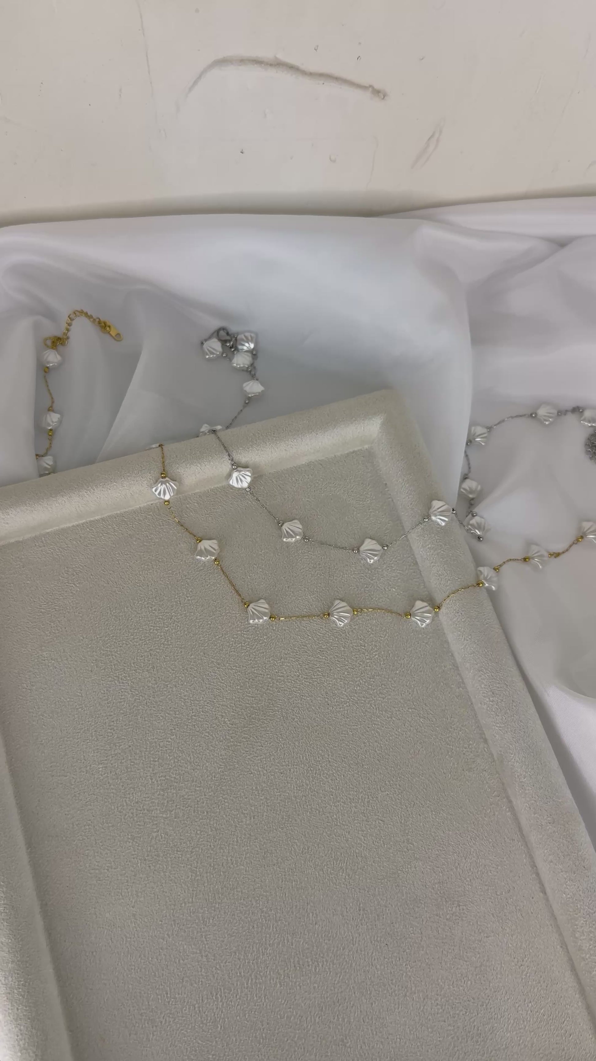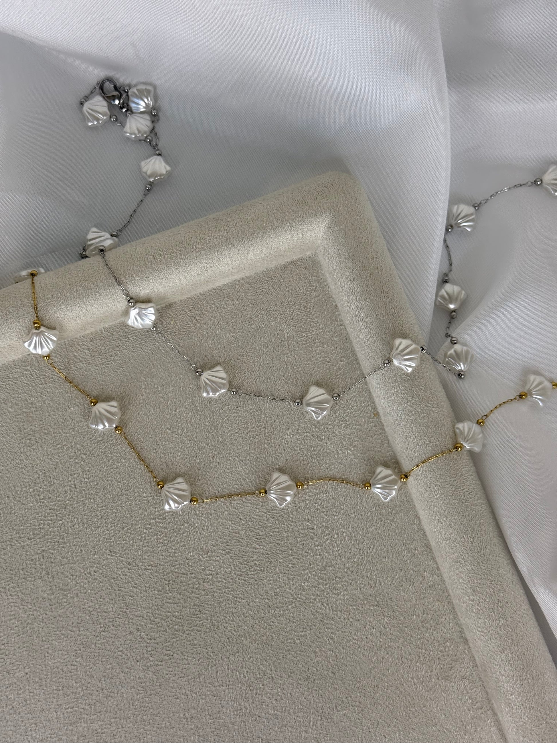 Εμπνευσμένο από τις θαλάσσιες νύμφες της αρχαιότητας, το “Nerēis” είναι ένα εκλεπτυσμένο ατσάλινο κολιέ με μαργαριταρένια στοιχεία σε σχήμα κοχυλιού. Χρυσό ή ασημί✨φωτίζει τον λαιμό με τη χάρη και τη μυσταγωγία μιας θεάς του βυθού.