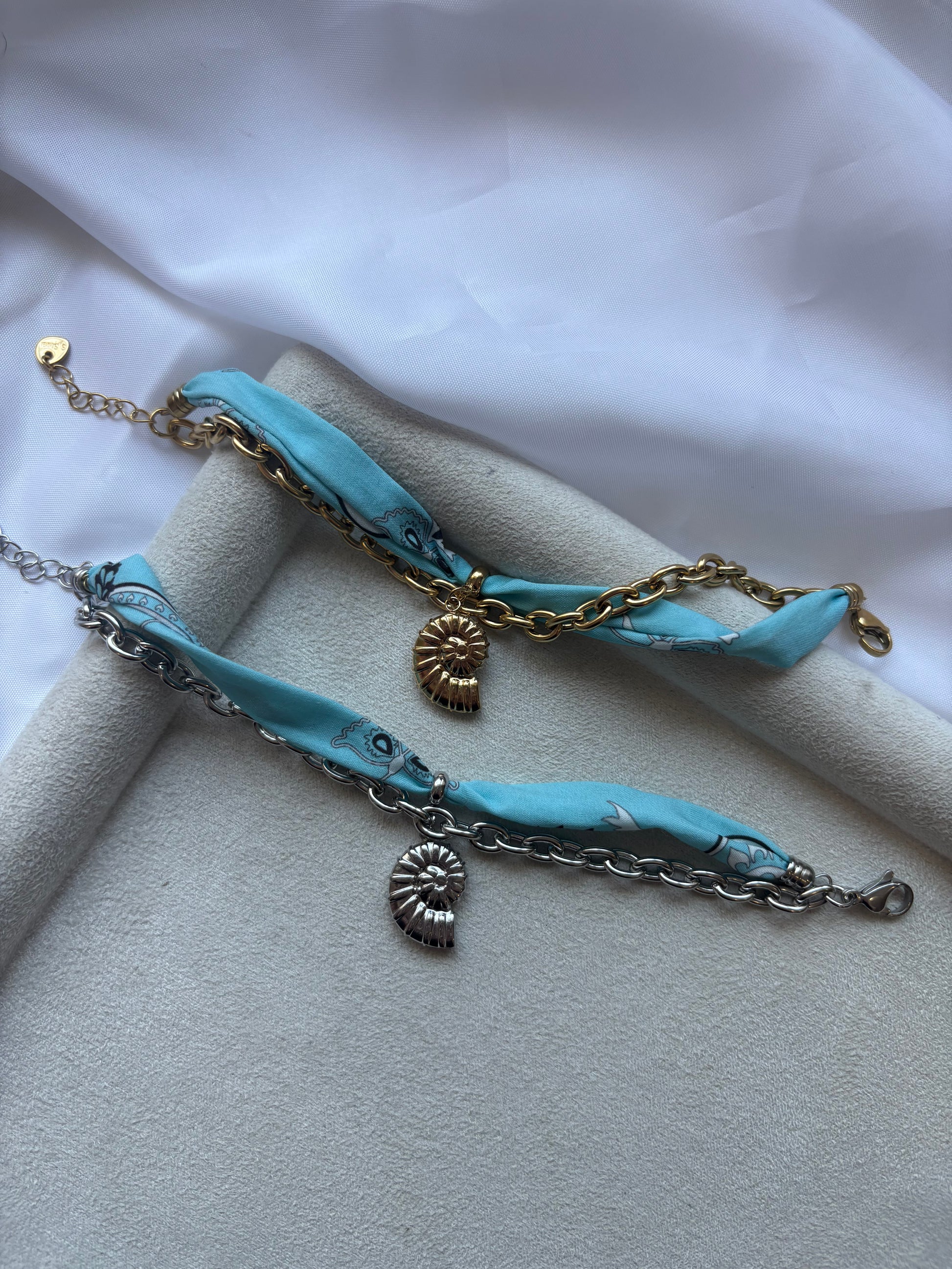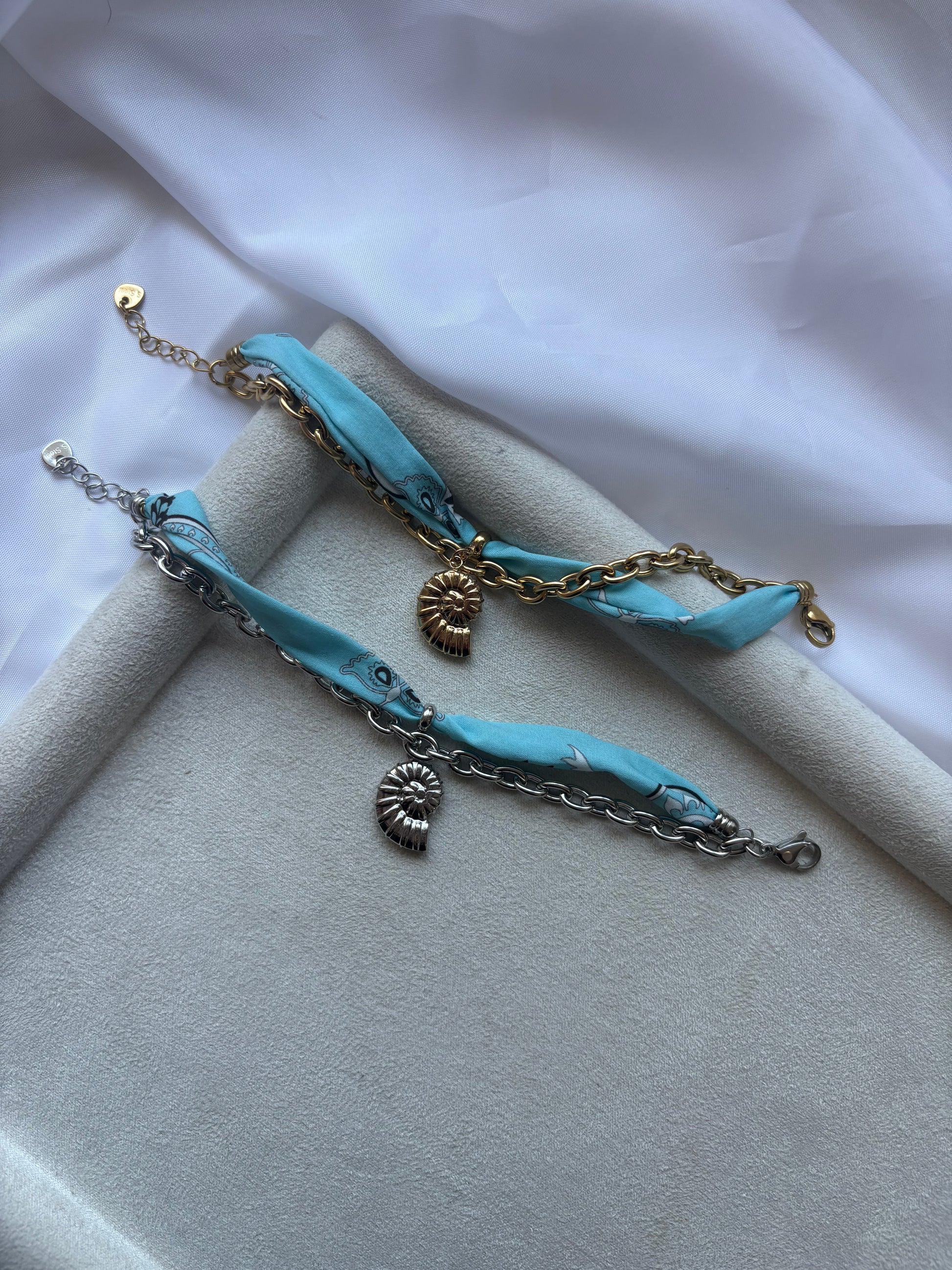 Δύο βραχιόλια, εμπνευσμένα από τα κοχύλια του Αιγαίου και δεμένα με γαλάζια αύρα.
