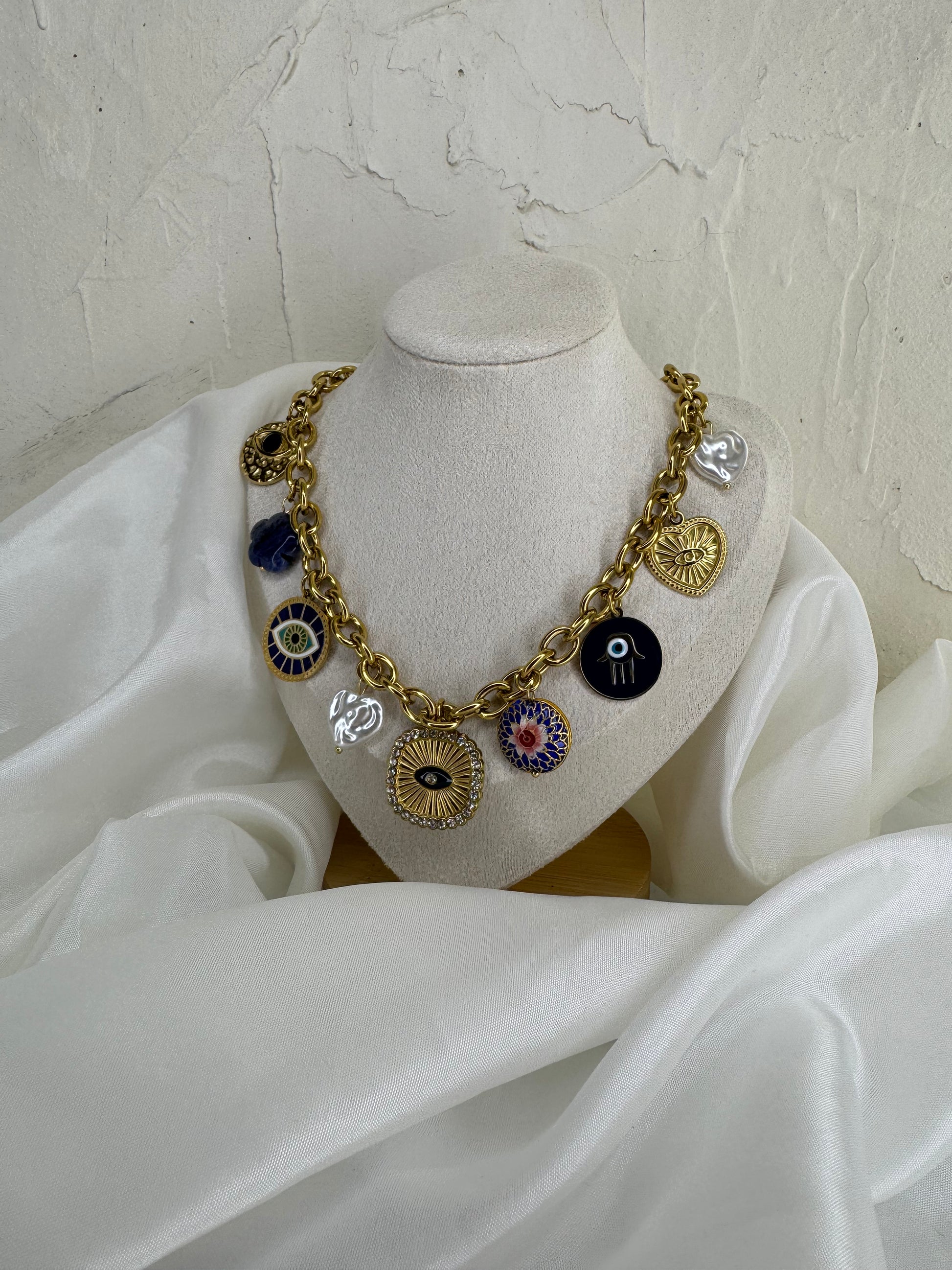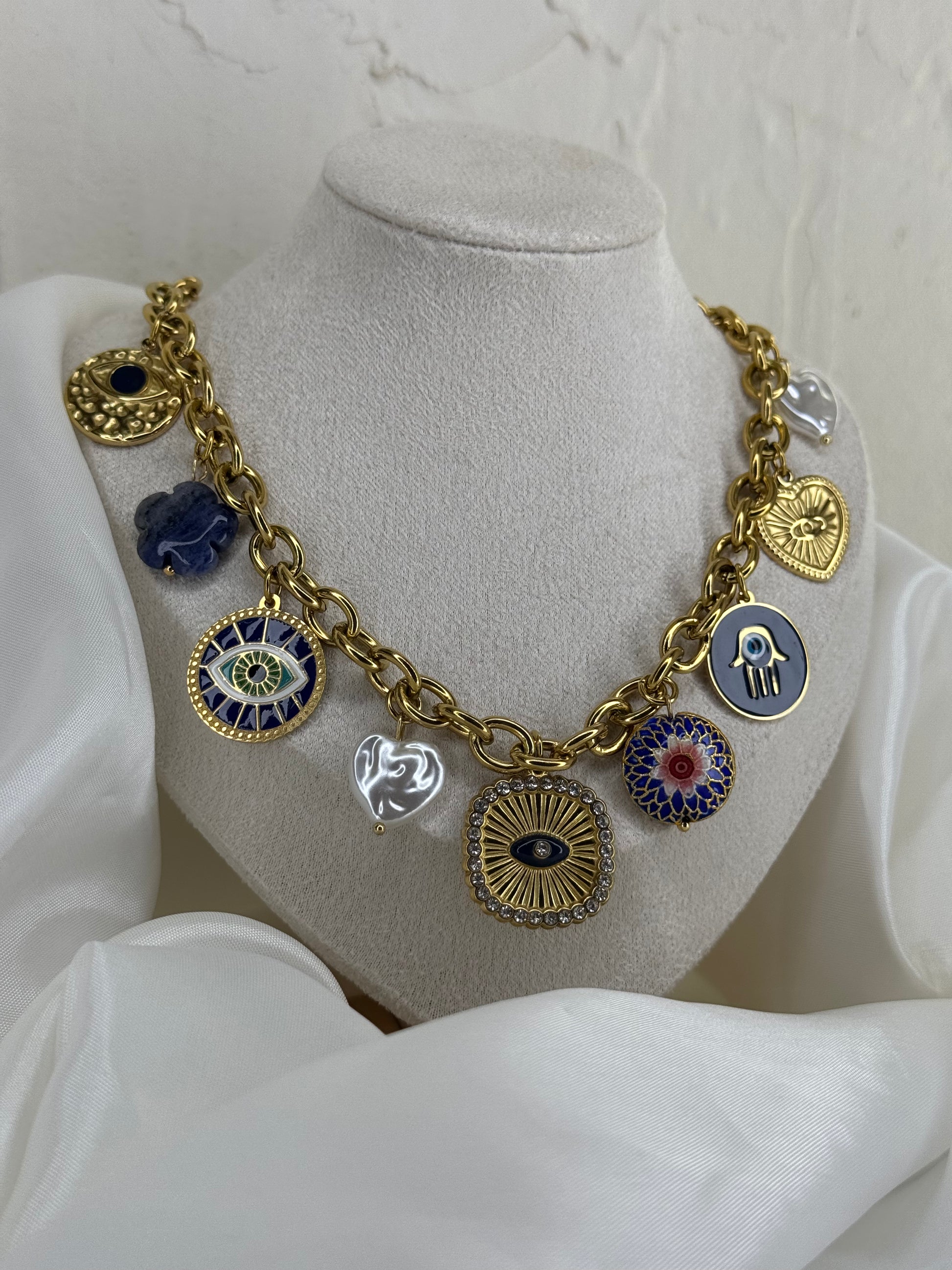 Ένα κολιέ που συνδυάζει το μυστήριο με την κομψότητα. Η χρυσή αλυσίδα στολίζεται με ποικιλία από charms, ανάμεσά τους δύο περλέ καρδιές που χαρίζουν ρομαντική διάθεση. Στο κέντρο δεσπόζει το τετράγωνο μπλε μάτι, πλαισιωμένο από λαμπερά στρας, σύμβολο προστασίας και θετικής ενέργειας. Ένα κόσμημα που ξεχωρίζει για την έντονη λάμψη και τον ιδιαίτερο χαρακτήρα του.