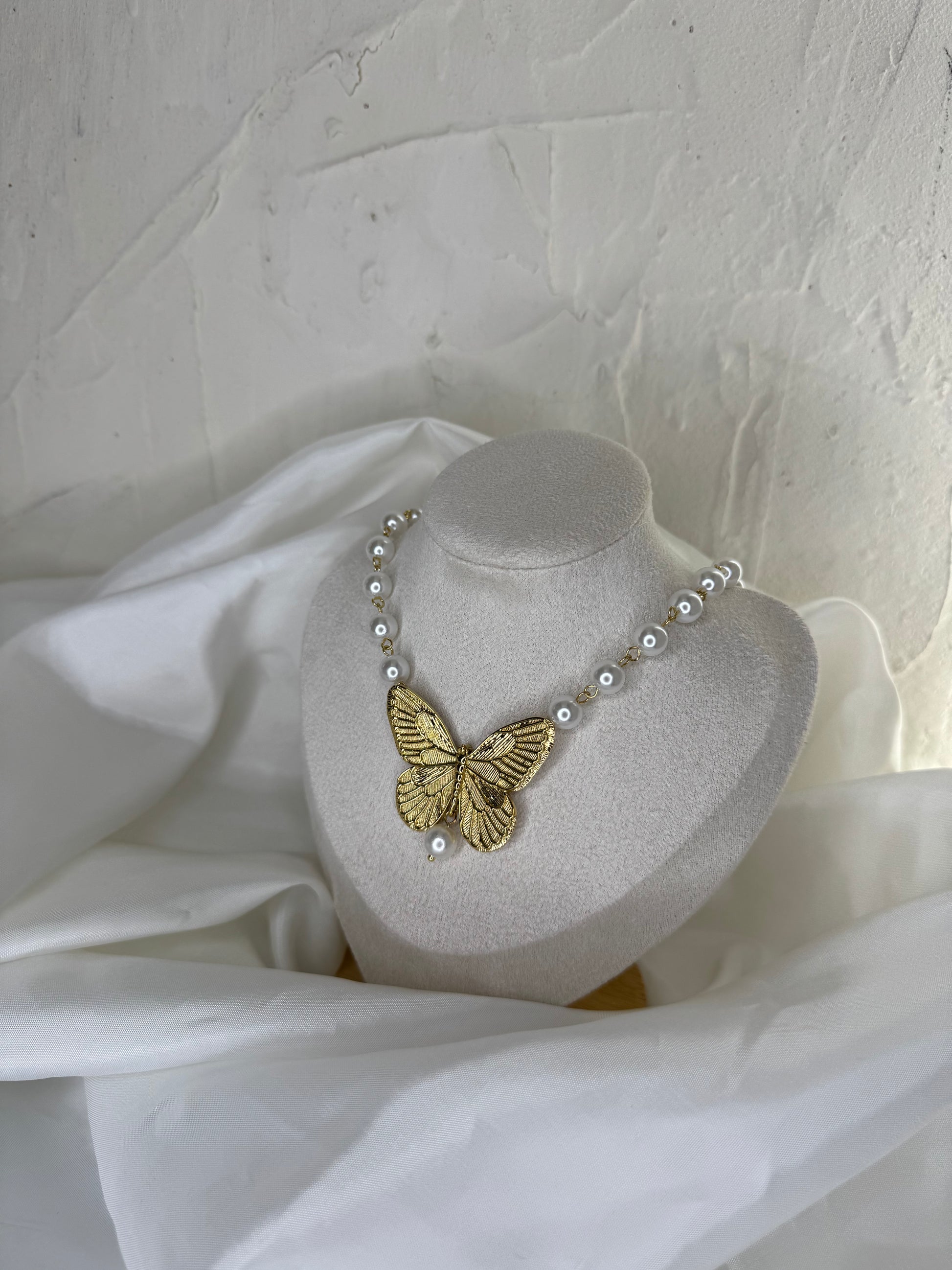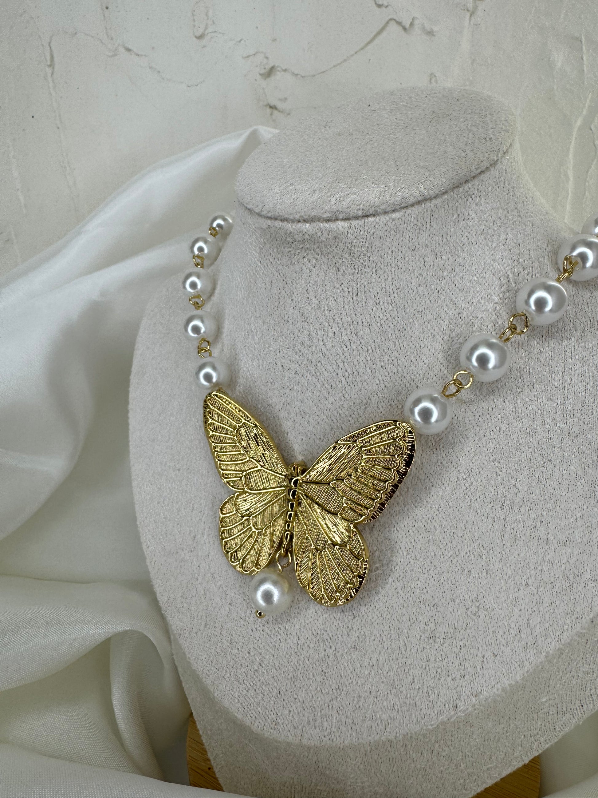 Ένα κολιέ που αποπνέει θηλυκότητα και χάρη. Οι πέρλες χαρίζουν διαχρονική κομψότητα, ενώ η χρυσή πεταλούδα στο κέντρο αναδεικνύεται ως το απόλυτο highlight του σχεδιασμού, απογειώνοντας το κόσμημα με μία αίσθηση ελευθερίας και ρομαντισμού. Ιδανικό για να φωτίσει το ντεκολτέ σε κάθε περίσταση.
