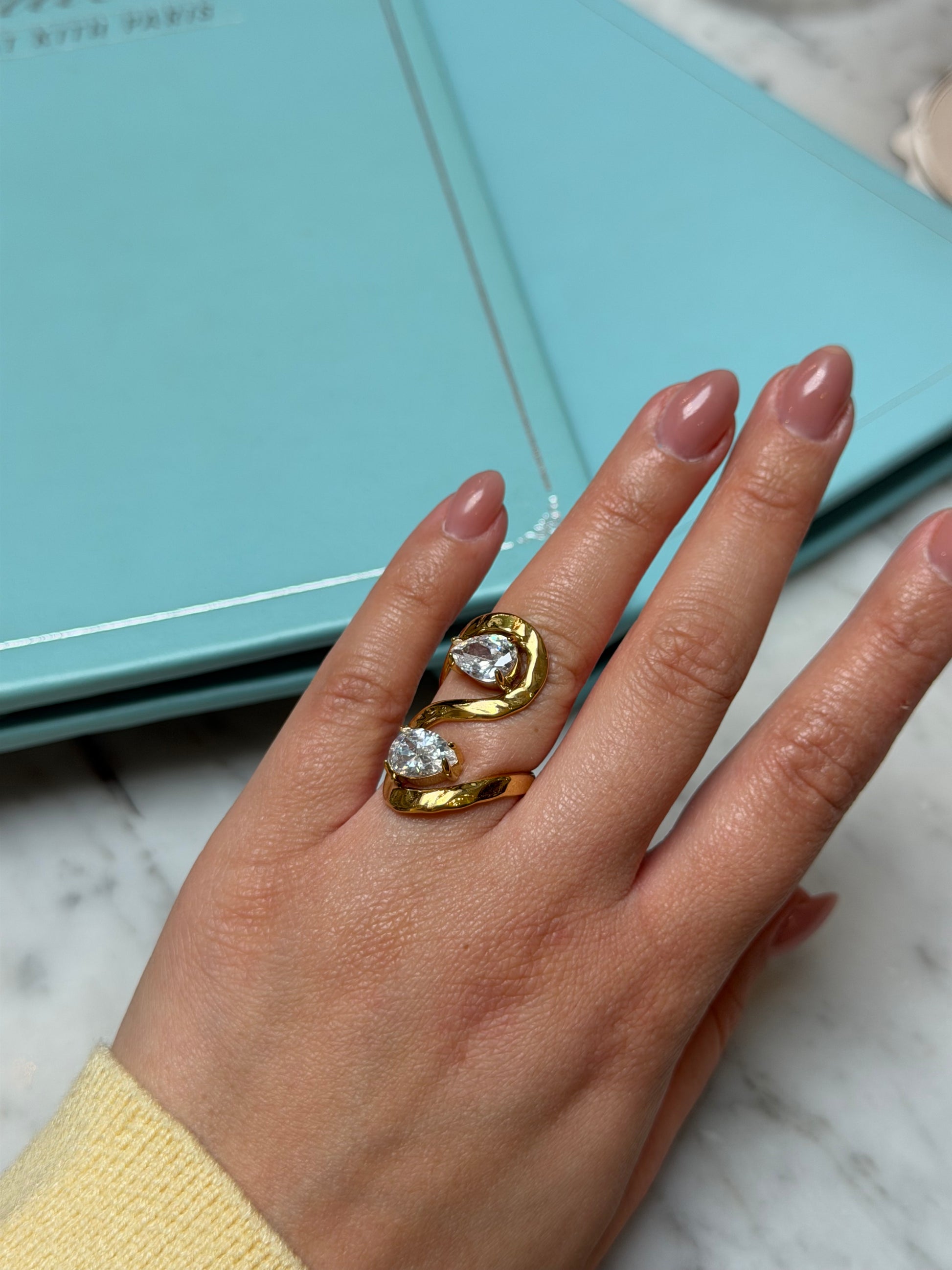 Ένα ιδιαίτερο δαχτυλίδι με μοντέρνο και εντυπωσιακό σχεδιασμό που ξεχωρίζει αμέσως. Οι δύο λαμπερές πέτρες αγκαλιάζονται από το χρυσό μεταλλικό σχήμα, δημιουργώντας ένα κομψό και δυναμικό αποτέλεσμα που τραβάει τα βλέμματα.