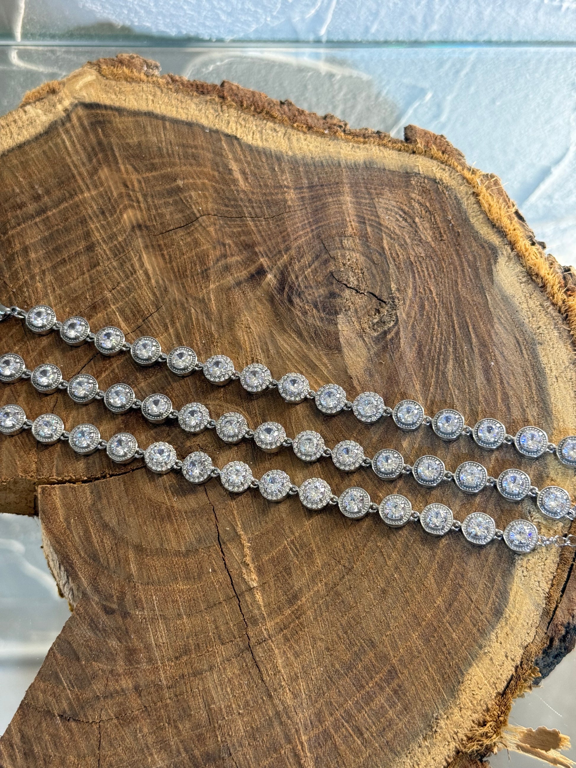Ένα βραχιόλι που ακτινοβολεί πολυτέλεια και λάμψη. Οι στρογγυλές πέτρες, τοποθετημένες σε ατσάλινη ασημί βάση, δημιουργούν την αίσθηση ενός ατέρμονου κύκλου φωτός. Ιδανικό για εμφανίσεις που απαιτούν κομψότητα και λάμψη υψηλής αισθητικής.