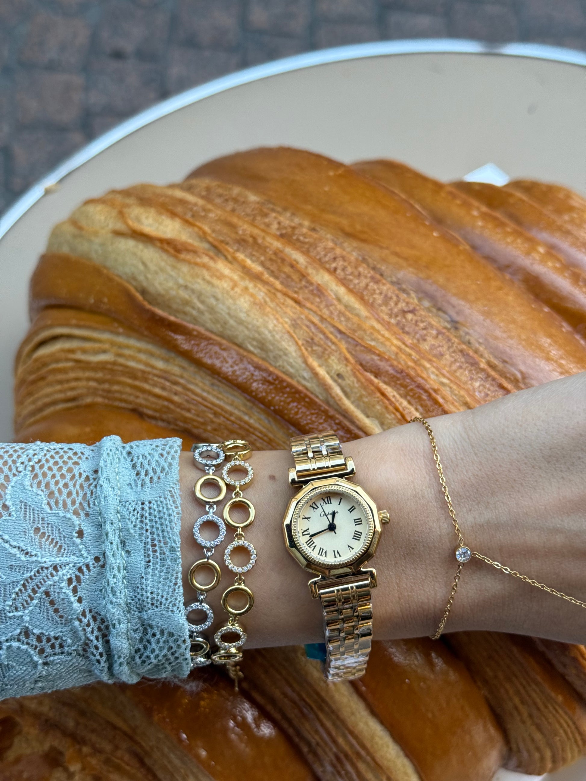 Με χρυσό μπρασελέ από stainless steel, στρογγυλό καντράν και ρωμαϊκούς αριθμούς, αποπνέει την κλασική φινέτσα που ξεπερνά τις τάσεις της μόδας και γίνεται σύμβολο διαχρονικότητας.