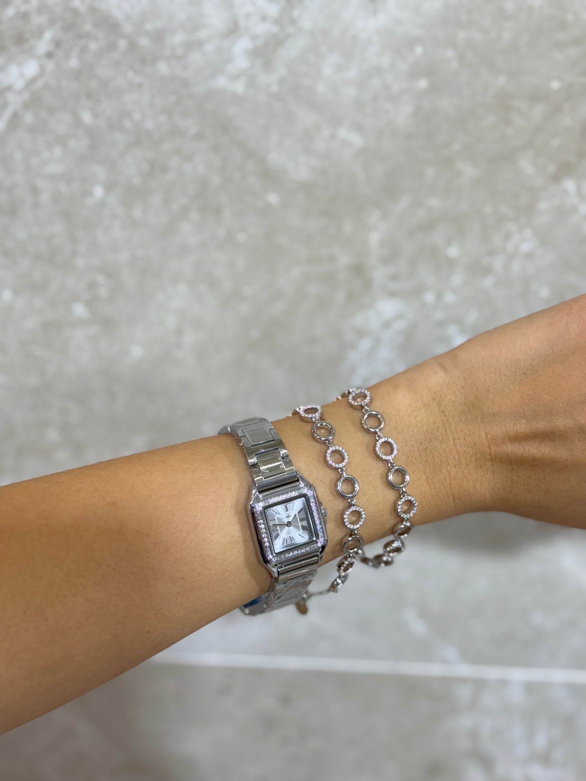 Ένα βραχιόλι εμπνευσμένο από τη νυχτερινή λάμψη του φεγγαριού. Οι κυκλικοί κρίκοι δημιουργούν μία αρμονική κίνηση στον καρπό, αναδεικνύοντας τη διαχρονική κομψότητα του ασημιού. Ιδανικό για να φορεθεί μόνο του ή σε layering με άλλα κοσμήματα.