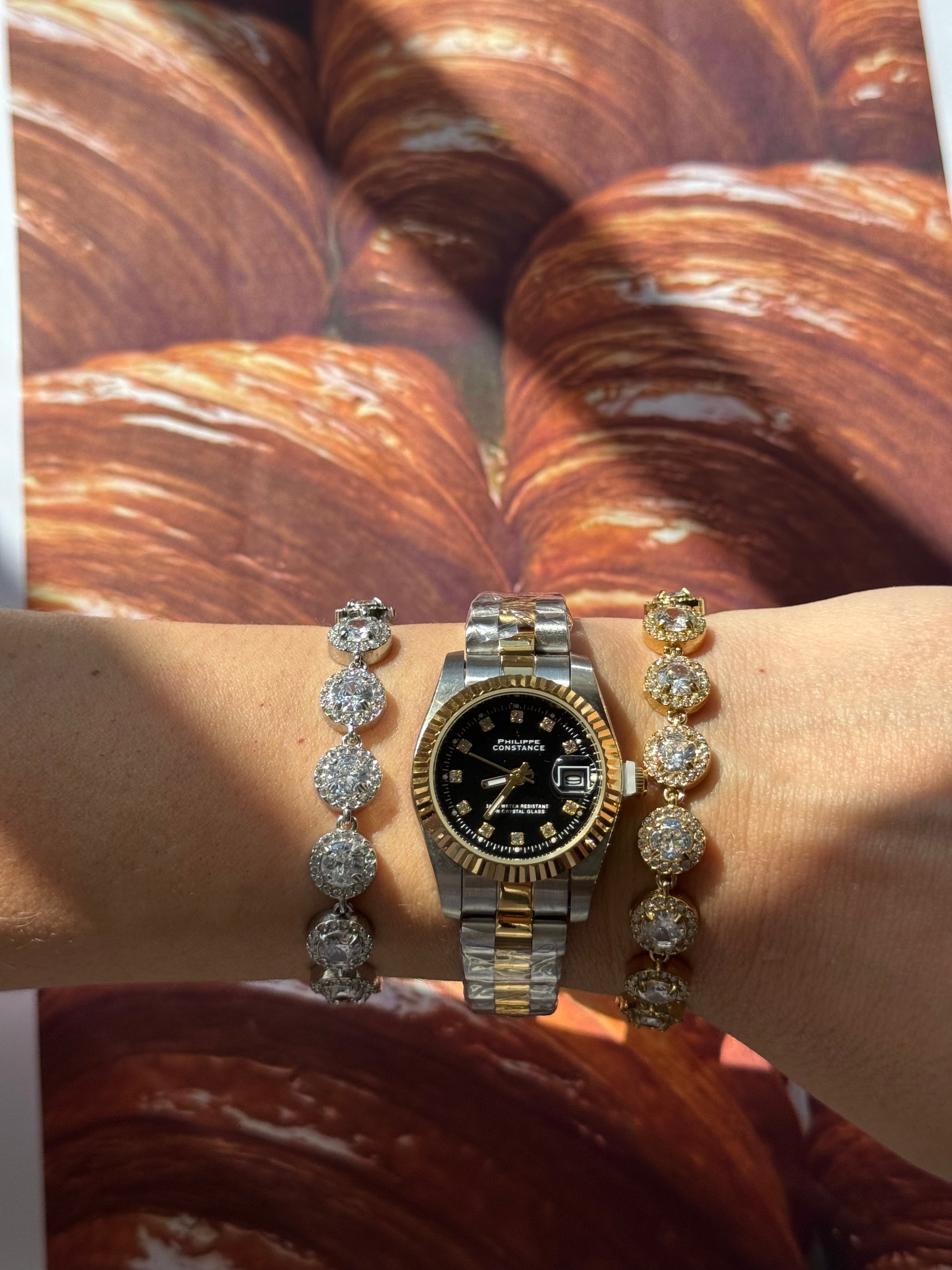 Ένα ρολόι εμπνευσμένο από τη νυχτερινή ατμόσφαιρα του Παρισιού. Το μαύρο καντράν με λαμπερές λεπτομέρειες και το κομψό μπρασελέ διχρωμίας δημιουργούν ένα αποτέλεσμα γεμάτο μυστήριο και φινέτσα. Το PARIS NOCTURNE είναι το απόλυτο ρολόι για γυναίκες που θέλουν να συνδυάζουν την κομψότητα με τη δυναμική παρουσία.