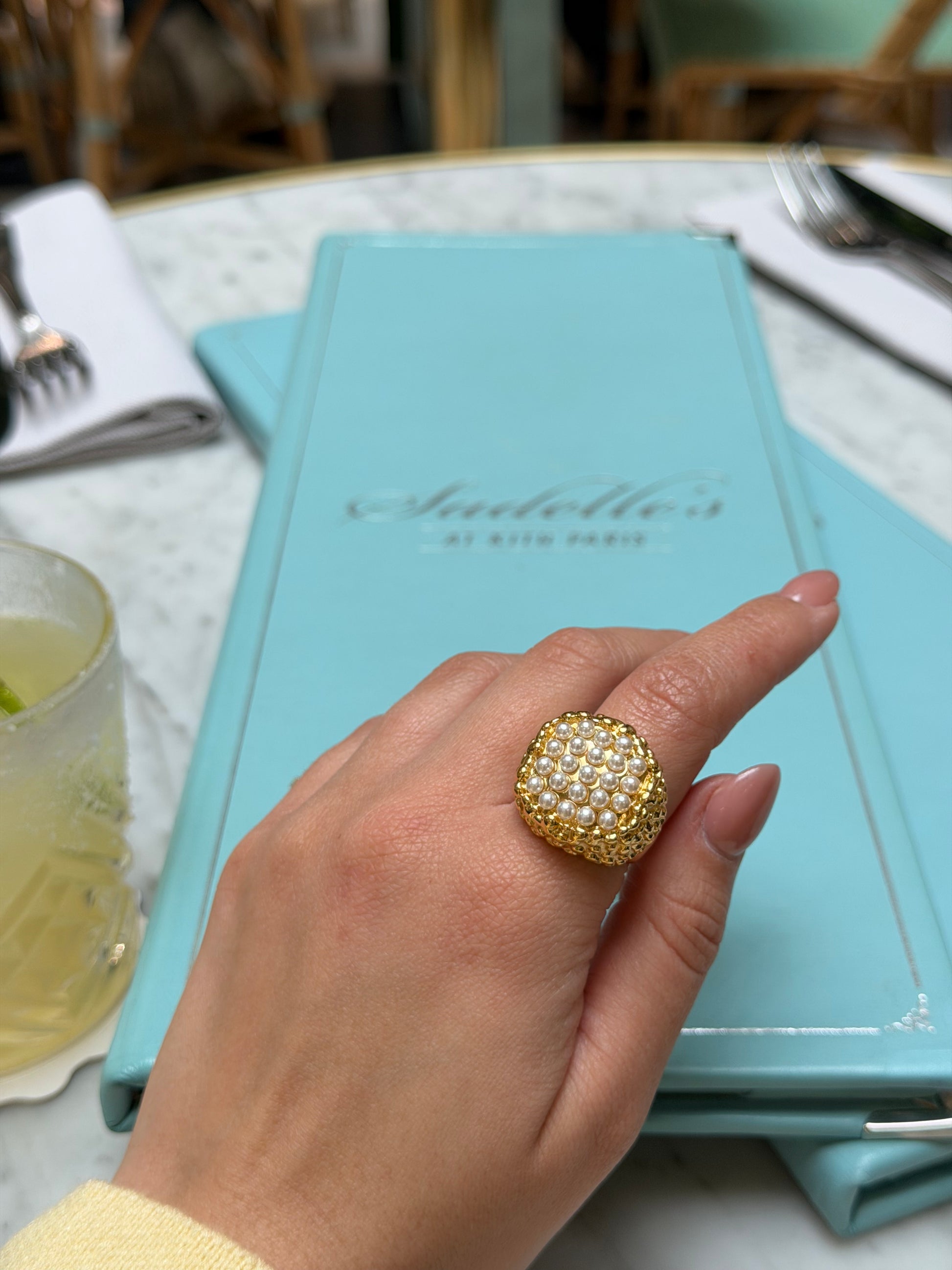Ένα εντυπωσιακό δαχτυλίδι που αποπνέει κομψότητα και διακριτική πολυτέλεια. Η επιφάνειά του είναι διακοσμημένη με μικρές περλέ λεπτομέρειες που δημιουργούν ένα λαμπερό και ιδιαίτερα elegant αποτέλεσμα, χαρίζοντας στο κόσμημα μοναδικό χαρακτήρα.