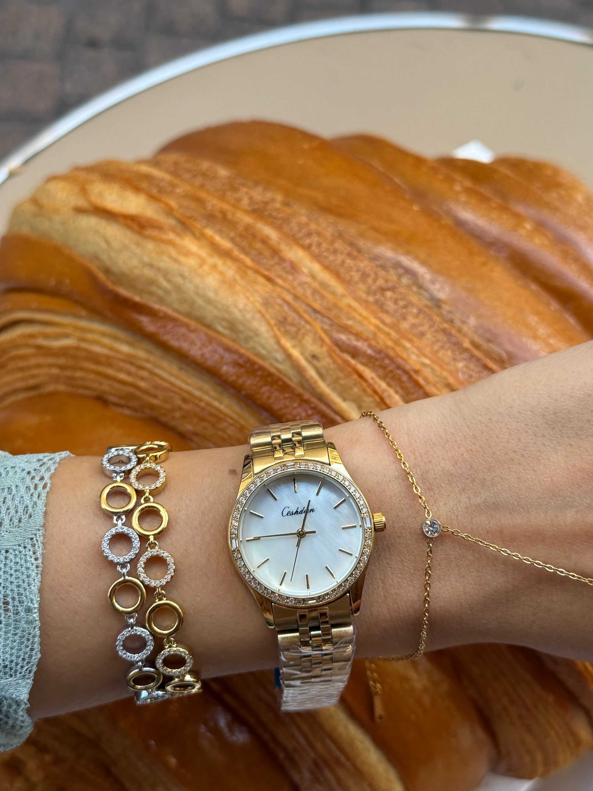 Με χρυσό μπρασελέ από stainless steel, λευκό καντράν mother of pearl και στεφάνι διακοσμημένο με λαμπερούς κρυστάλλους, αποπνέει την απόλυτη αίσθηση πολυτέλειας και κομψότητας.