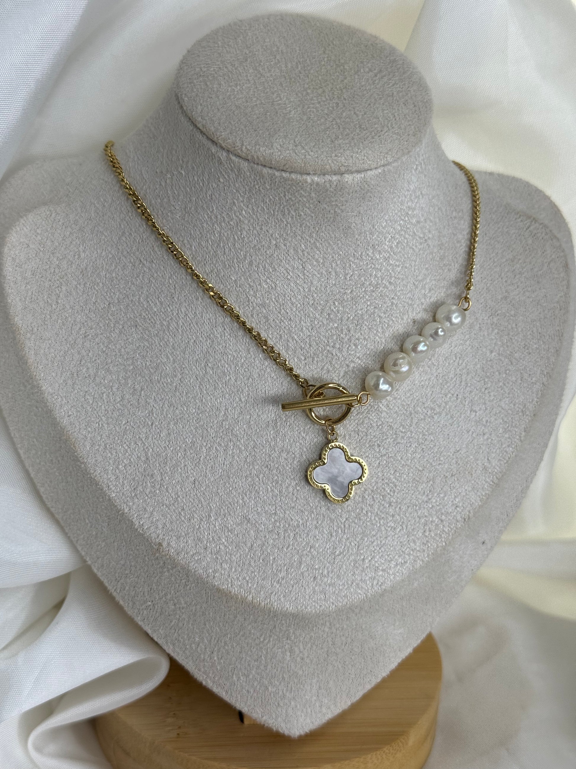 Το PEARL ÉCLAT είναι ένα μοναδικό κολιέ που συνδυάζει τη διαχρονική κομψότητα των μαργαριταριών με τη σύγχρονη πολυτέλεια του χρυσού. Η αλυσίδα από stainless steel συνδέεται αρμονικά με μια σειρά λαμπερών μαργαριταριών και ένα γοητευτικό charm σε σχήμα τετράφυλλου, που συμβολίζει την τύχη και την ισορροπία. Ένα κόσμημα που αποπνέει φως, θηλυκότητα και αυτοπεποίθηση.