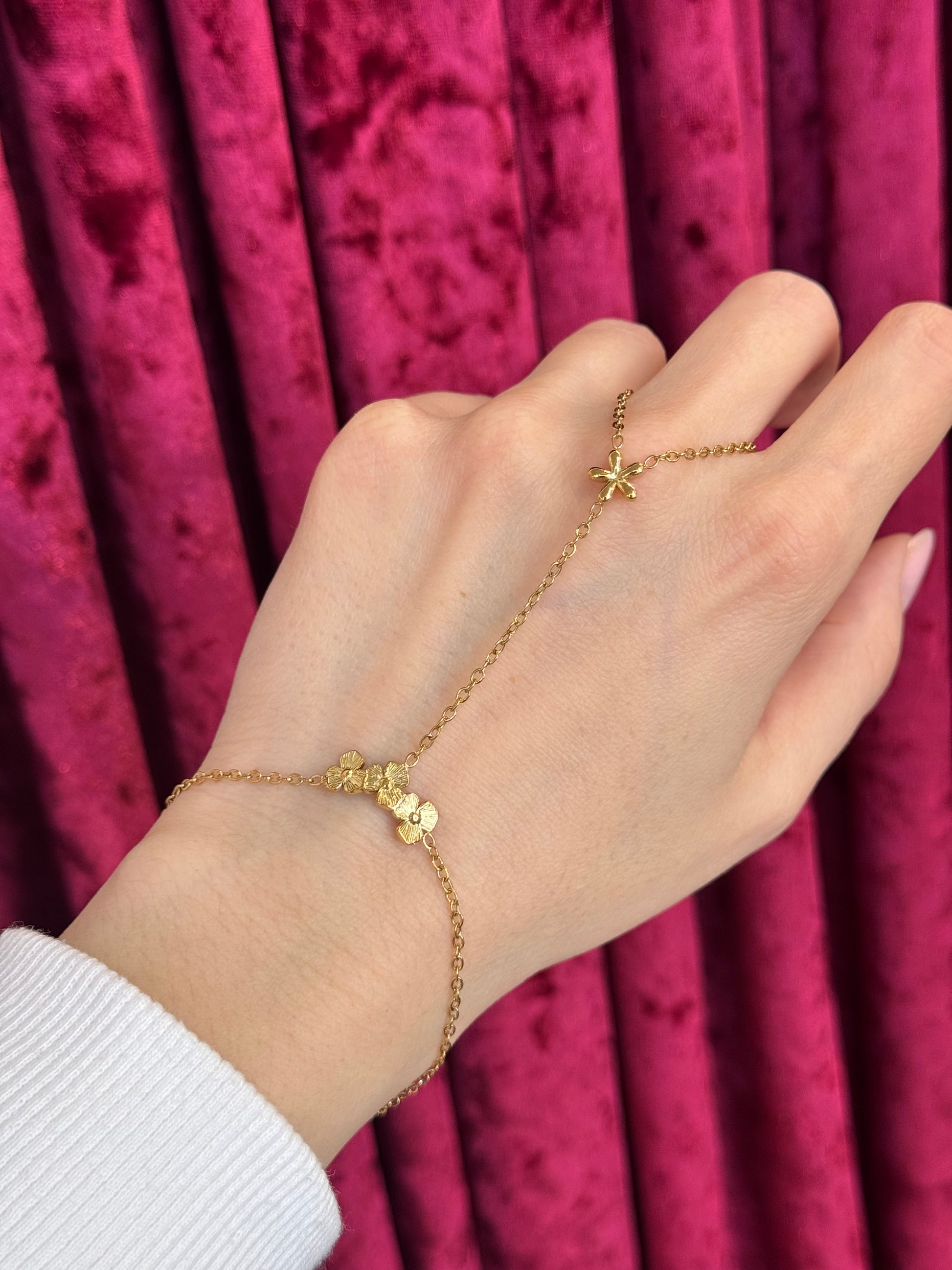 Το Petals & Posies Hand Chain είναι ένα κόσμημα που εξυμνεί τη φύση με τον πιο κομψό τρόπο. Κατασκευασμένο από Stainless Steel, διαθέτει μια λεπτή αλυσίδα διακοσμημένη με τρία μικρά, ανάγλυφα λουλούδια στον καρπό και ένα ντελικάτο άνθος που στολίζει το δάχτυλο.