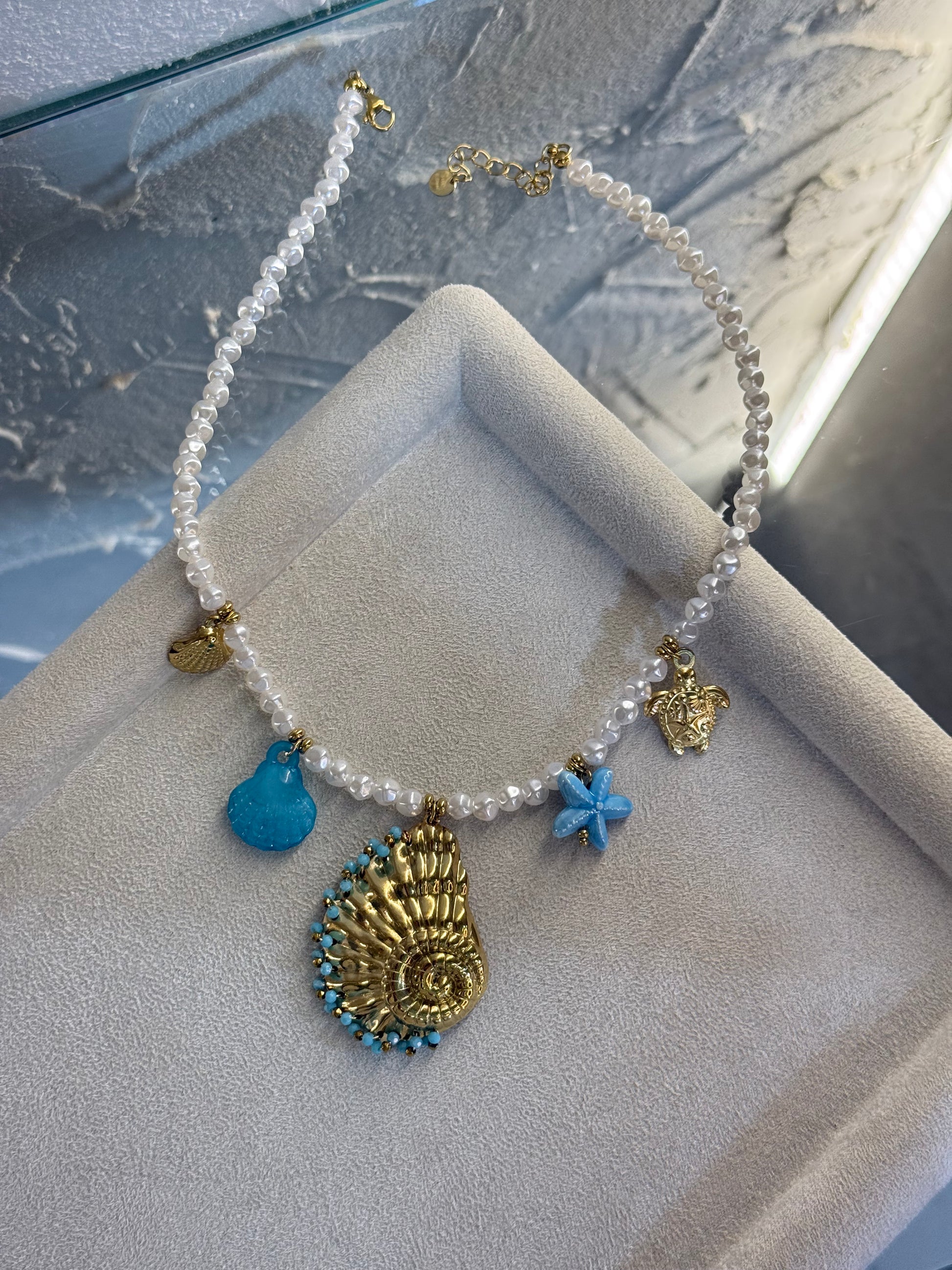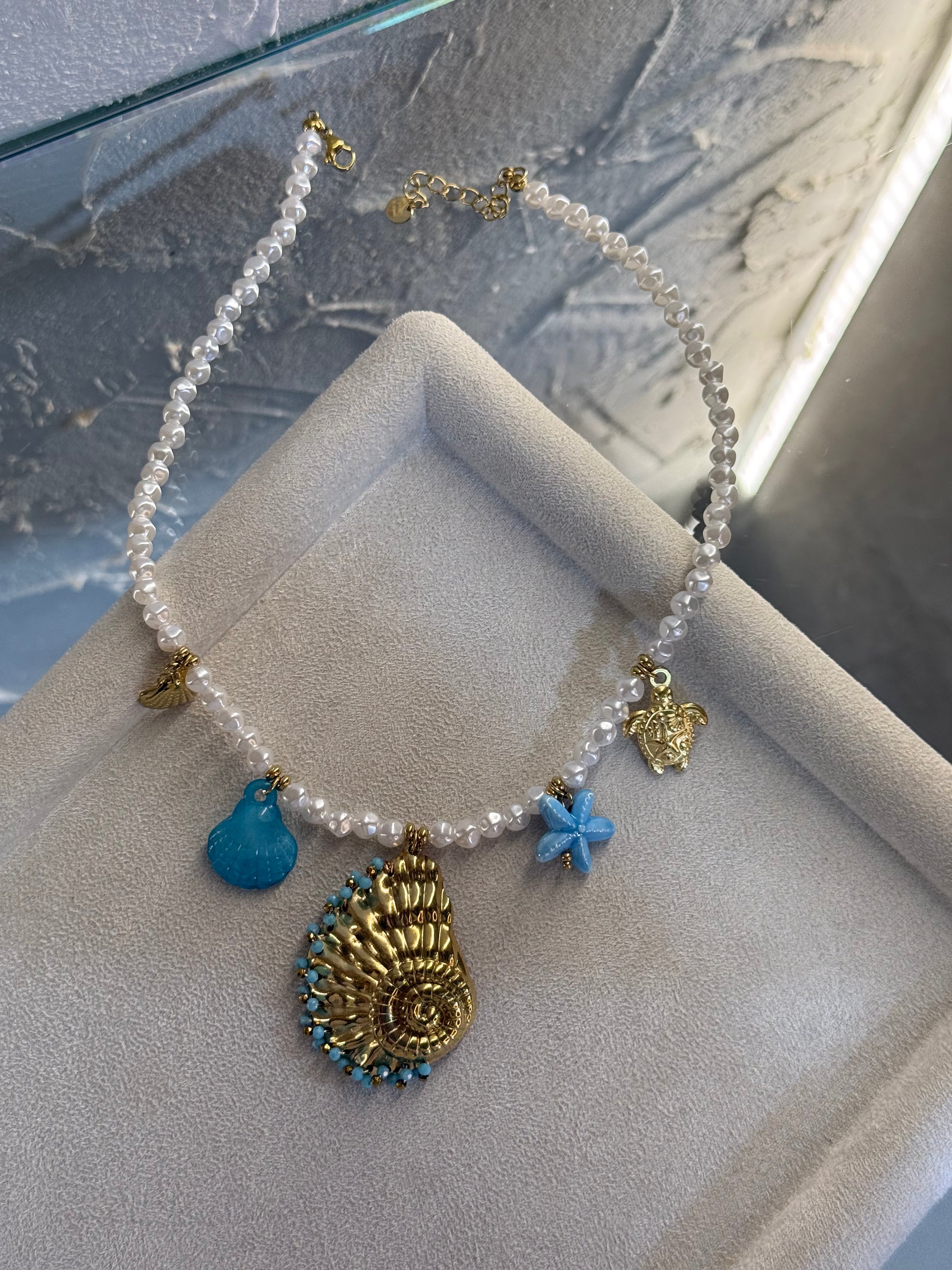 Ζήσε το καλοκαίρι σου σαν πραγματική γοργόνα με το εντυπωσιακό κολιέ "Ariel" – ένα μοναδικό κομμάτι δικής μας παραγωγής, σχεδιασμένο από την ομάδα της Pnoe Studio. Ένα απόλυτο statement κόσμημα που συνδυάζει την αίγλη των λευκών περλών με μαγευτικά χρυσά και γαλάζια charms εμπνευσμένα από τον βυθό.