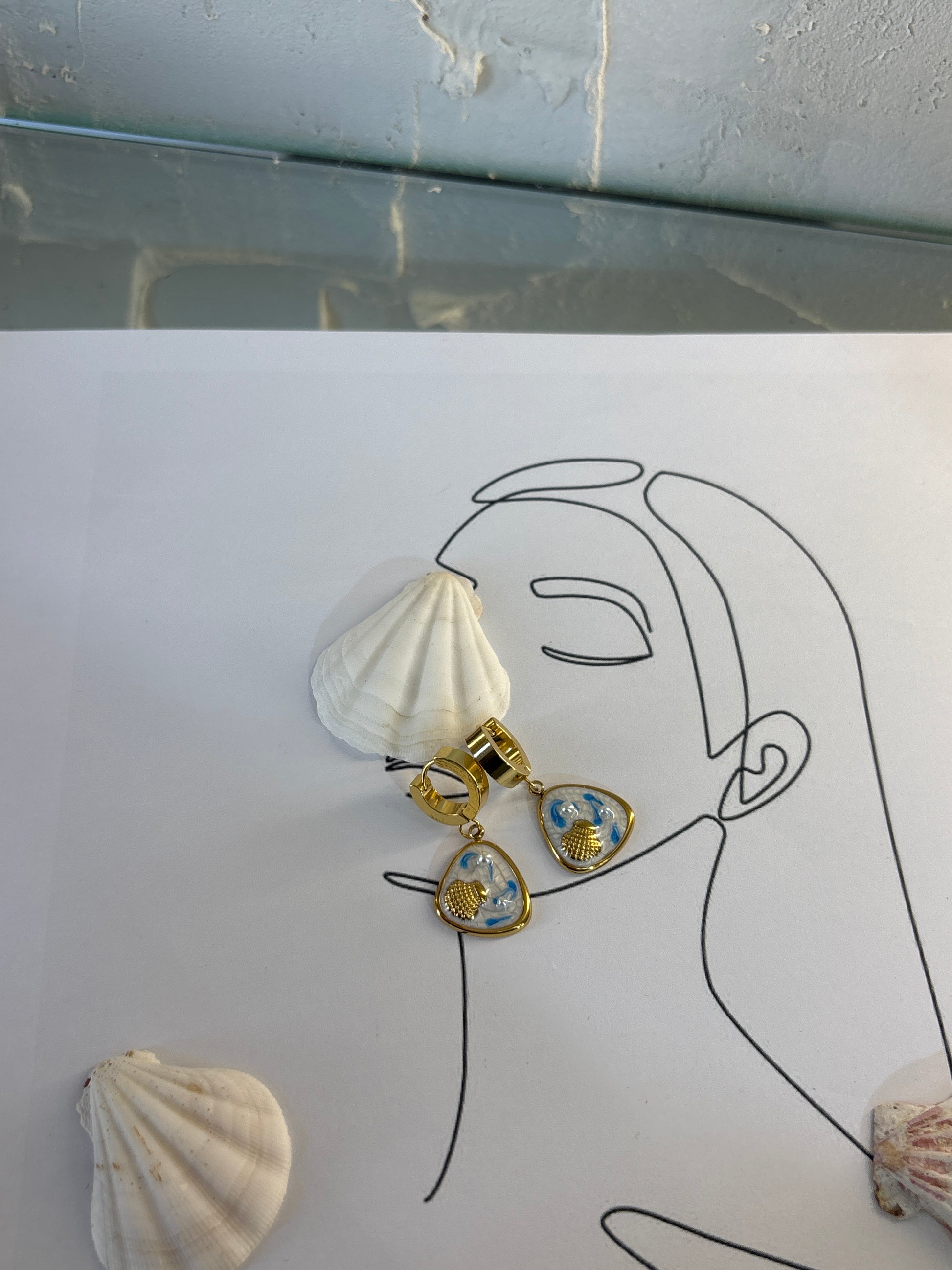 Σκουλαρίκια Μύκονος – Χρυσά Τριγωνικά με Μπλε Λεπτομέρειες και Κοχύλι