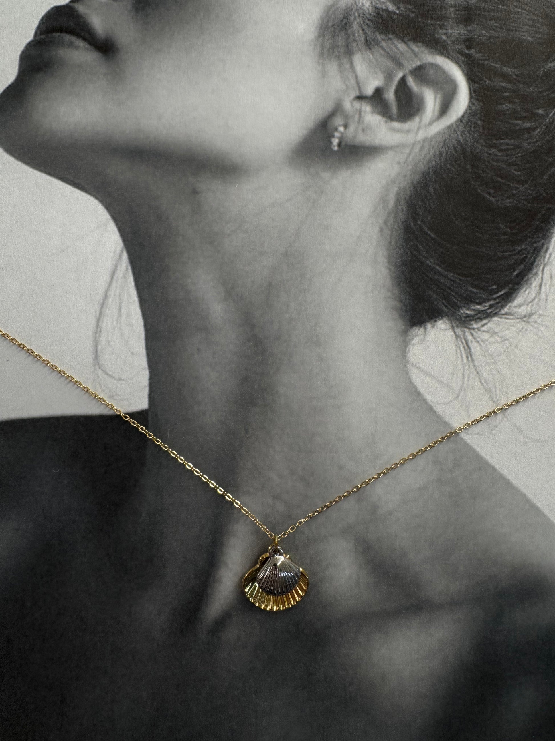 Η λεπτή χρυσή αλυσίδα φιλοξενεί ένα διπλό κοχύλι σε ασημί και χρυσό, ιδανικό για να φωτίσει κάθε σου εμφάνιση – από τη βόλτα στο νησί μέχρι τη νυχτερινή έξοδο.
