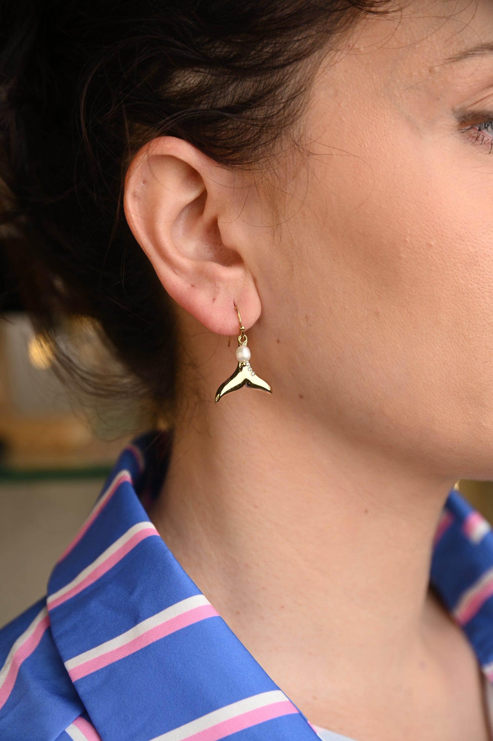 Εμπνευσμένο από τη θάλασσα, αυτό το σκουλαρίκι από ανοξείδωτο ατσάλι συνδυάζει χρυσή ουρά φάλαινας, λευκή πέρλα και λαμπερές λεπτομέρειες. Ιδανικό για καλοκαιρινές εμφανίσεις με στυλ και κομψότητα.