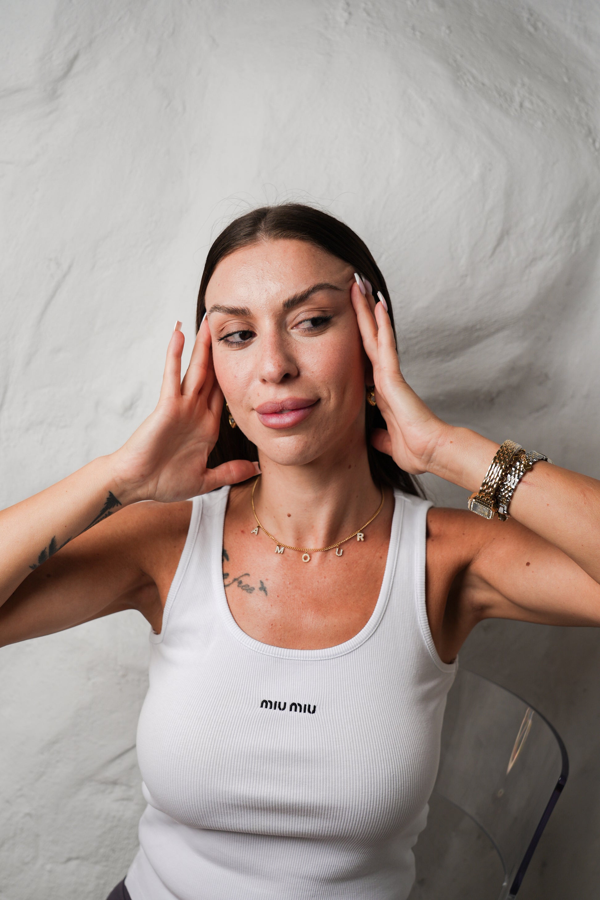 Ένα κολιέ που μιλάει τη γλώσσα της αγάπης. Τα κρεμαστά γράμματα σχηματίζουν τη λέξη Amour και φωτίζουν το στήθος σου με μια παιχνιδιάρικη αλλά και ρομαντική διάθεση. Ιδανικό για να δώσεις μια τρυφερή πινελιά στις καθημερινές ή βραδινές σου εμφανίσεις.