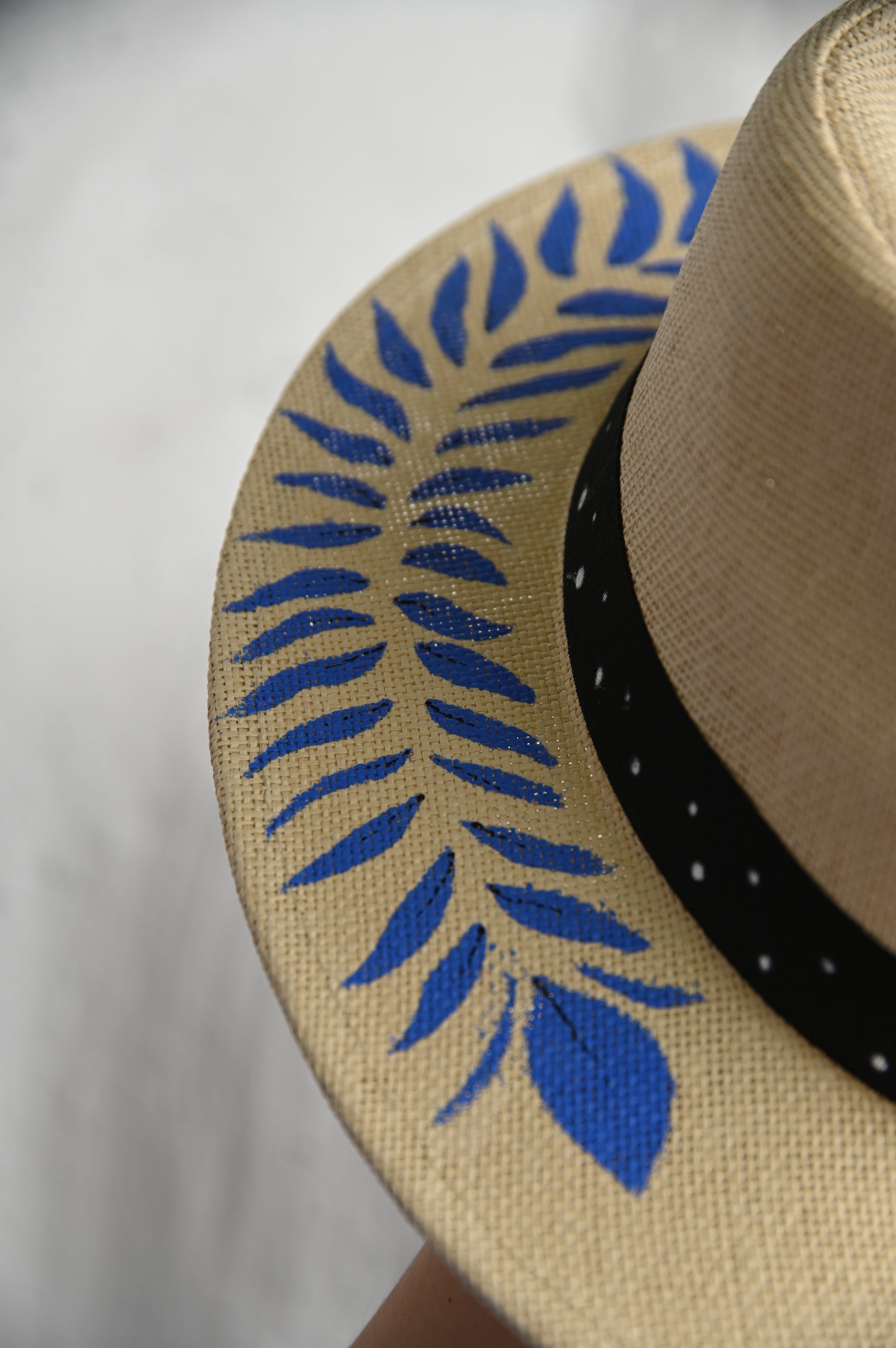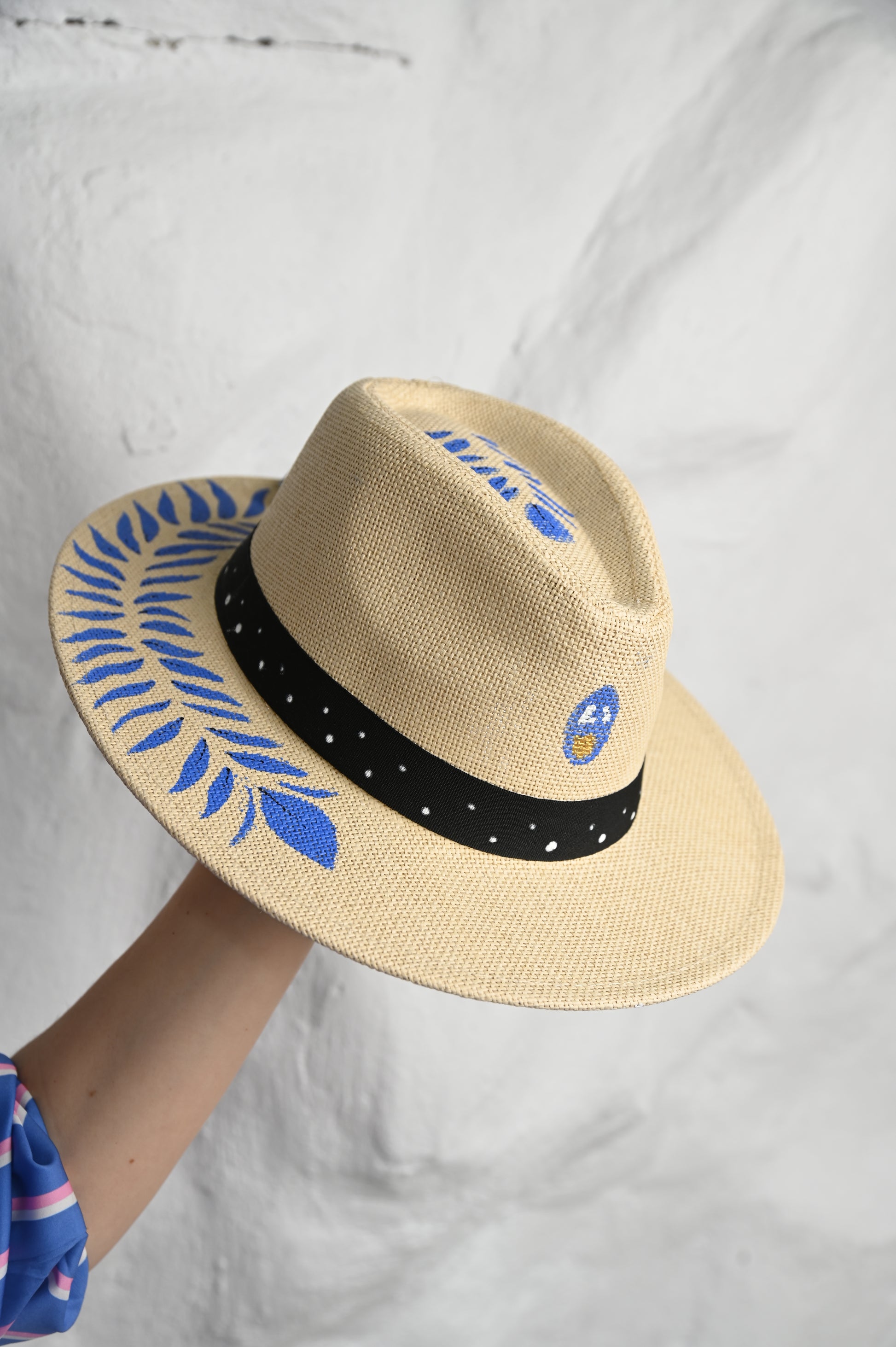 Καπέλο ψάθινο 'Oliva' σε φυσική απόχρωση με χειροποίητα ζωγραφισμένα μπλε φύλλα και φυλαχτό. Ένα καπέλο που ενώνει τη φύση με την ελληνική παράδοση, ιδανικό για καλοκαιρινές εξορμήσεις.