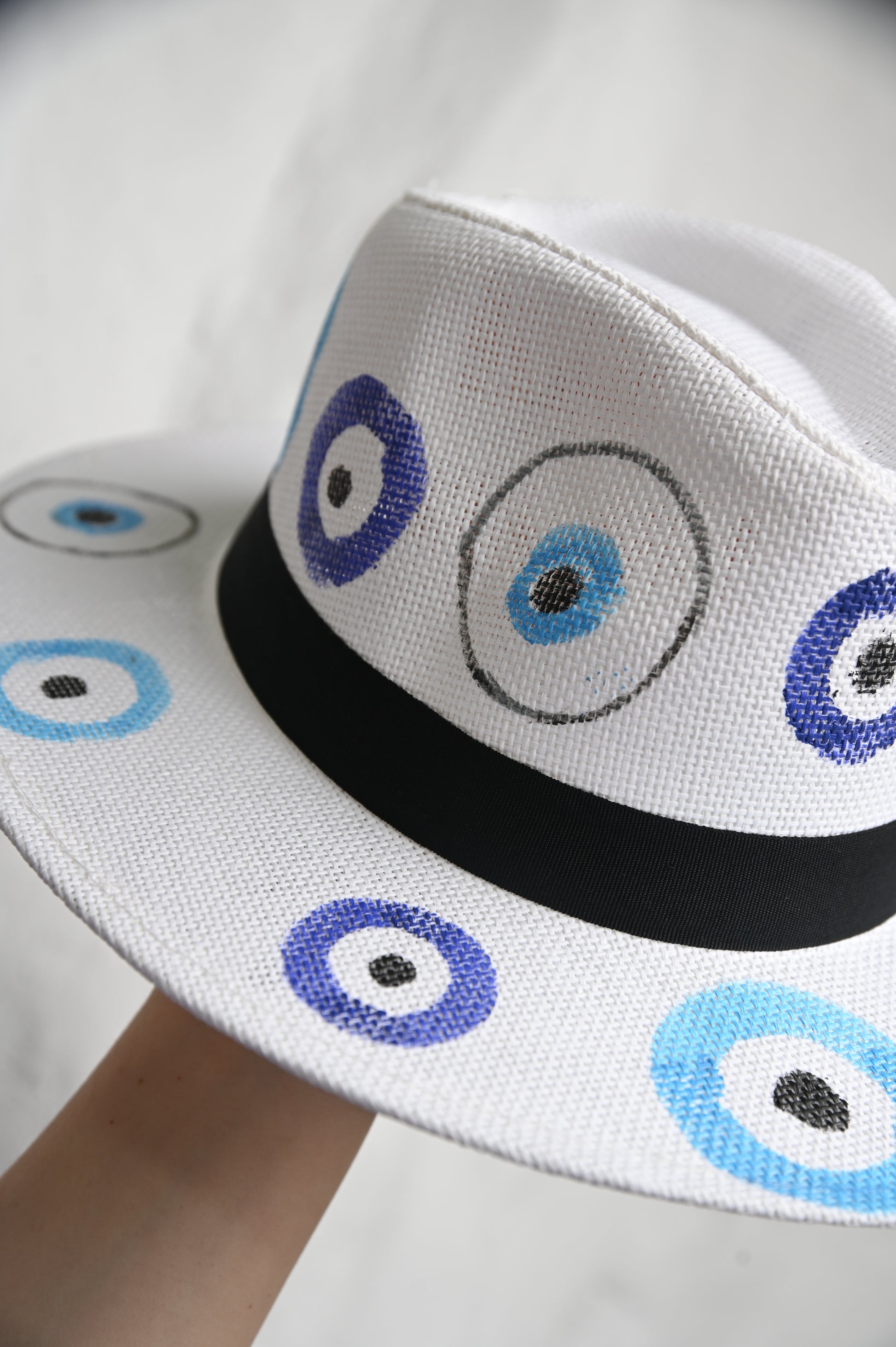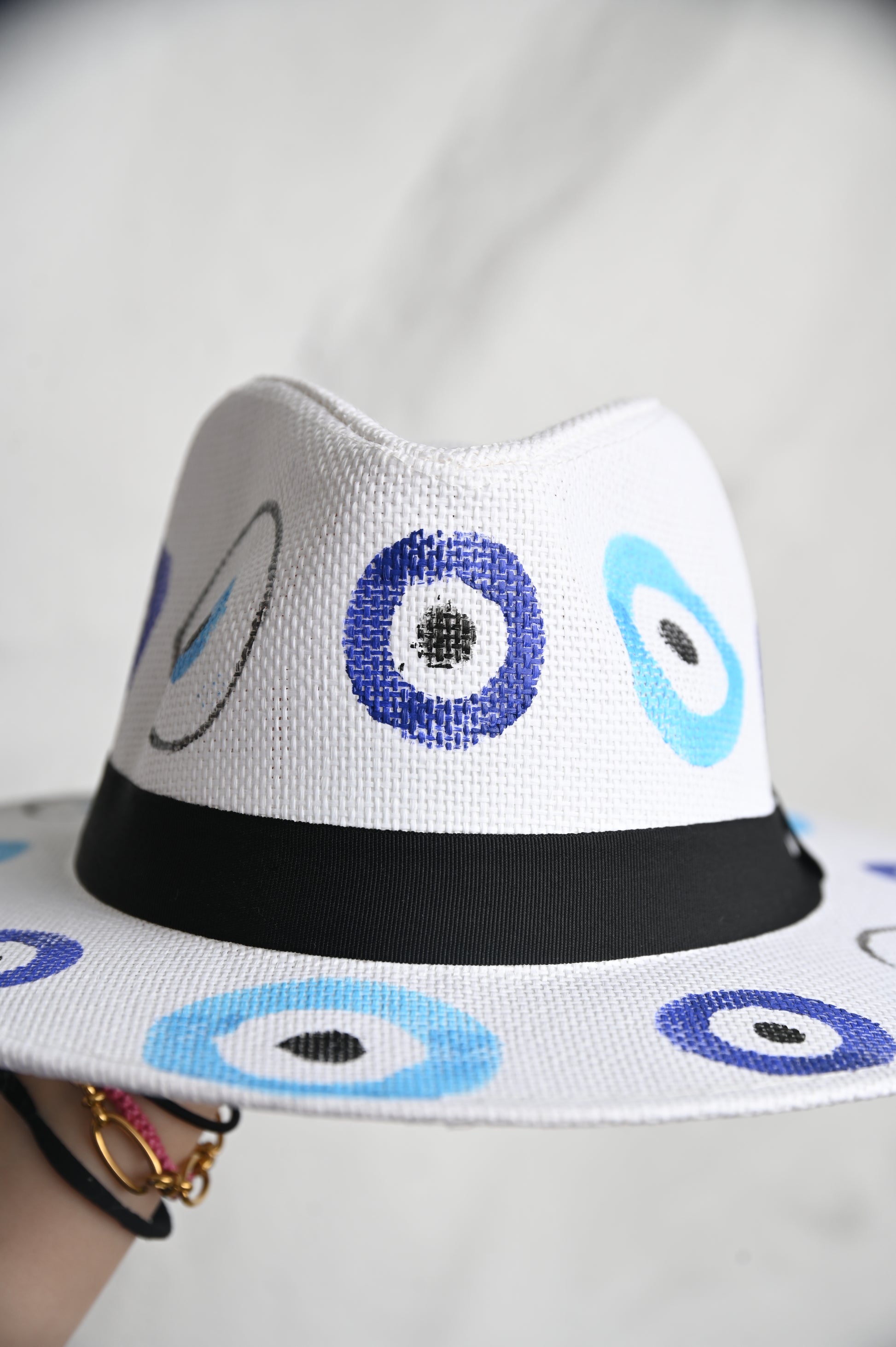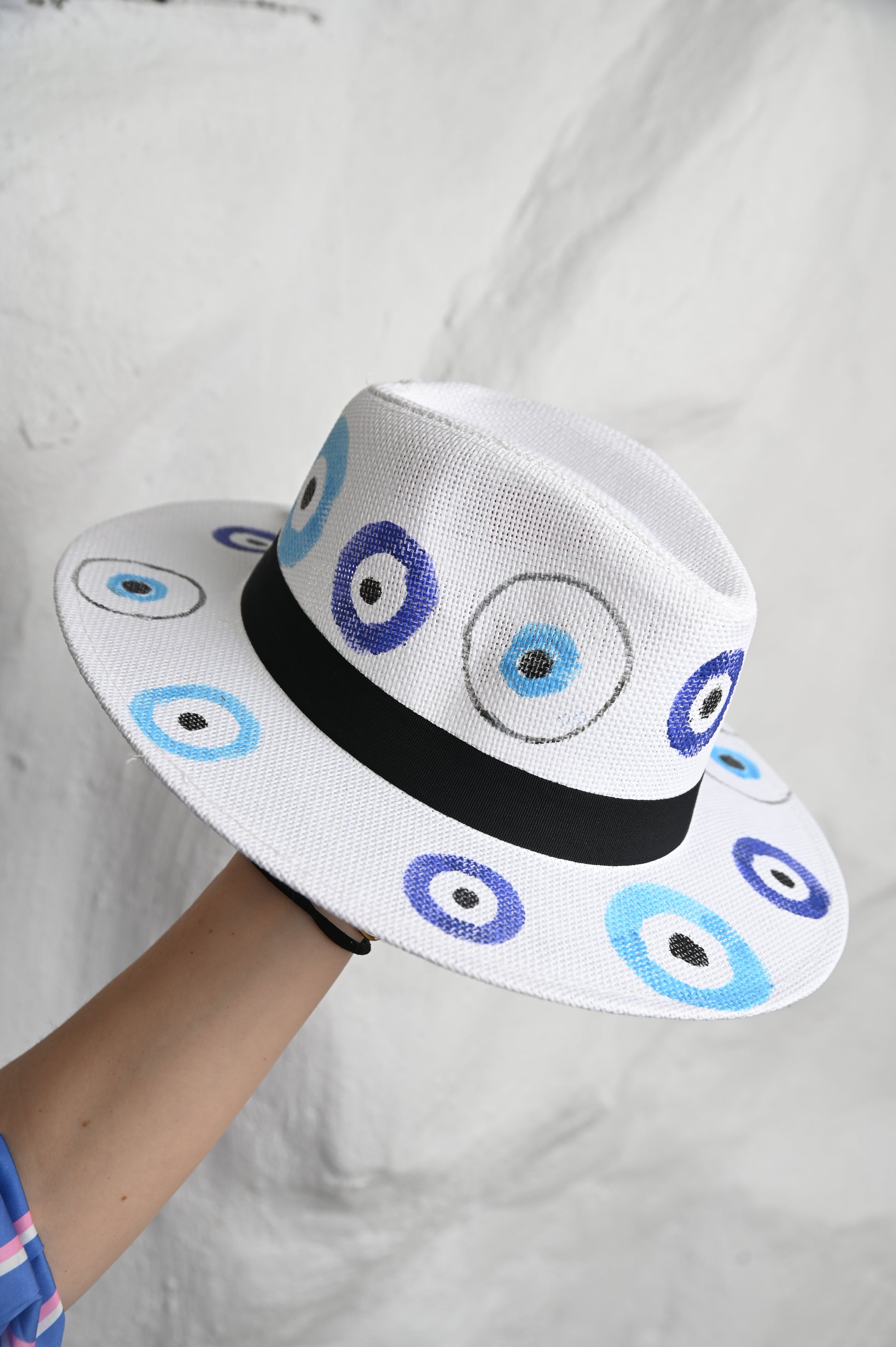 Καπέλο ψάθινο 'Cycladia' διακοσμημένο με μοτίβα ματιού σε αποχρώσεις του μπλε. Ιδανικό για όσους αγαπούν το κυκλαδίτικο στυλ και τα παραδοσιακά σύμβολα προστασίας.