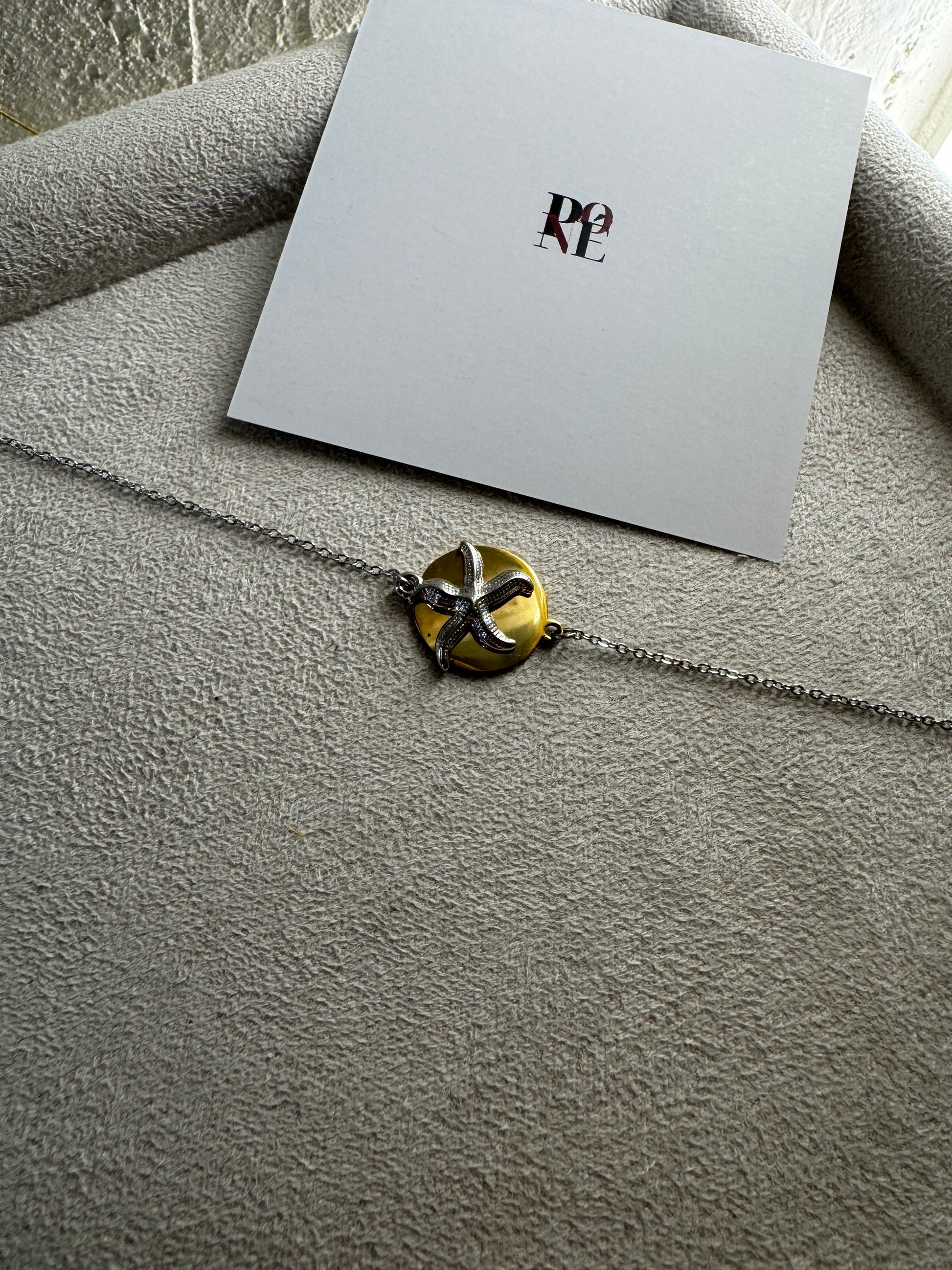 Ένα βραχιόλι εμπνευσμένο από τη μαγεία του βυθού και τη λάμψη του καλοκαιρινού ήλιου. Ο χρυσός δίσκος αγκαλιάζεται από έναν αστραφτερό αστερία, δημιουργώντας ένα μοναδικό σύμβολο ελευθερίας και ανεμελιάς.