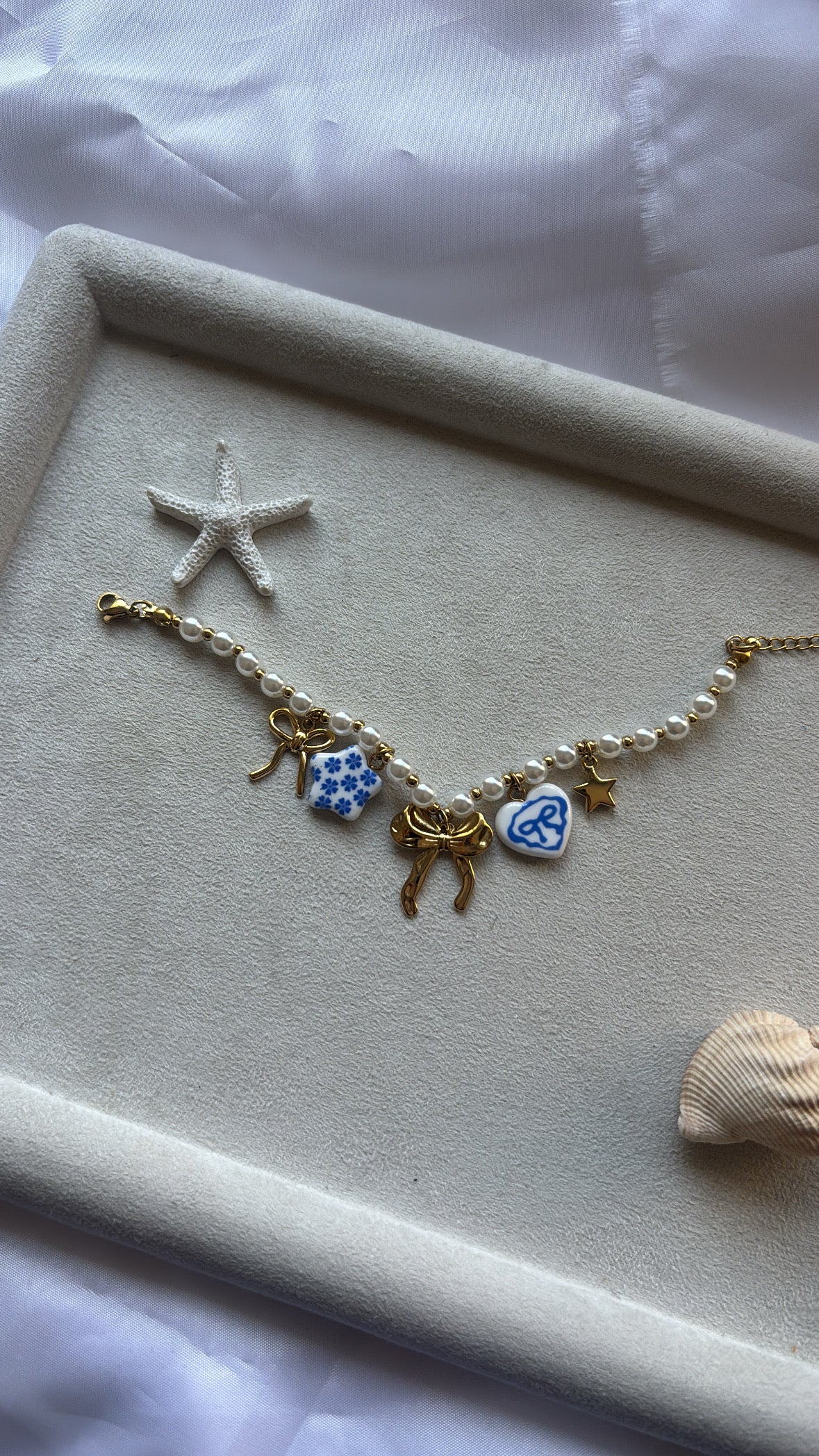 Ένα βραχιόλι που μοιάζει να βγήκε από καλοκαιρινό παραμύθι. Πέρλες, χρυσά φιογκάκια και κεραμικά charms με μοτίβα σε μπλε και λευκό — σαν να φόρεσες τις Κυκλάδες στον καρπό σου.