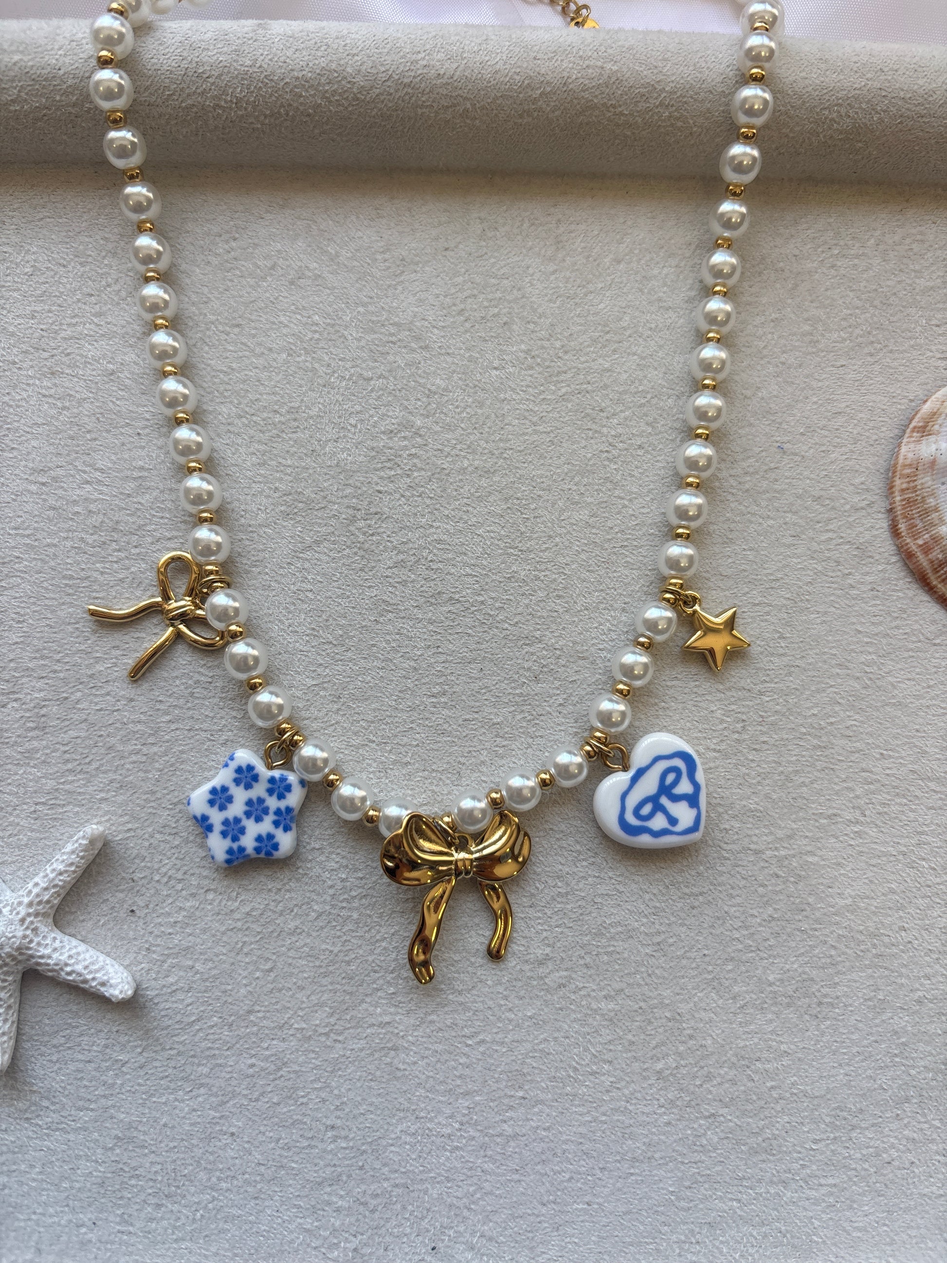 Ένα κόσμημα βγαλμένο από παραμύθι… Το Blue Belle συνδυάζει φίνα λευκά μαργαριταρένια beads με χρυσές λεπτομέρειες και παιχνιδιάρικα charms: φιόγκο, αστεράκι, λουλουδένιο αστέρι και καρδιά ζωγραφισμένη στο χέρι. Ένα κολιέ που ξεχωρίζει και διηγείται τη δική του ιστορία.