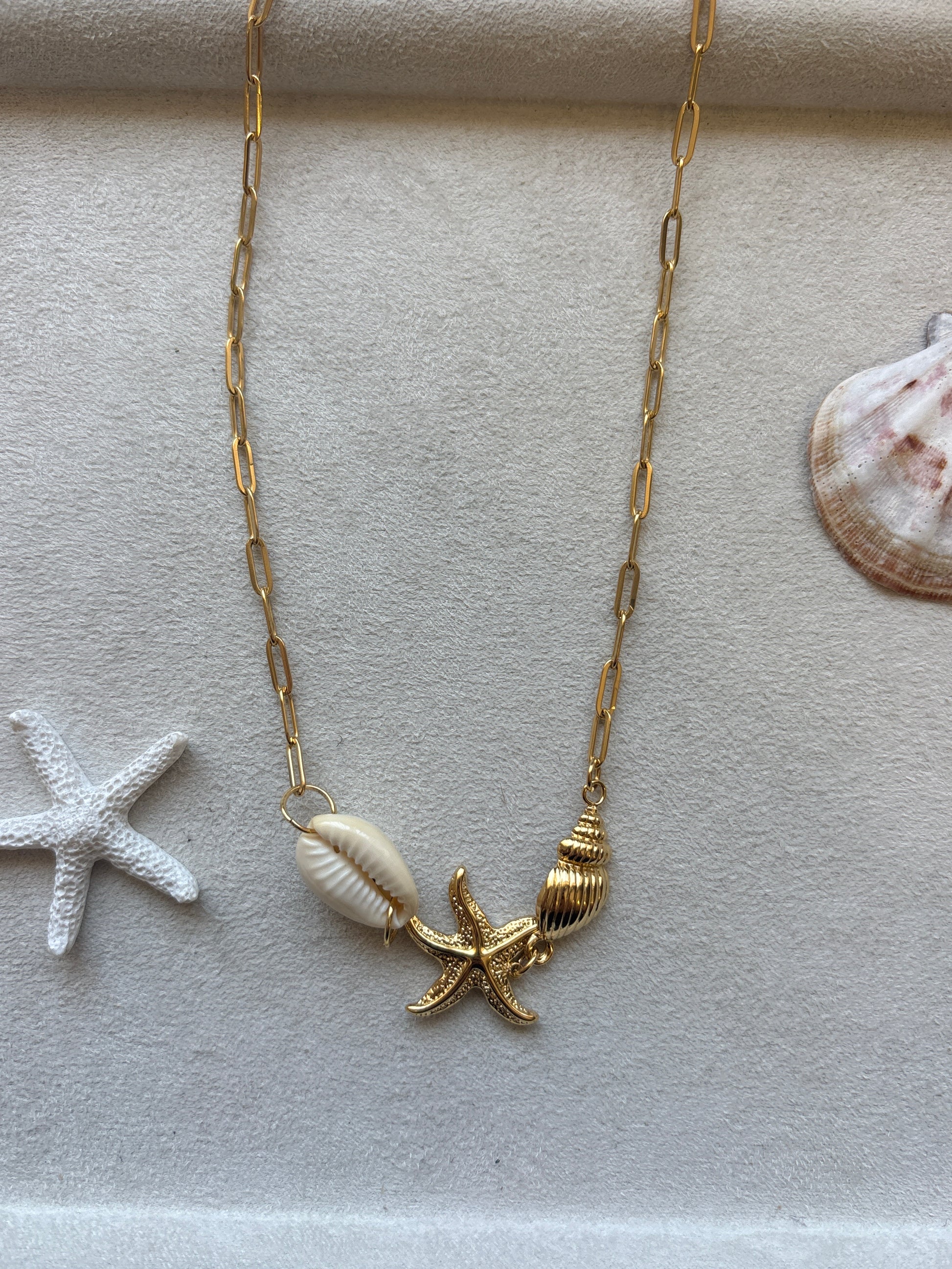 Το Coastal Muse είναι ένας ύμνος στη φυσική ομορφιά της θάλασσας. Με εντυπωσιακή χρυσή αλυσίδα και τρία λαμπερά στοιχεία – κοχύλι cowrie, χρυσό αστερία και σπιράλ κέλυφος – αυτό το κολιέ είναι η απόλυτη καλοκαιρινή δήλωση.