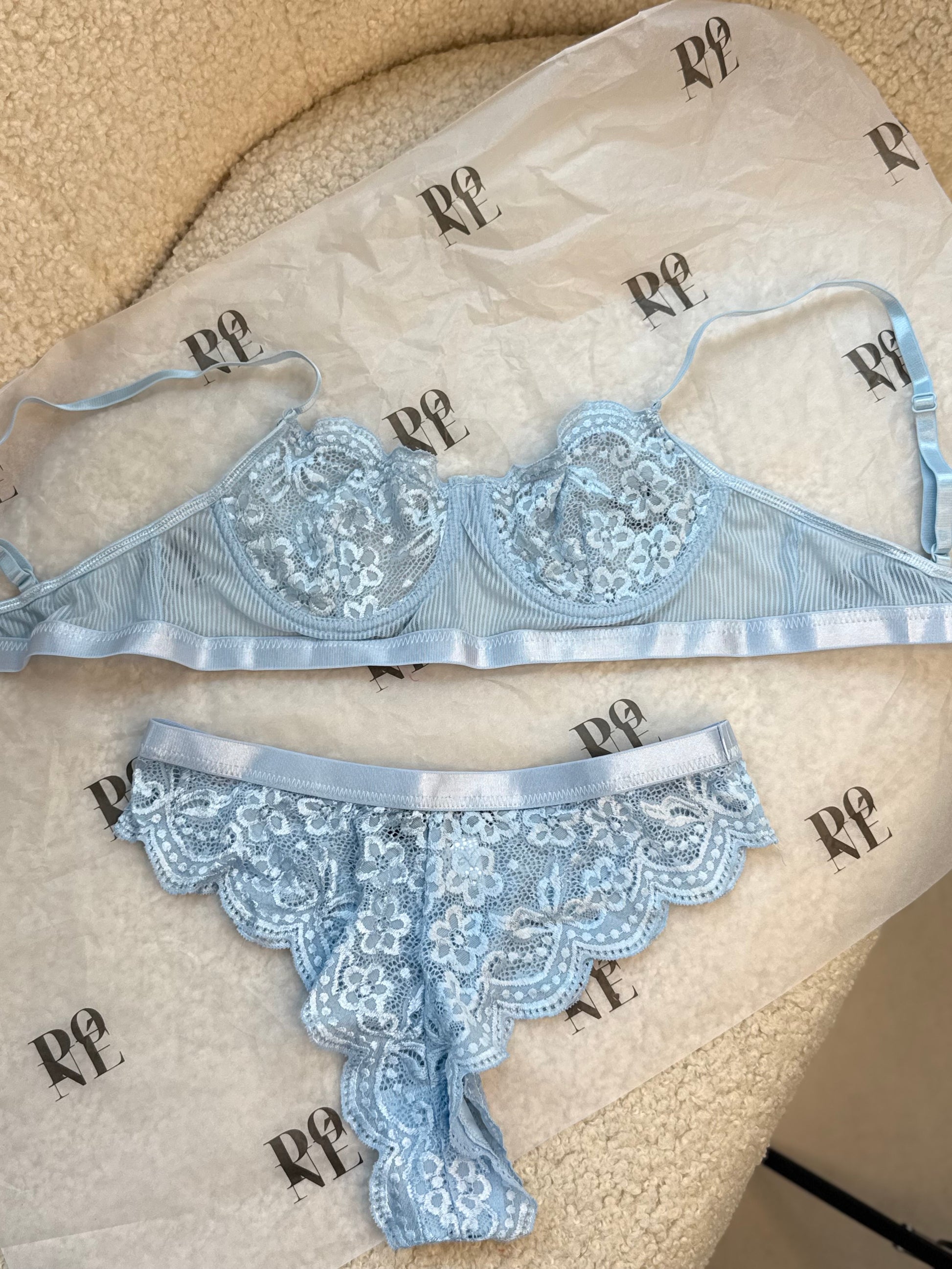 Με icy blue satin και κεντημένη δαντέλα σαν παγωμένος ανθός, το σετ αυτό χαϊδεύει το σώμα σαν πολυτελής σιωπή. Είναι ήρεμο στην όψη, αλλά φλογερό στην πρόθεση.