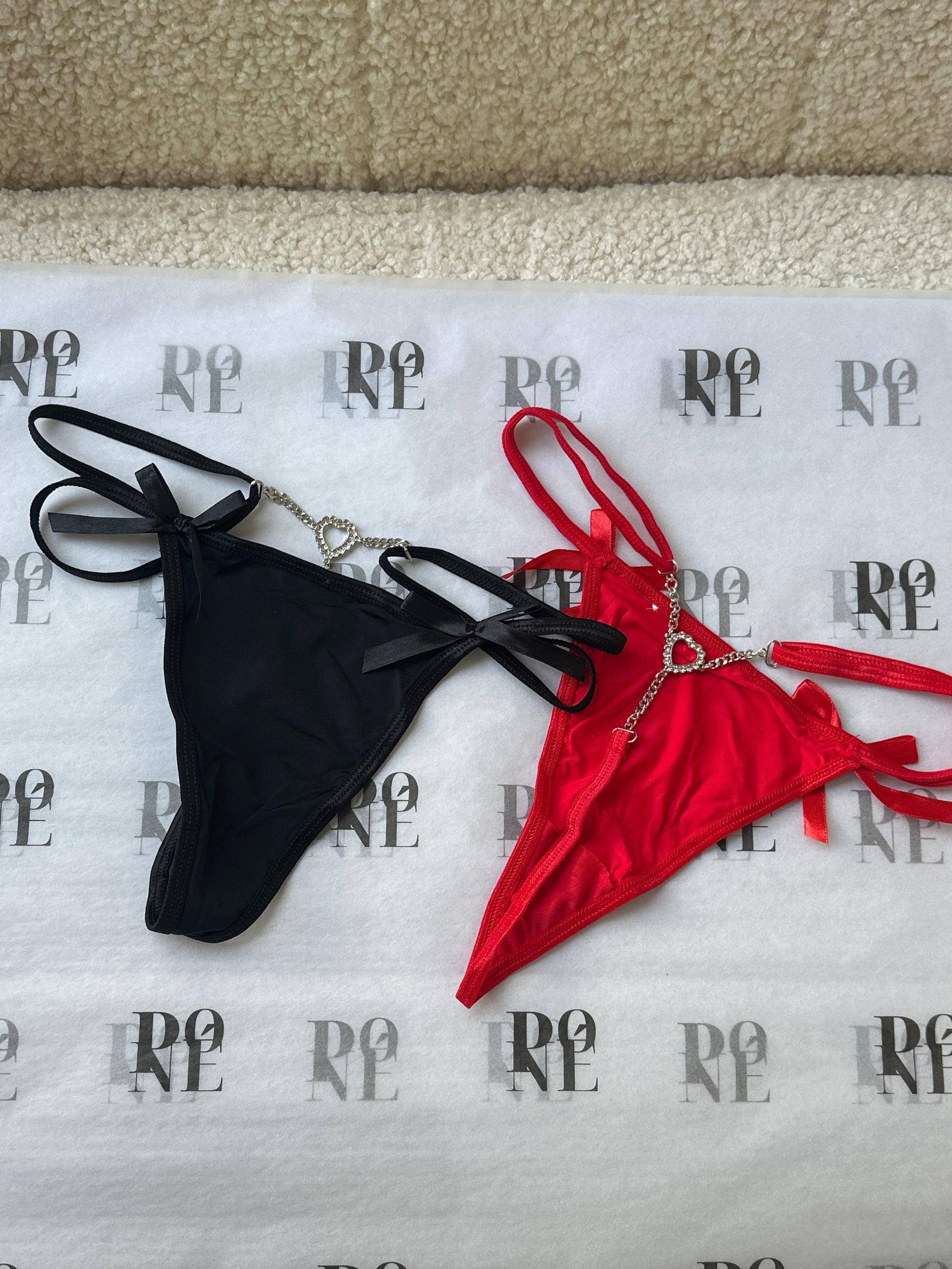 Ένα τολμηρό κομμάτι με σατέν κορδέλες στα πλάγια και κεντρικό κόσμημα σε σχήμα καρδιάς. Είναι φτιαγμένο για εκείνες που ξέρουν πότε να παίζουν και πότε να μαγεύουν.