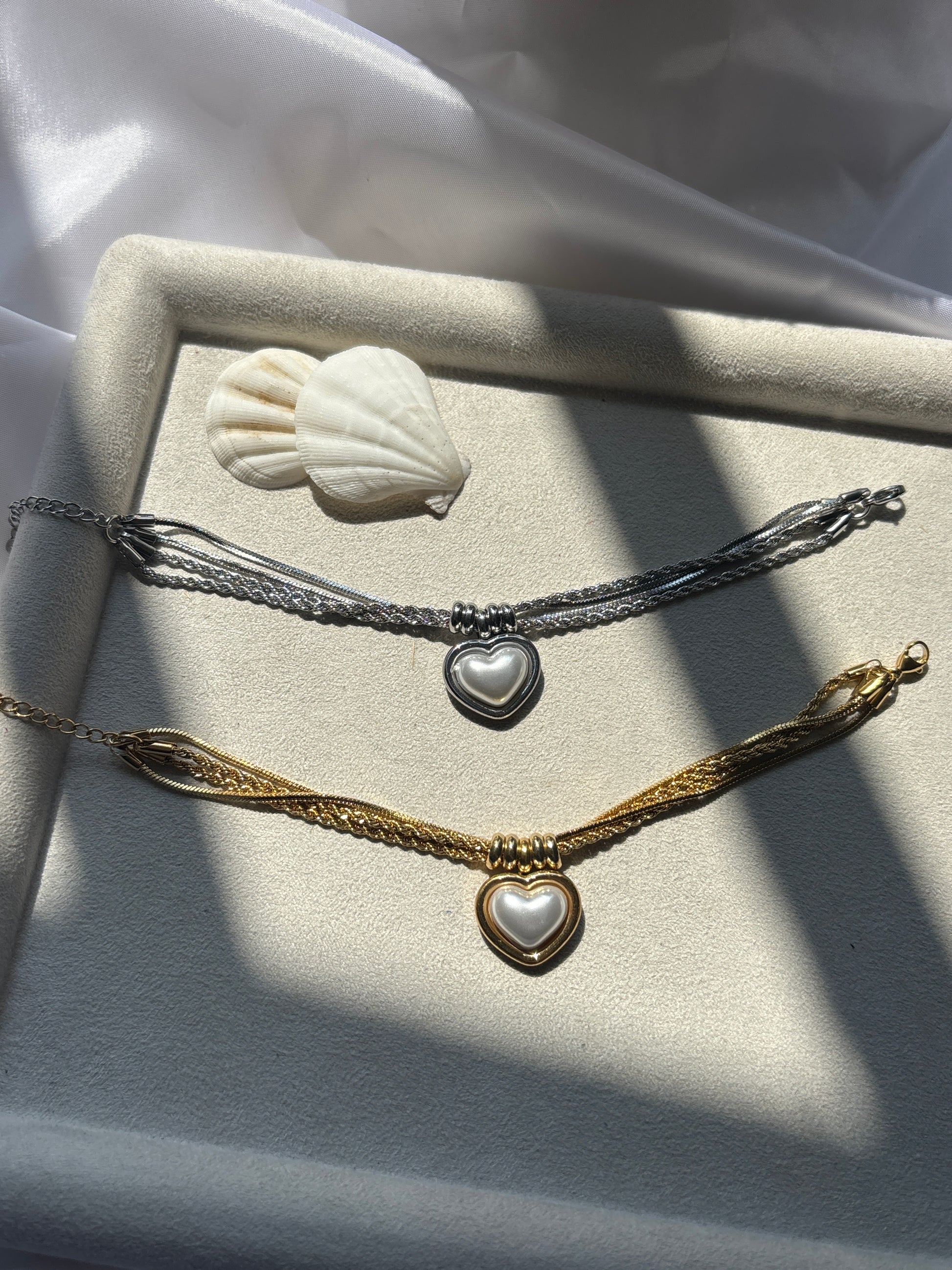 Μια καρδιά που λάμπει σαν μαργαριτάρι… Το Eternal Pulse είναι ένα εντυπωσιακό βραχιόλι με υφή πλεγμένης αλυσίδας και μια ανάγλυφη καρδιά στο κέντρο — σύμβολο αγάπης που δεν ξεθωριάζει.