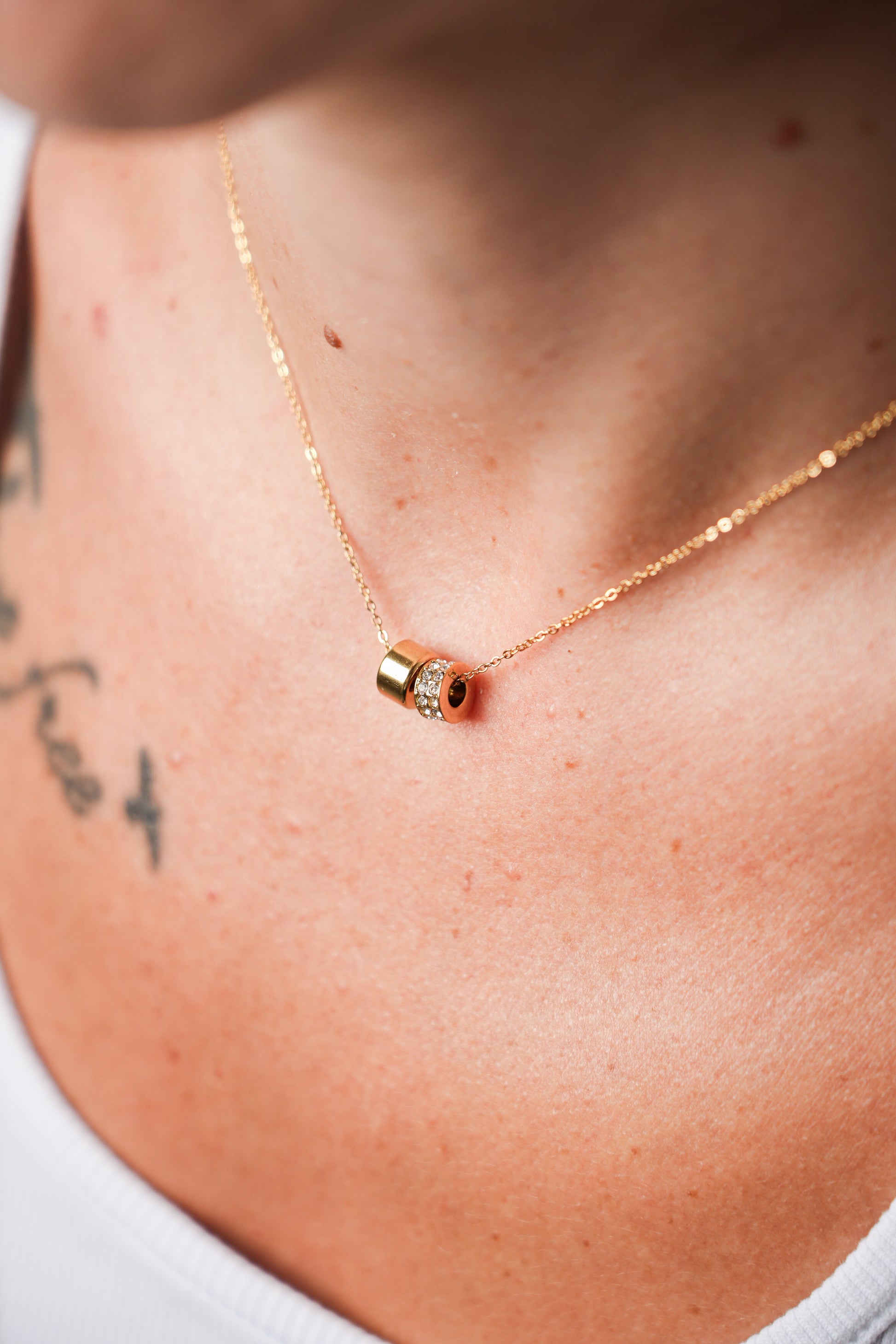 Ένα minimal αλλά εντυπωσιακό κολιέ που αποπνέει κομψότητα. Τα δύο κυλινδρικά στοιχεία, το ένα λείο και το άλλο διακοσμημένο με λαμπερά ζιργκόν, συνδυάζονται σε τέλεια αρμονία, συμβολίζοντας την ισορροπία ανάμεσα στην απλότητα και τη λάμψη. Ιδανικό για καθημερινή χρήση αλλά και για βραδινές εμφανίσεις.