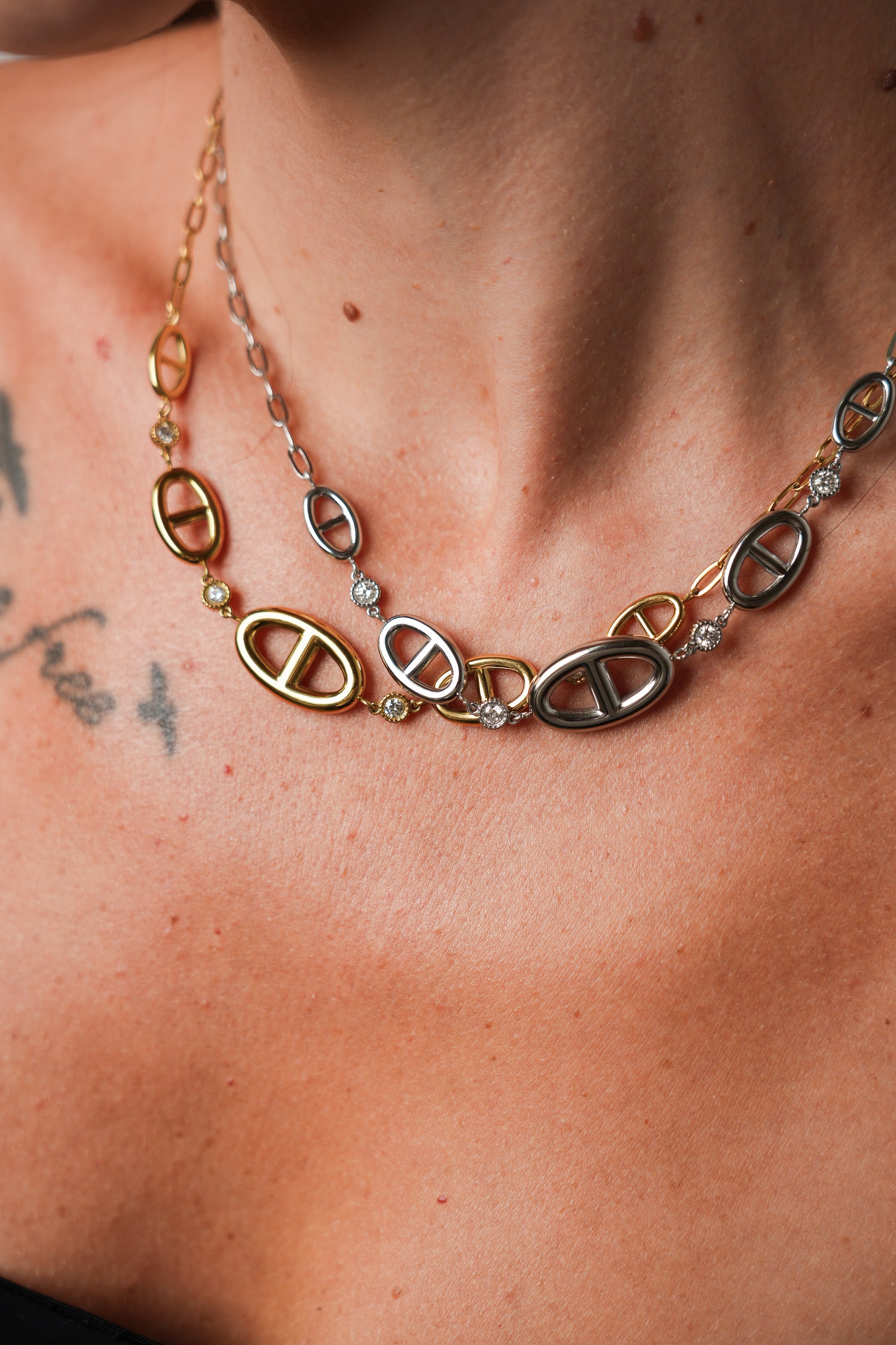 Ένα ιδιαίτερο κολιέ που συνδυάζει πολυτέλεια και μοντέρνο design. Οι εναλλασσόμενοι κρίκοι σε χρυσό και ασημί τόνο, διακοσμημένοι με λαμπερά κρύσταλλα, δημιουργούν ένα δυναμικό κόσμημα που τραβάει τα βλέμματα. Ιδανικό για statement εμφανίσεις που αναδεικνύουν το προσωπικό σου στυλ.