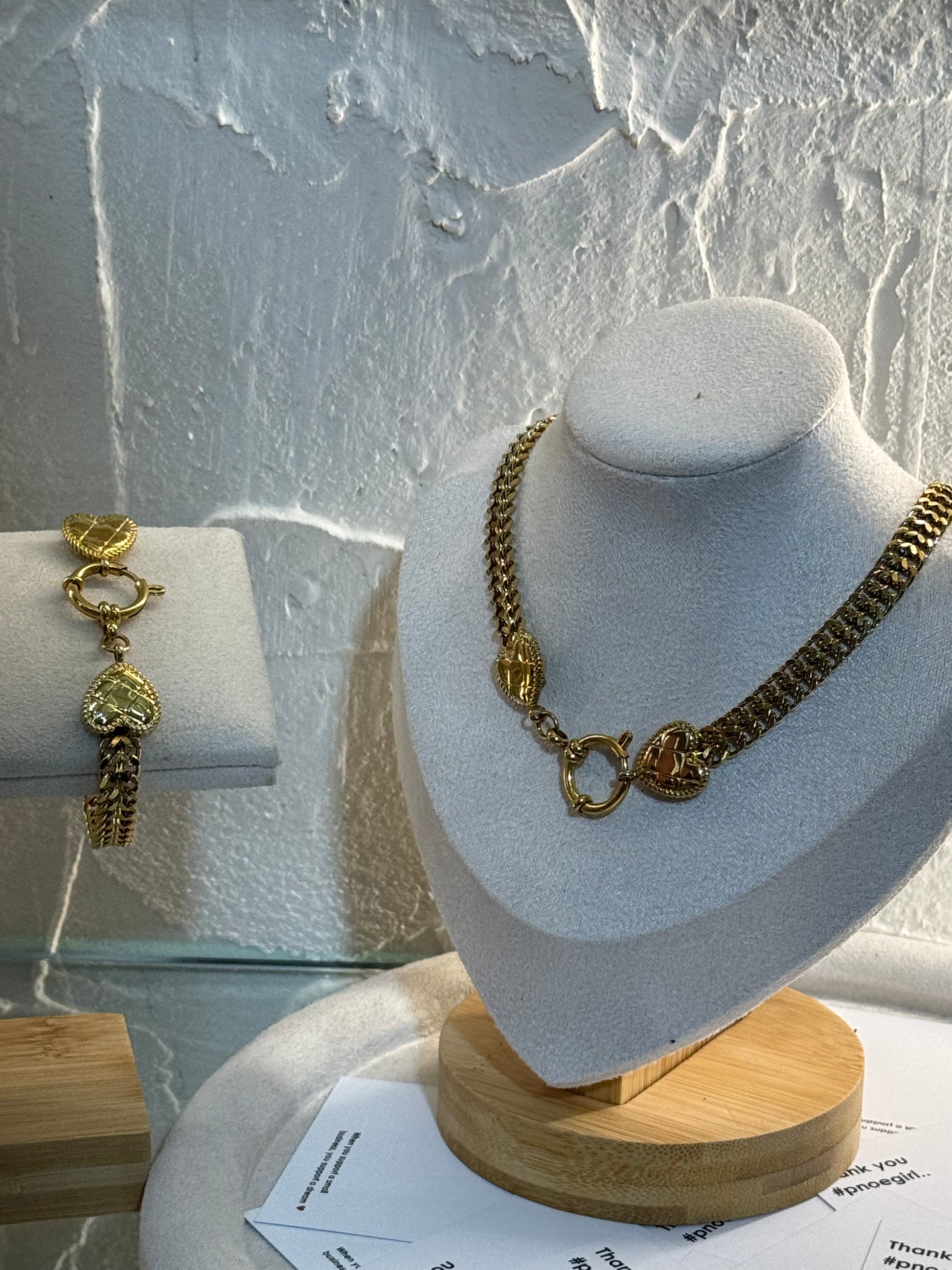 Δύναμη, κύρος και κομψότητα σε ένα ολοκληρωμένο σετ. Το “Imperial Links” περιλαμβάνει κολιέ και βραχιόλι σε χρυσή απόχρωση με διακριτικά charms καρδιάς και bold κρίκους που δίνουν μια αίσθηση πολυτέλειας και δυναμισμού. Ένα statement σύνολο που απογειώνει κάθε εμφάνιση, από το καθημερινό chic έως το βραδινό glam.