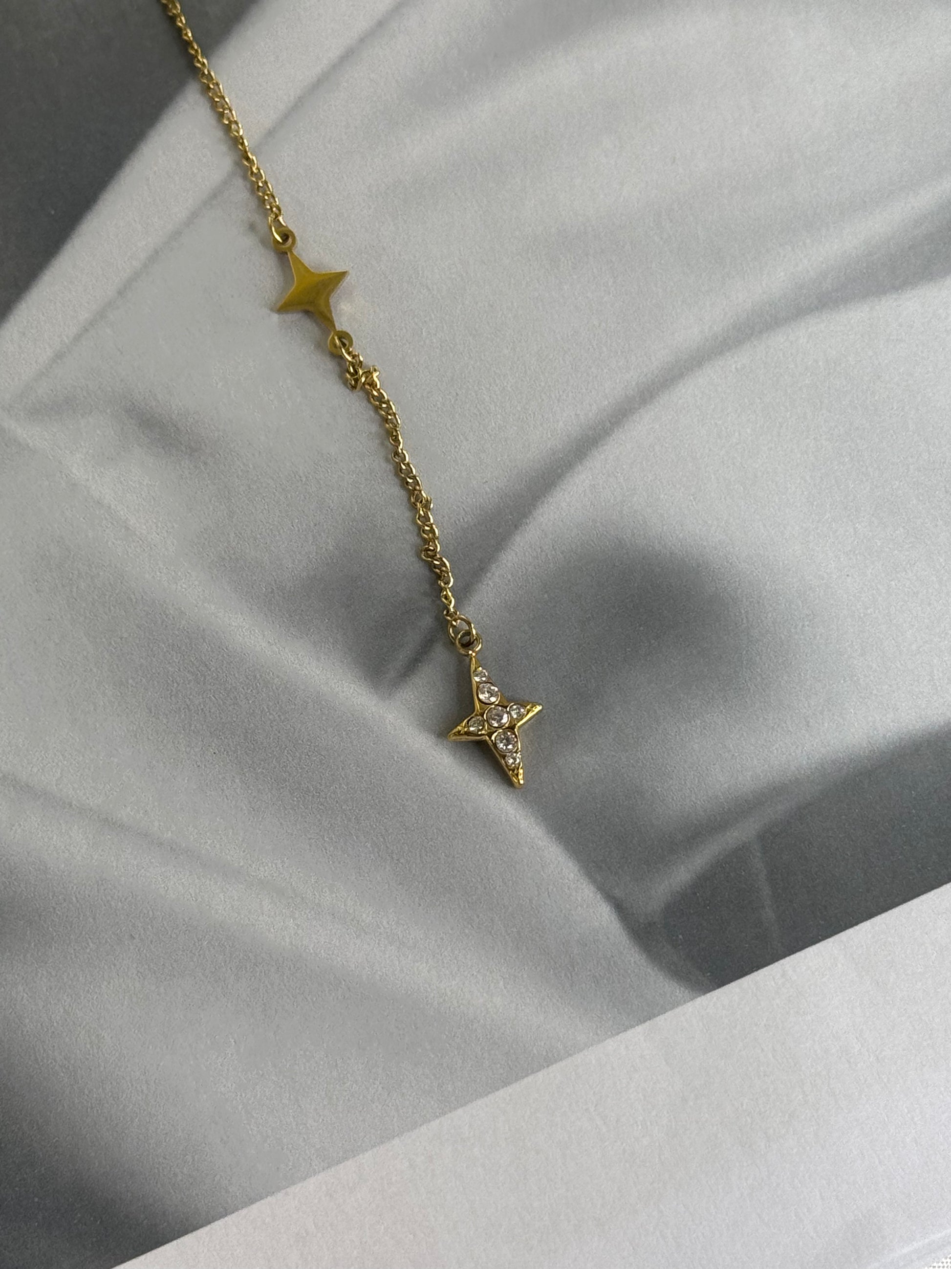 Ένα λαμπερό κολιέ που αποτυπώνει τη μαγεία του ουρανού τη νύχτα. Οι μικρές μεταλλικές λεπτομέρειες σε σχήμα αστεριού ενώνονται αρμονικά με το τελικό κρεμαστό, χαρίζοντας μια διακριτική λάμψη σε κάθε σου εμφάνιση. Ιδανικό για layering ή για να φορεθεί μόνο του ως statement piece.