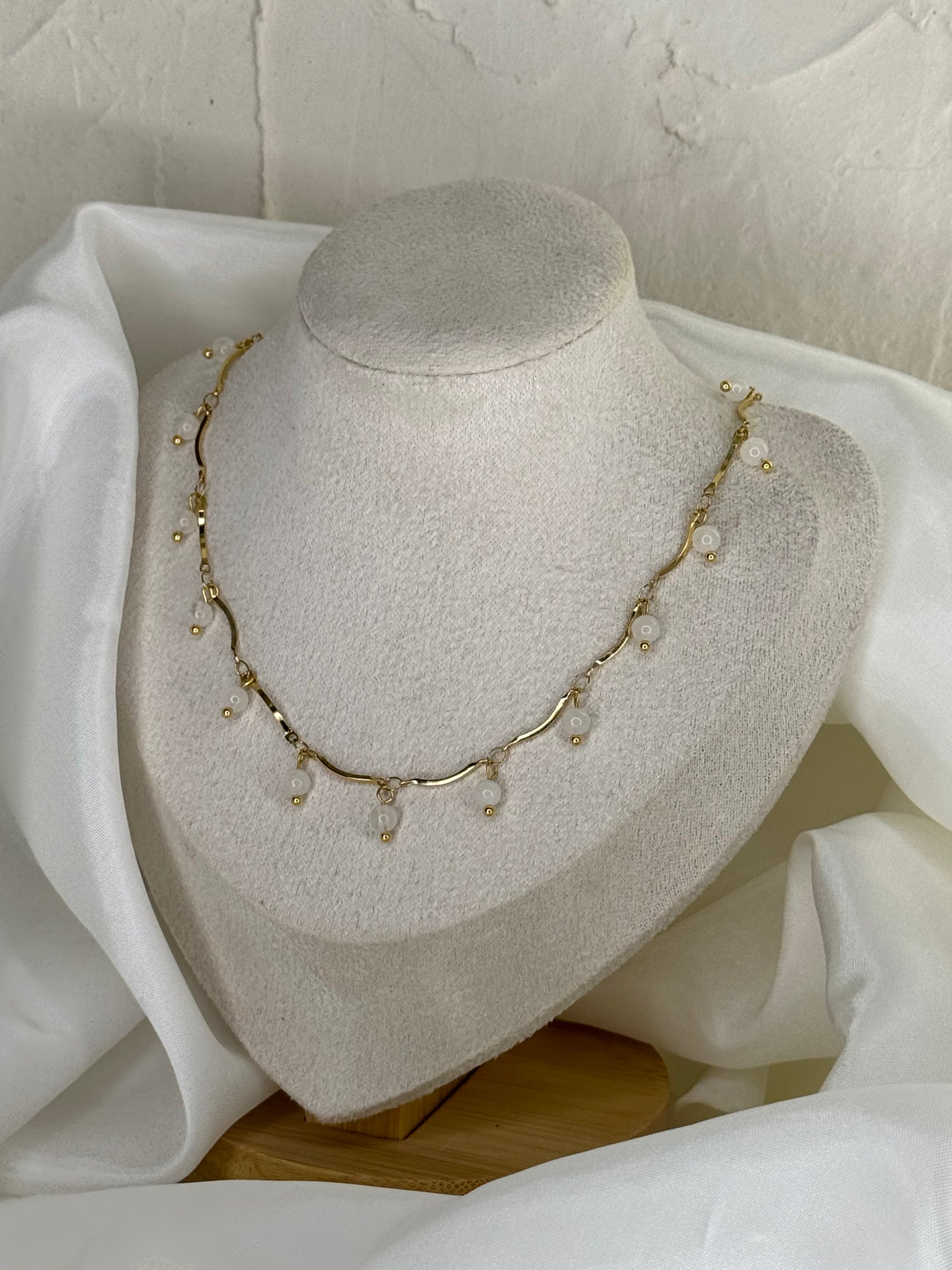 Ένα κολιέ που αποτυπώνει την ομορφιά της πρωινής δροσιάς. Οι μικρές σταγόνες–πέρλες κρέμονται διακριτικά από τη χρυσή αλυσίδα, δημιουργώντας μια αίσθηση κίνησης και φρεσκάδας. Διατίθεται σε δύο αποχρώσεις, λευκό και πράσινο, για να ταιριάζει σε κάθε διάθεση και στυλ.