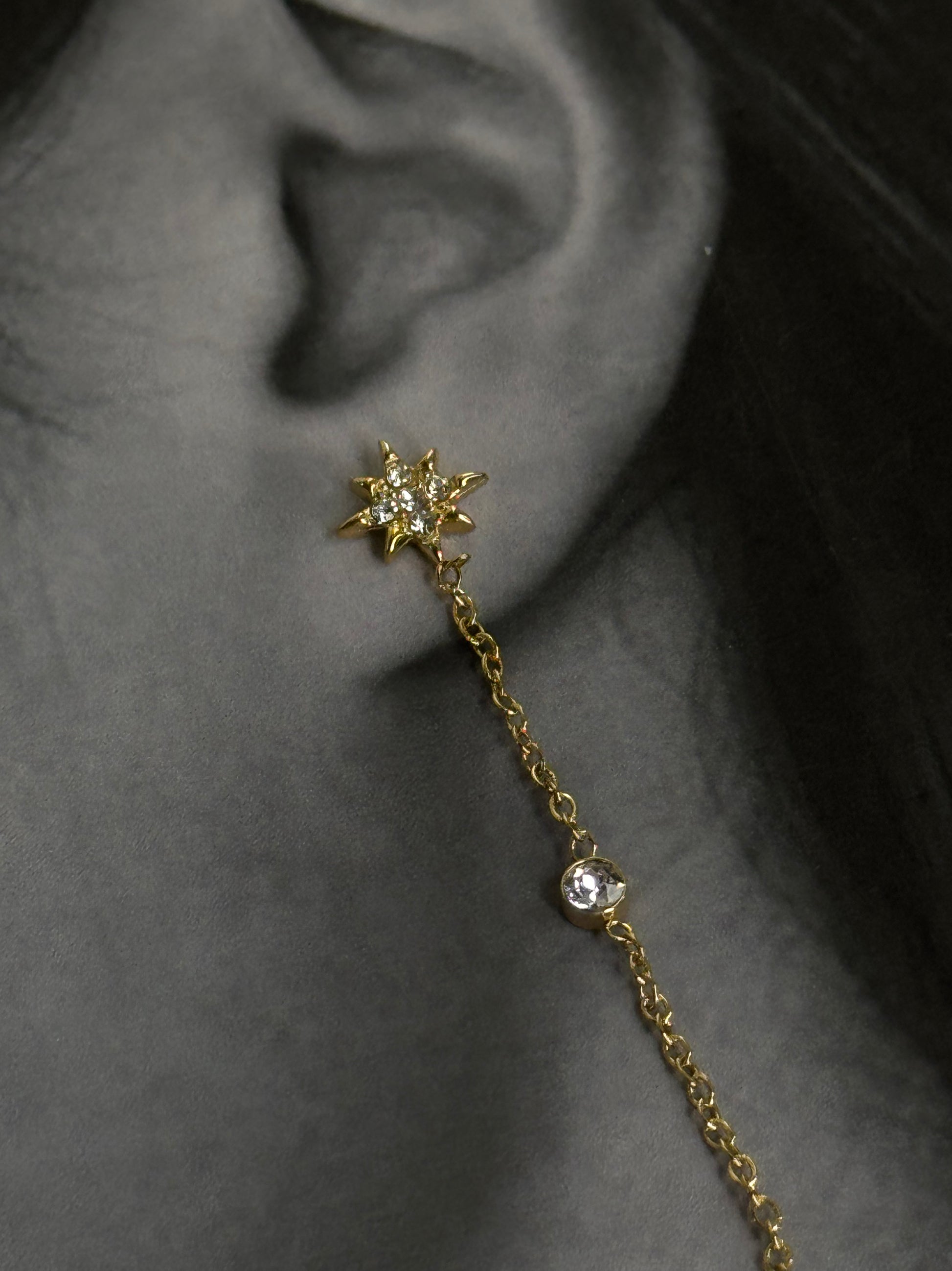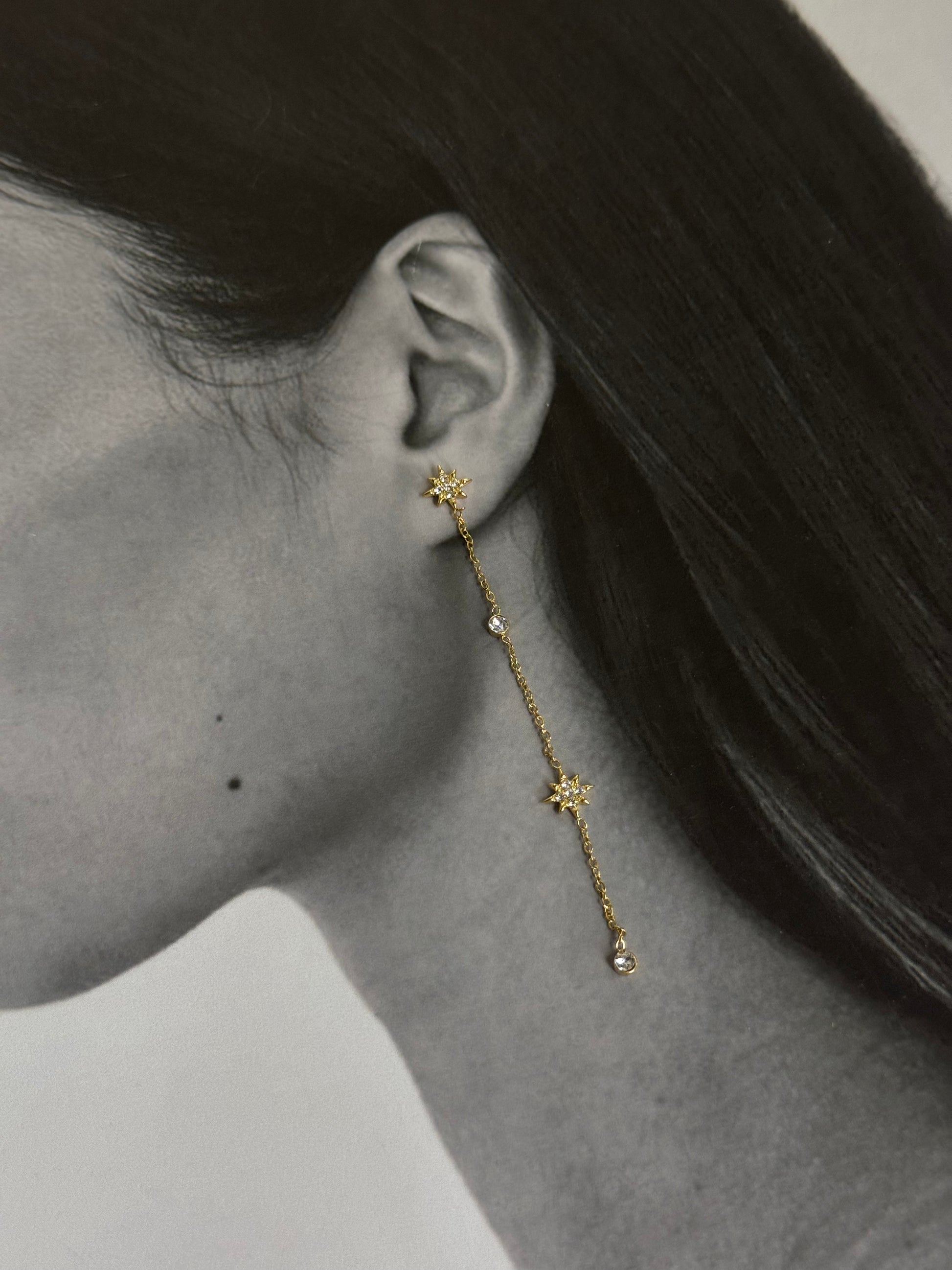 Αιθέρια και λαμπερά, τα Stellar Drops σκουλαρίκια μοιάζουν να αιχμαλωτίζουν το φως των άστρων. Η λεπτή αλυσίδα τους αγκαλιάζει κομψά το πρόσωπο, ενώ τα μικρά αστέρια και οι πέτρες στο τελείωμα δημιουργούν μια αίσθηση κίνησης και μαγείας. Ιδανικά για βραδινές εμφανίσεις, αλλά και για να προσθέσουν αστραφτερή πινελιά στην καθημερινότητα.