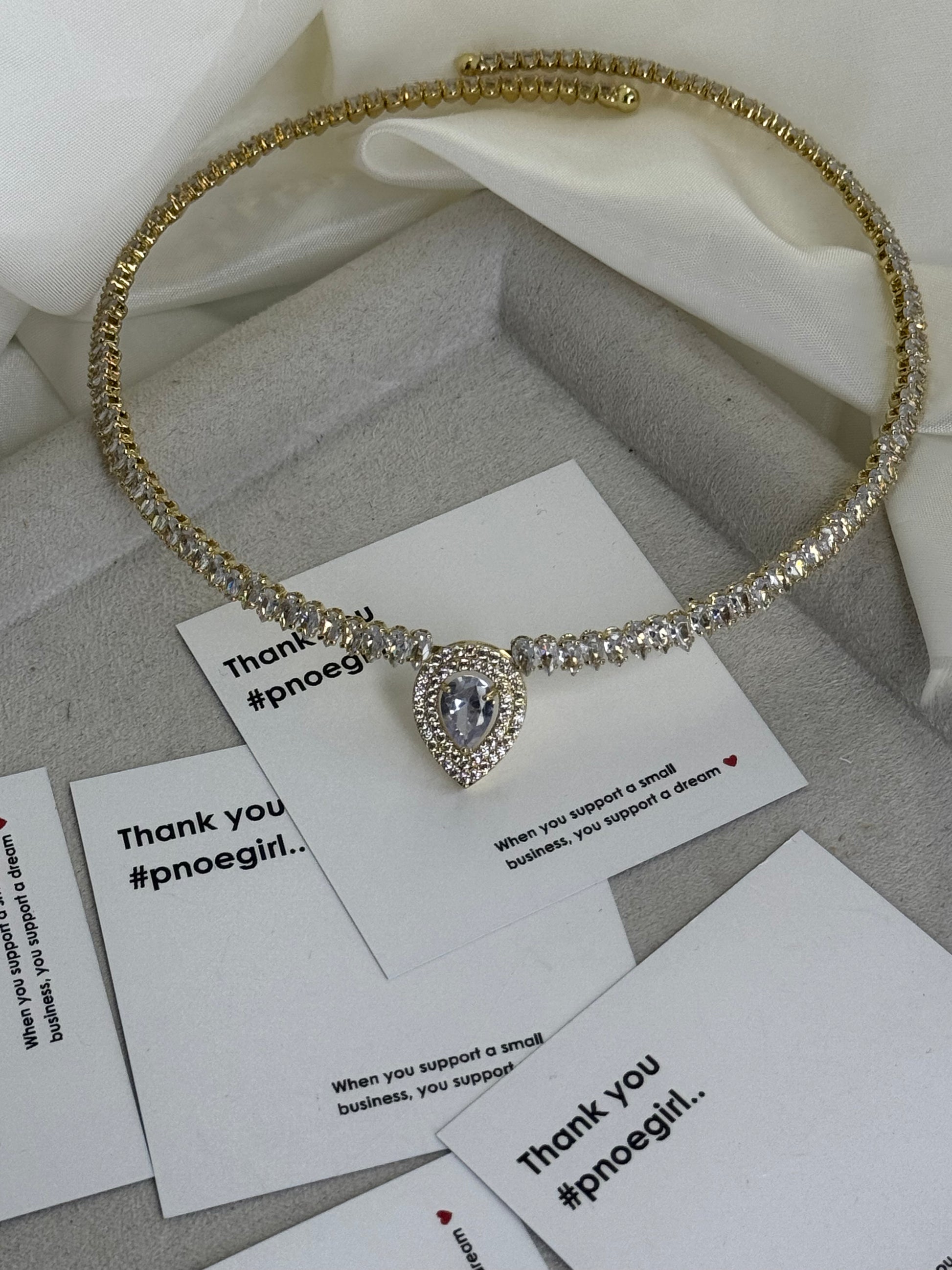 Ένα choker που αιχμαλωτίζει το φως, κάθε πέτρα του λάμπει σαν μικρό αστέρι, ενώ η καρδιά στο κέντρο του θυμίζει υπόσχεση αιώνιας αγάπης. Φοριέται μόνο του ή σε layered συνδυασμούς, προσθέτοντας μια δόση διακριτικής πολυτέλειας σε κάθε σου εμφάνιση.