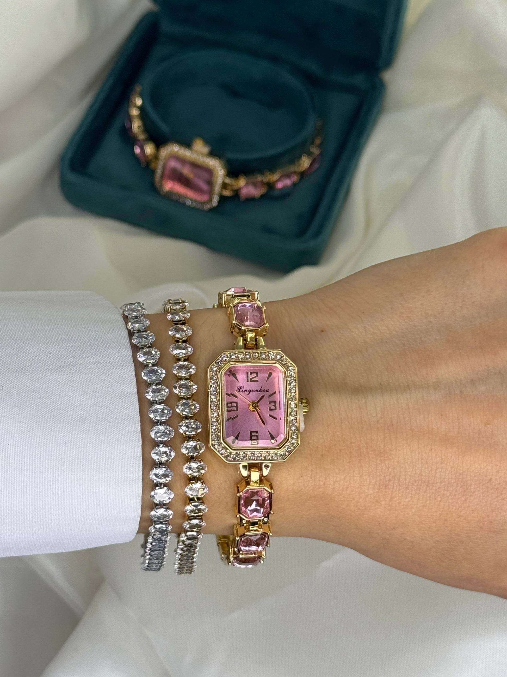 Το PINK AFFAIR είναι η απόλυτη συνάντηση κομψότητας και φινέτσας. Ο ροζ καθρέφτης του καντράν αγκαλιάζεται από λαμπερά κρύσταλλα, ενώ το χρυσό μπρασελέ με τις ροζ πέτρες δημιουργεί ένα εκθαμβωτικό αποτέλεσμα που δεν περνά απαρατήρητο. Ένα ρολόι που λειτουργεί σαν κόσμημα, θηλυκό, εντυπωσιακό και ακαταμάχητο.