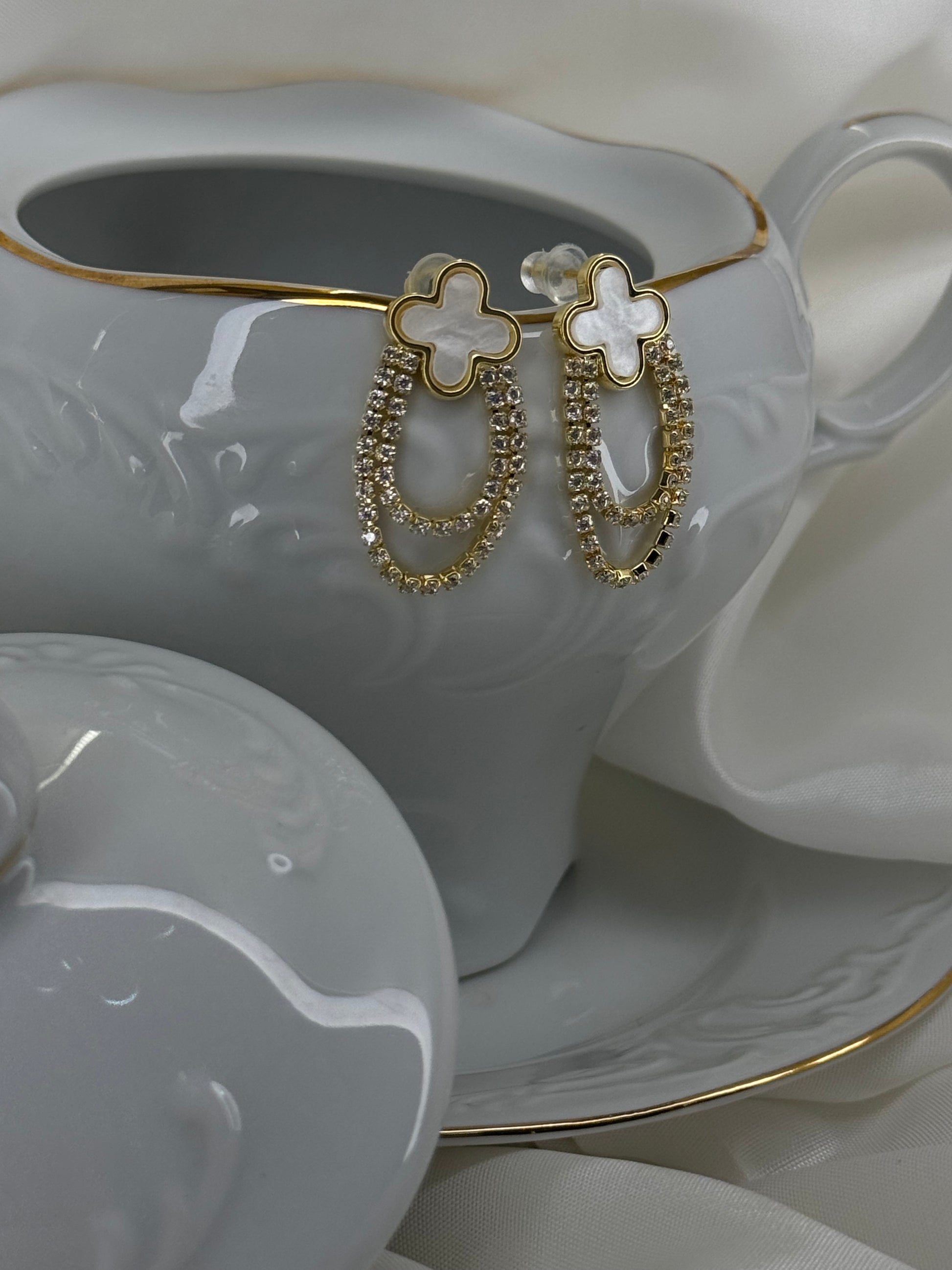 Τα σκουλαρίκια ELARA CHARM συνδυάζουν διακριτική πολυτέλεια και θηλυκή κομψότητα. Το σύμβολο τετράφυλλου λουλουδιού στο επάνω μέρος χαρίζει μια αίσθηση τύχης και ισορροπίας, ενώ οι διπλές αλυσίδες από λαμπερά κρύσταλλα προσθέτουν μια πινελιά λάμψης που κινείται μαζί σου. Ένα κόσμημα που αποπνέει ρομαντισμό και διαχρονικό στυλ.