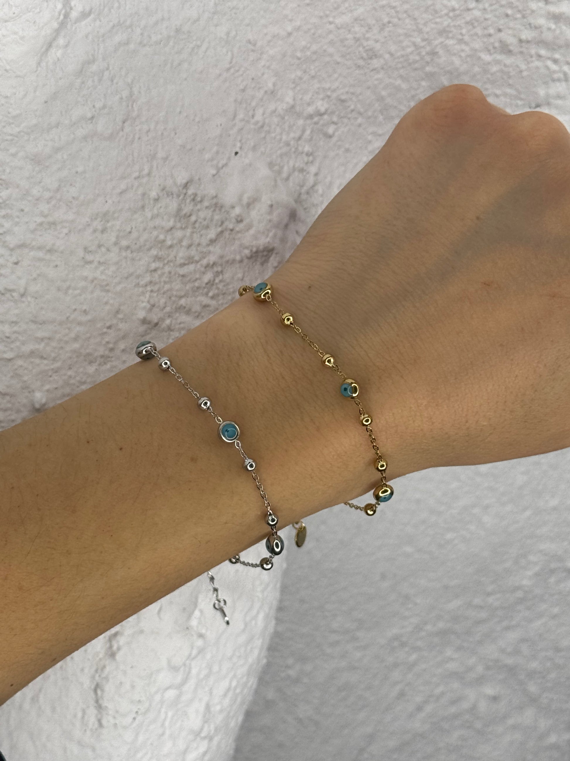 Το Eye Harmony είναι ένα διακριτικό φυλαχτό που συνδυάζει στυλ και προστασία. Οι μικρές χάντρες “μάτι” συμβολίζουν τη θετική ενέργεια και την καλή τύχη, ενώ η λεπτή αλυσίδα του προσθέτει μία elegant πινελιά στο χέρι. Φόρεσέ το μόνο του ή συνδύασέ το με άλλα βραχιόλια για ένα μοντέρνο layered look.