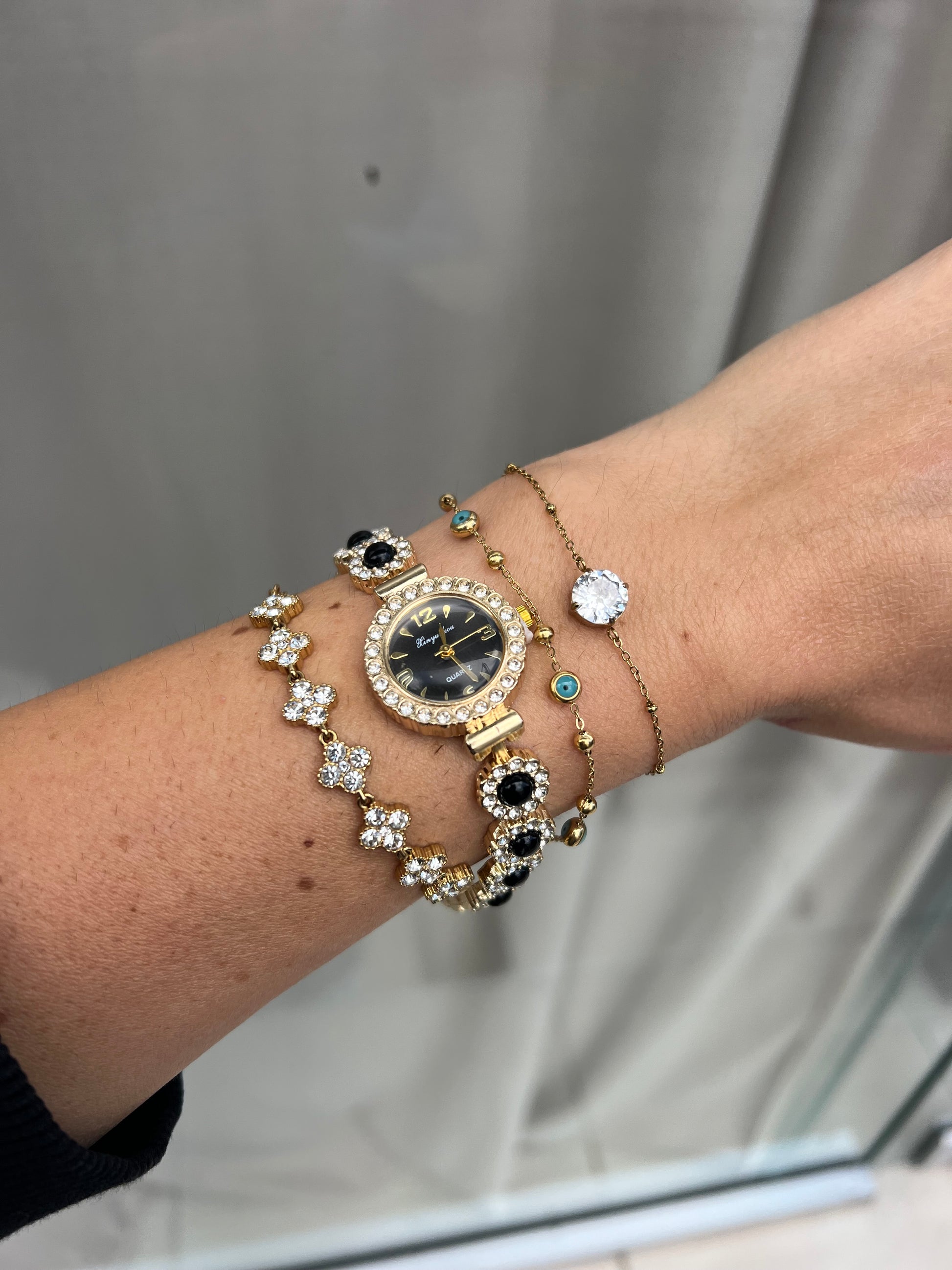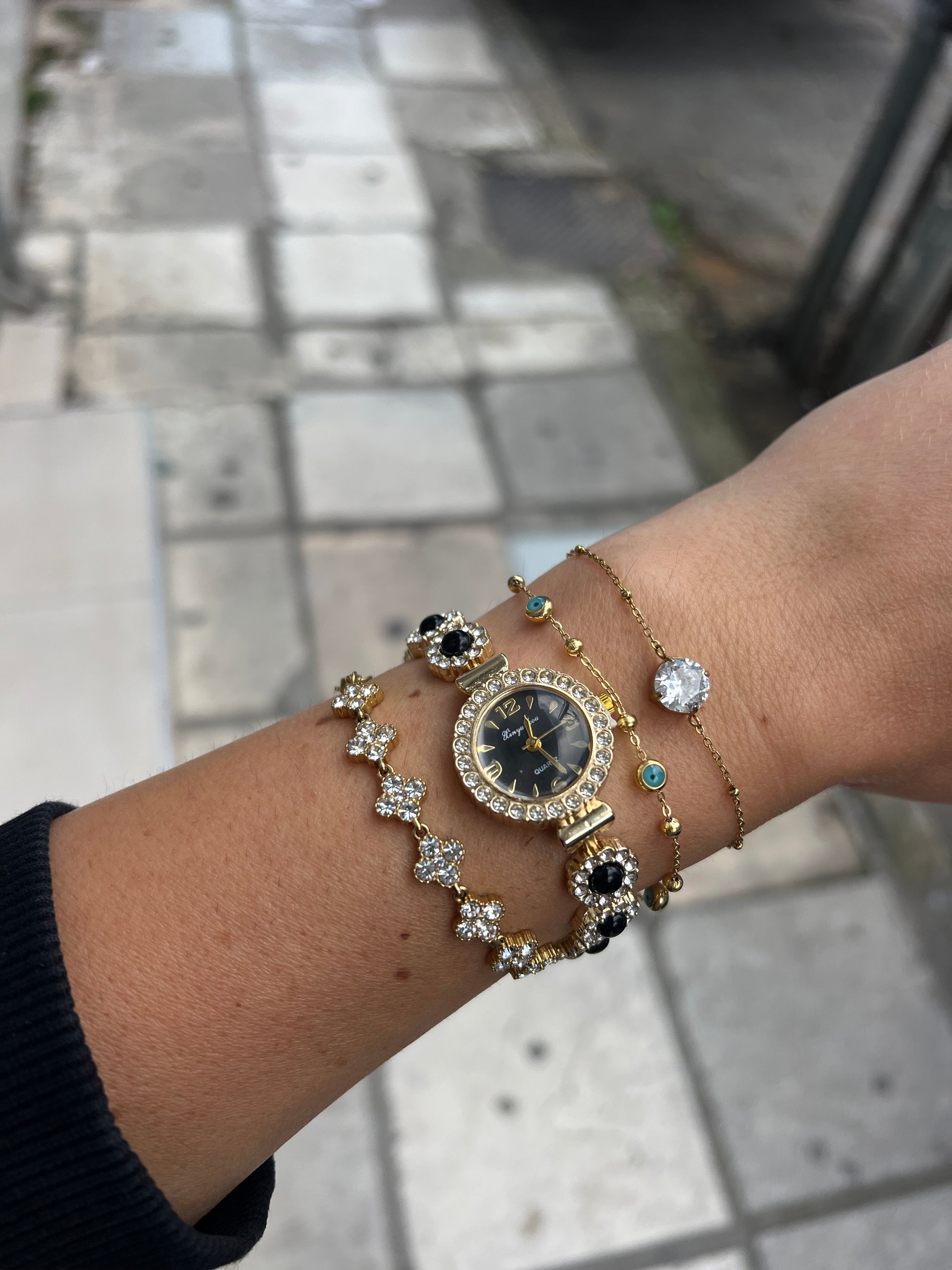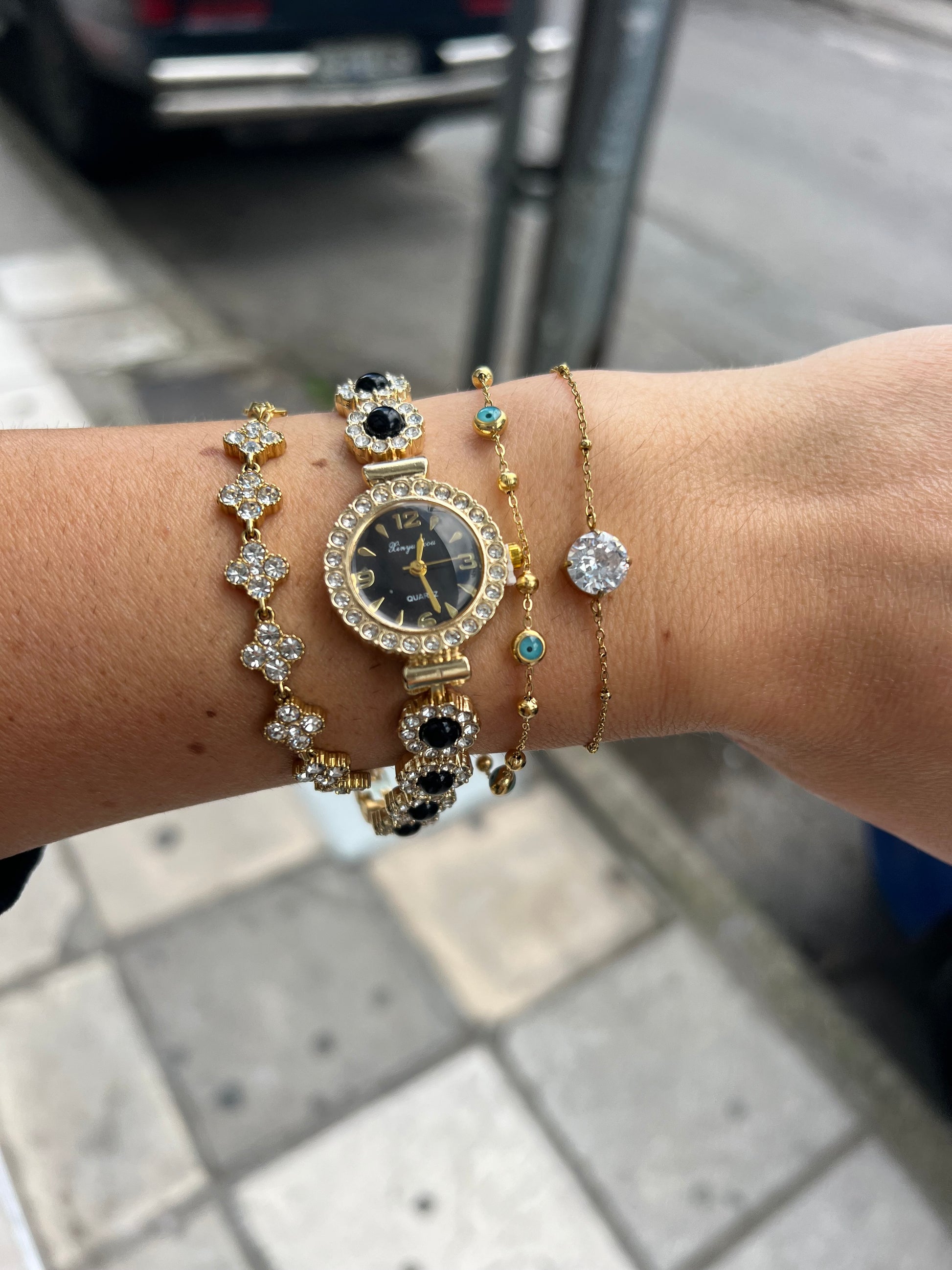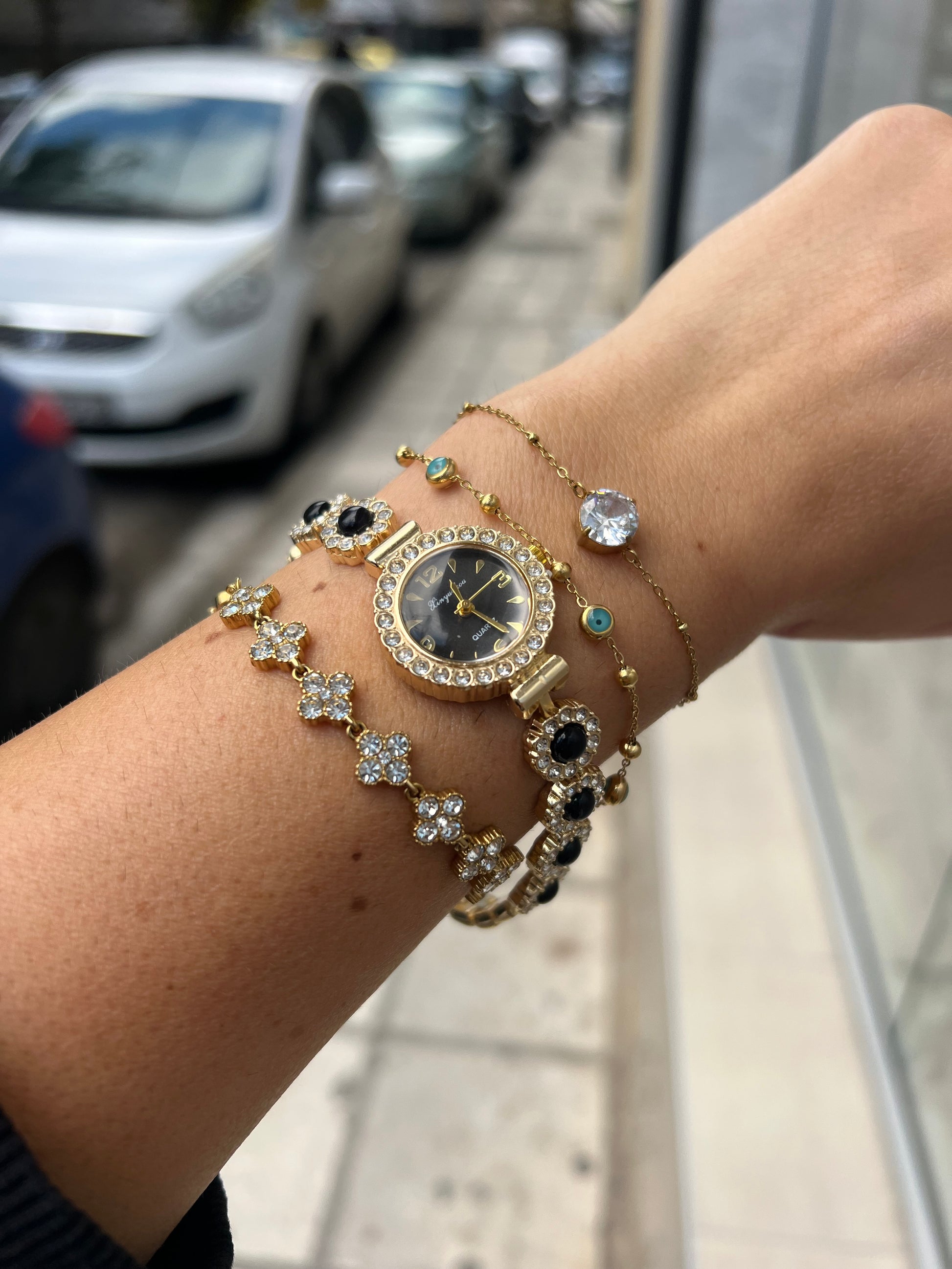 Το Noir Spell είναι ένα ρολόι που μαγνητίζει με την πρώτη ματιά. Η έντονη αντίθεση του μαύρου καντράν με τη χρυσή κάσα και τους κρυστάλλους δημιουργεί μια αίσθηση μυστηρίου και πολυτέλειας. Αποπνέει θηλυκή δύναμη, κομψότητα και διαχρονικό class, ιδανικό για γυναίκες που αγαπούν να ξεχωρίζουν χωρίς υπερβολές.