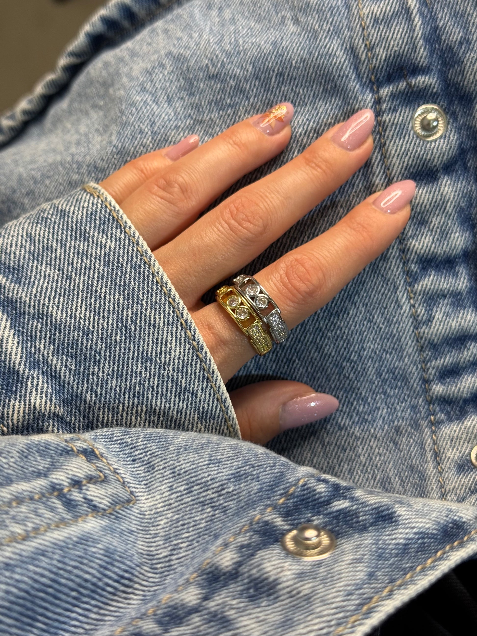 Minimal αλλά εντυπωσιακό δαχτυλίδι σε δύο αποχρώσεις που αποπνέει κομψότητα και δυναμισμό. Οι λαμπερές πέτρες στο κέντρο προσθέτουν διακριτική λάμψη για κάθε περίσταση, από καθημερινές εμφανίσεις μέχρι πιο βραδινές.