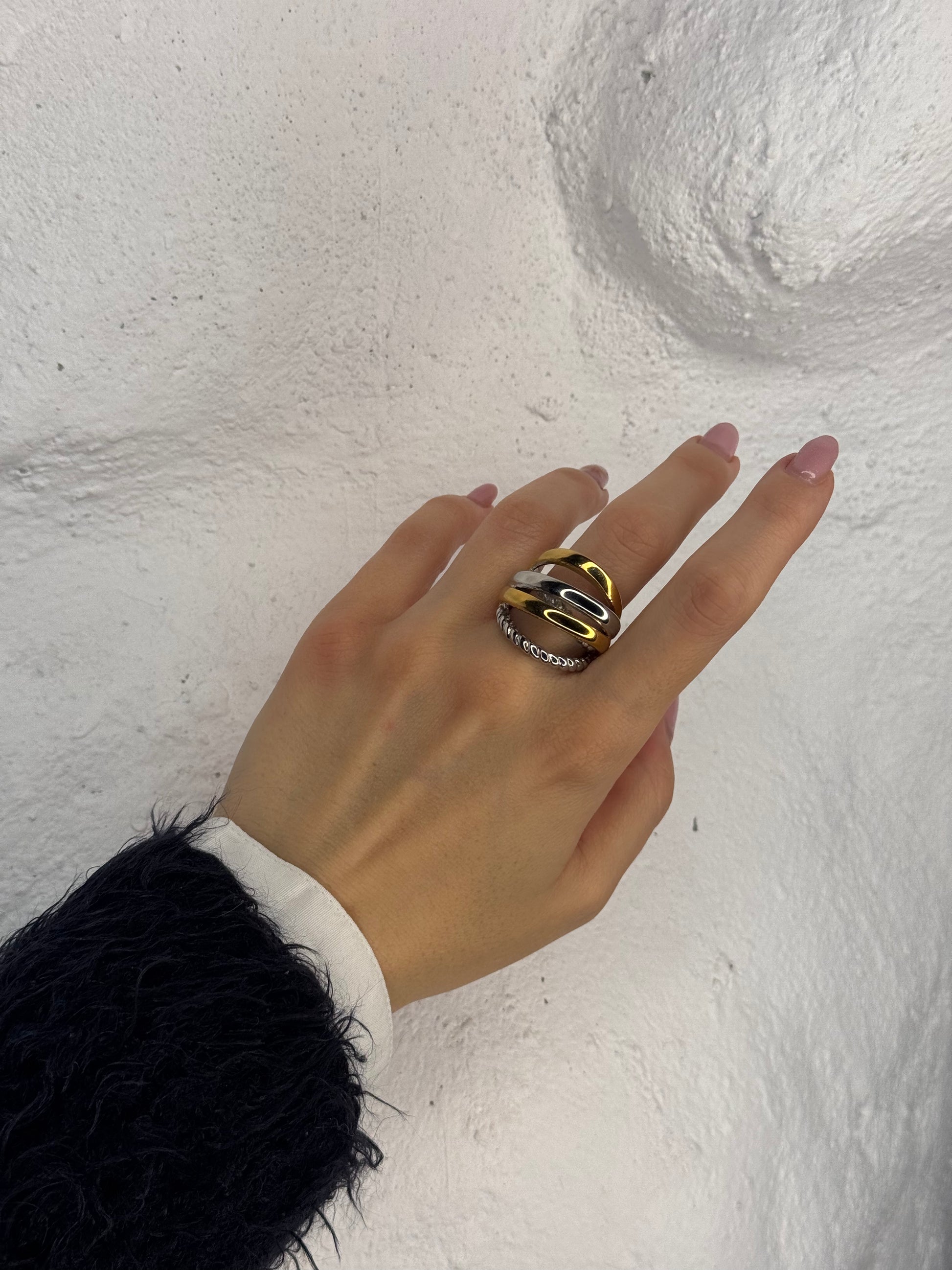 Το Fusion Orbit είναι η απόλυτη ένωση δύναμης και στυλ. Οι τρεις μεταλλικές ζώνες, χρυσή, ασημί και twisted, δημιουργούν έναν δυναμικό, πολυεπίπεδο κύκλο που τραβά το βλέμμα και ανεβάζει το outfit σε premium επίπεδο. Η κατασκευή από ανοξείδωτο ατσάλι προσφέρει σταθερότητα, αντοχή και λάμψη που μένει αναλλοίωτη, ενώ ο bold σχεδιασμός το μετατρέπει σε statement accessory που “γράφει” από μόνο του, χωρίς καμία προσπάθεια.