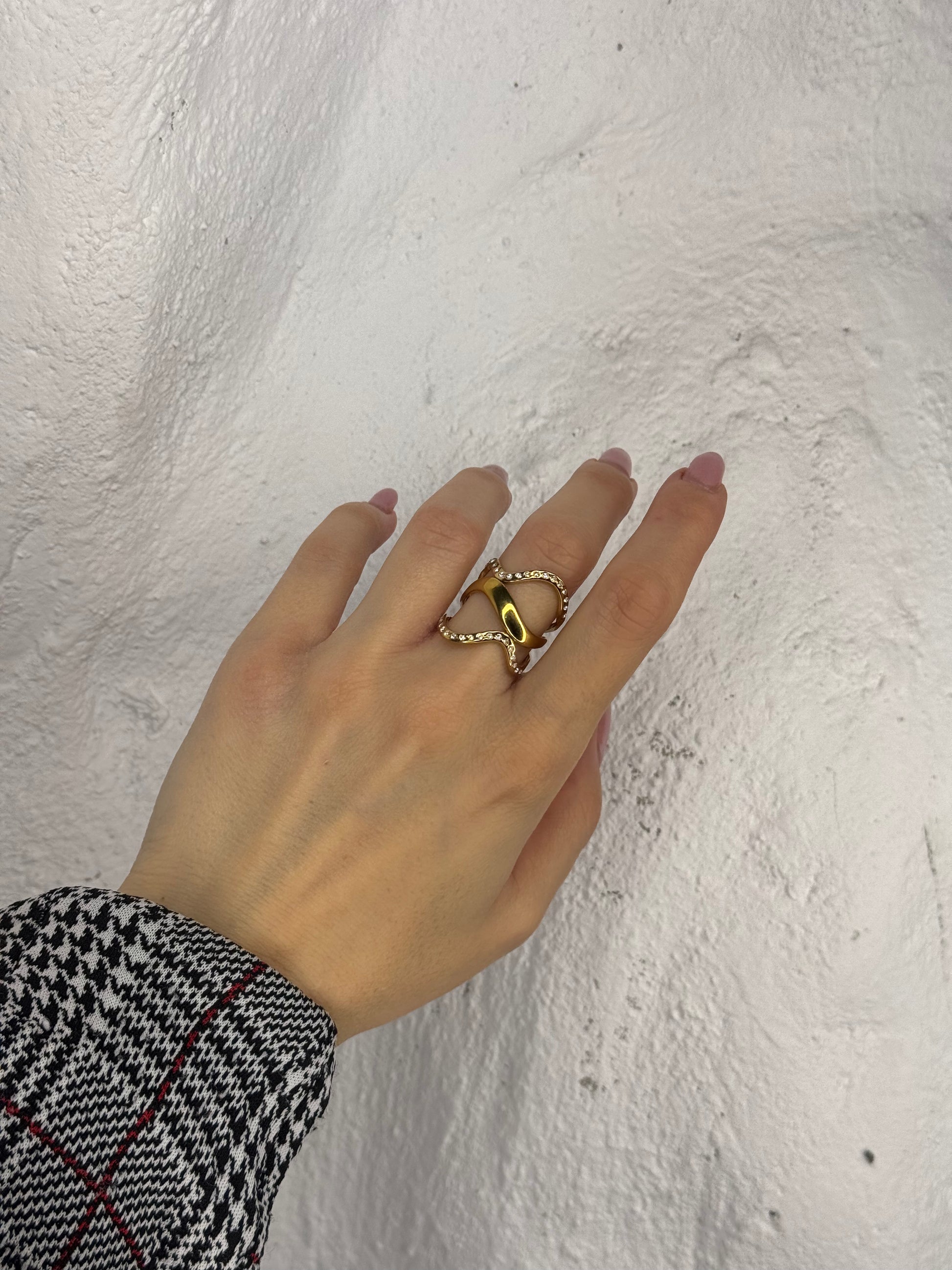 Ένα statement δαχτυλίδι που ενώνει τη ρευστότητα του design με την καθαρότητα του μετάλλου. Η καμπύλη του σχηματίζει μια elegant ροή, σαν κύμα που συναντά μια λάμψη και δημιουργεί ένα high-impact minimal αποτέλεσμα. Απευθύνεται σε εκείνες που αγαπούν το bold στοιχείο χωρίς να χάνουν τη διακριτική πολυτέλεια στο καθημερινό τους branding.
