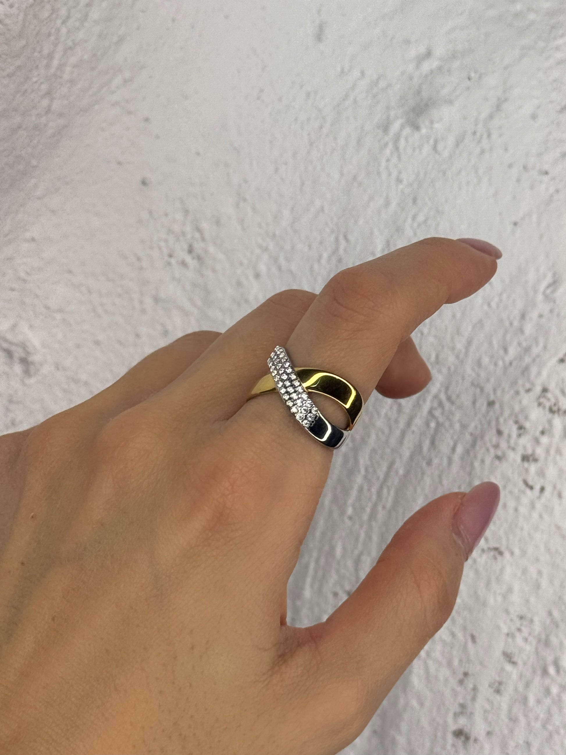 Ένα δαχτυλίδι που αγκαλιάζει το δάχτυλο σαν μια μεταλλική κορδέλα φωτός. Η διχρωμία του, χρυσό και ασημί, δημιουργεί ένα παιχνίδι αρμονίας, ενώ οι λαμπερές πέτρες προσθέτουν την ιδανική δόση sparkle. Minimal, elegant και ταυτόχρονα bold, μια λεπτομέρεια που αναβαθμίζει κάθε look με effortless sophistication.