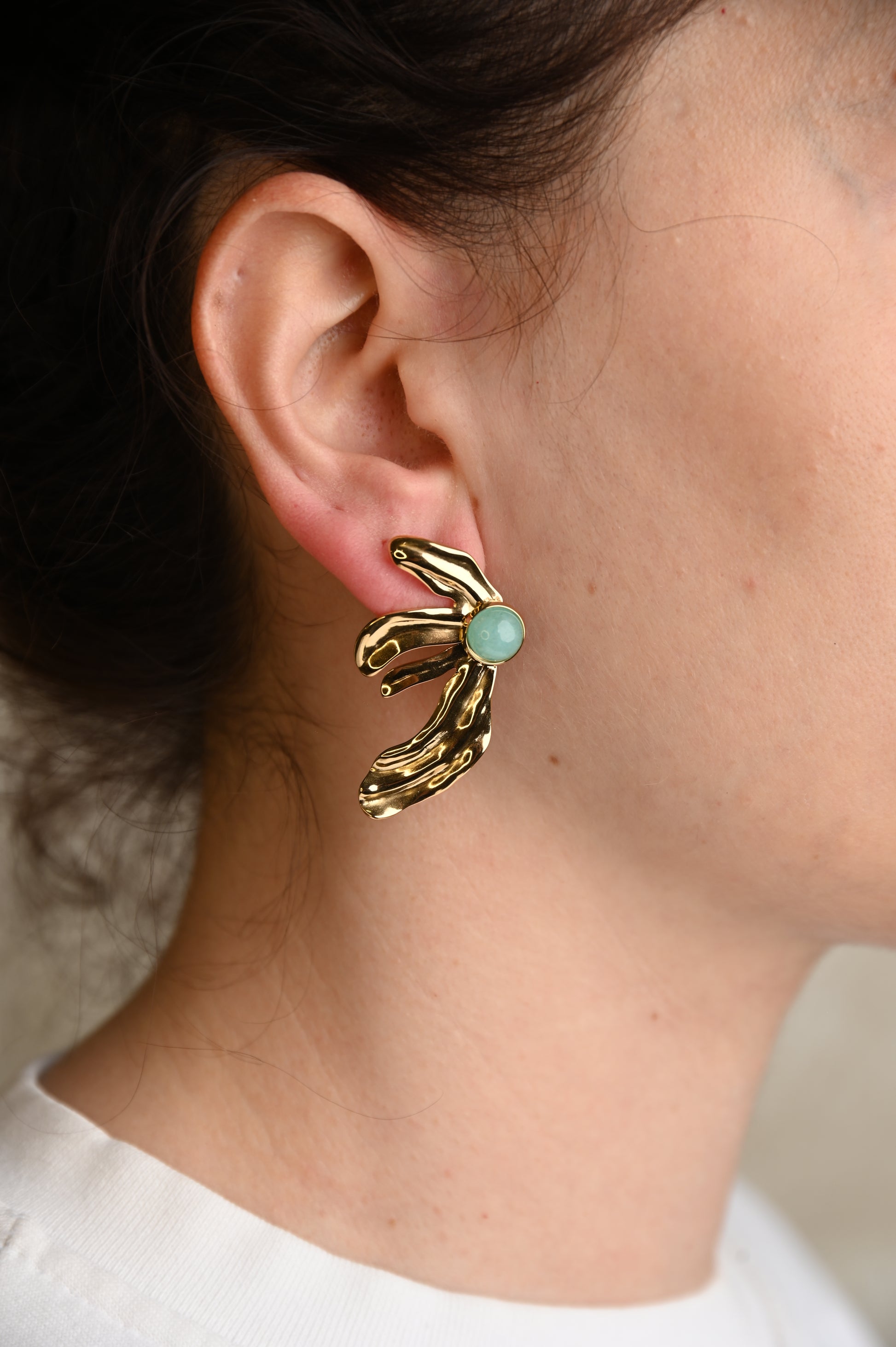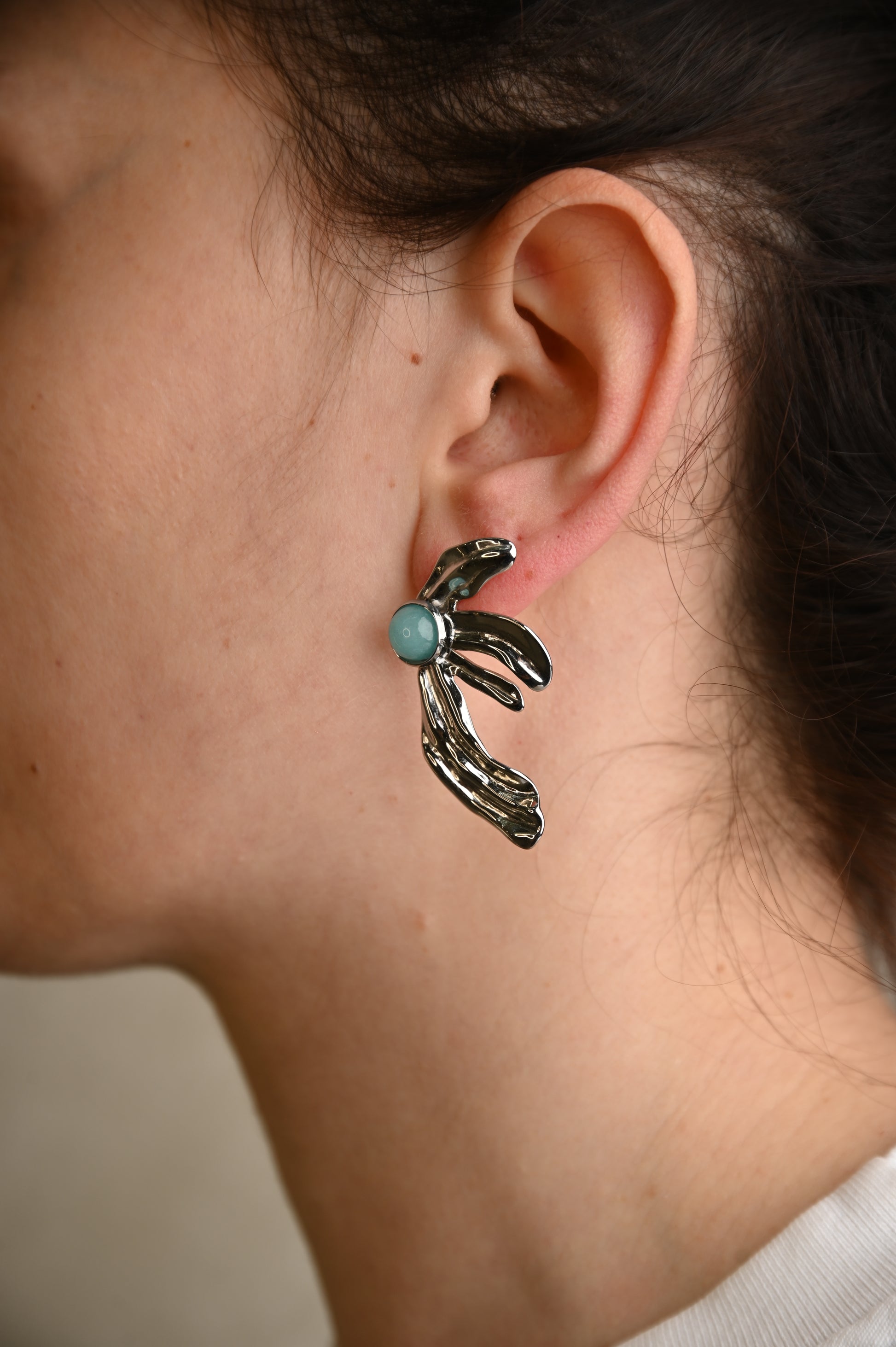 Ένα statement σκουλαρίκι εμπνευσμένο από τη ρευστότητα του νερού και τη δύναμη της φύσης. Οι οργανικές, κυματιστές γραμμές του μετάλλου –σε ασημί ή χρυσό τόνο– δημιουργούν ένα δυναμικό σχήμα, ενώ ο κεντρικός γαλάζιος λίθος προσθέτει μία δροσερή, καλοκαιρινή πινελιά. Ιδανικό για όσες θέλουν να ξεχωρίζουν με μοντέρνα, καλλιτεχνική αισθητική.