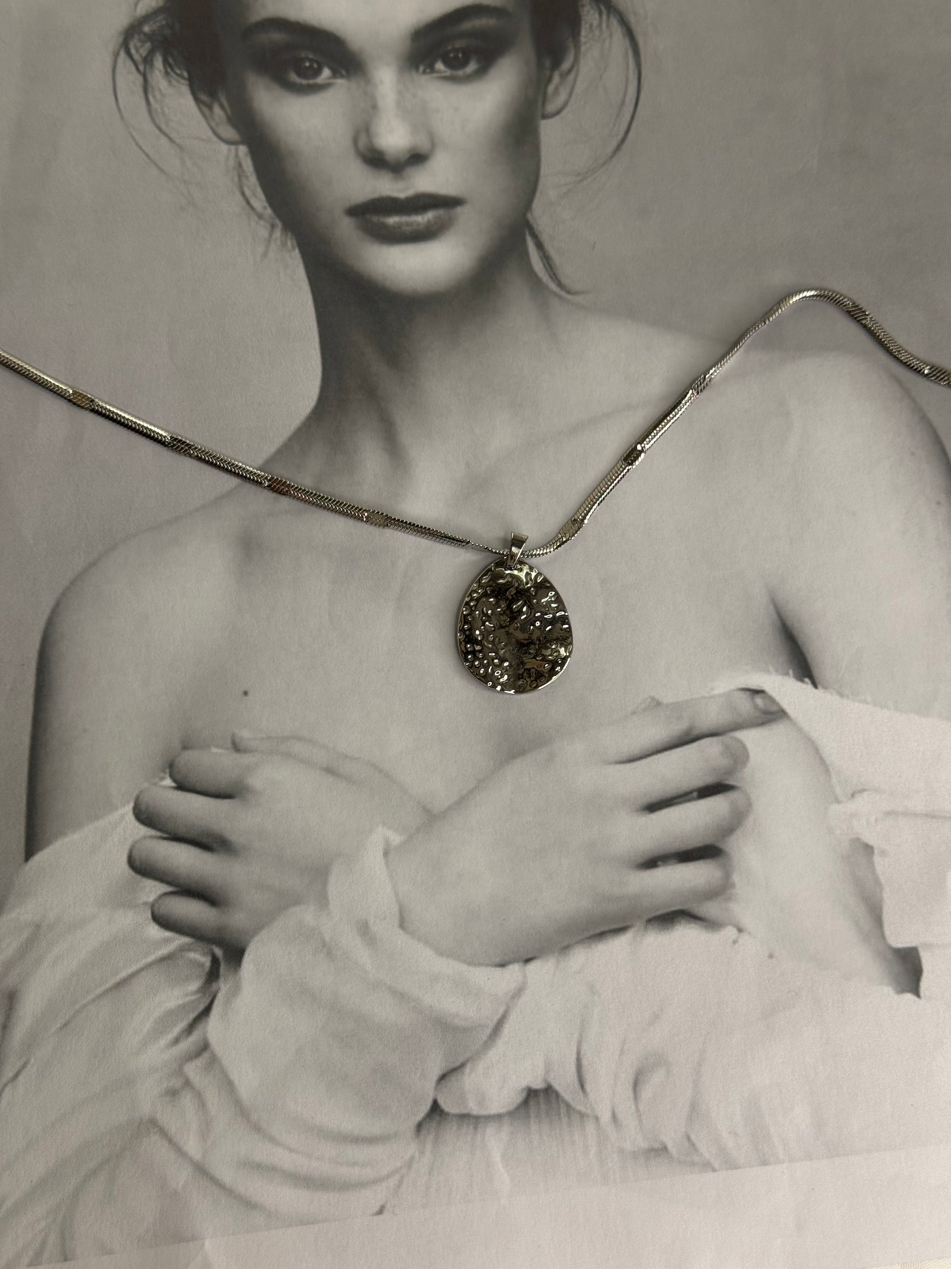 Ένα κολιέ που συνδυάζει την καθαρή γραμμή της snake αλυσίδας με τη μυσταγωγική παρουσία ενός ανάγλυφου medal. Το medallion, με την περίτεχνη υφή και το organic σχέδιο, προσθέτει μια artistic διάσταση, σαν ένα μικρό γλυπτό που φωτίζεται από κάθε κίνηση. Διαθέσιμο σε δύο αποχρώσεις, για να ταιριάζει σε κάθε αισθητική και κάθε συνδυασμό. Premium, statement, απόλυτα σύγχρονο.