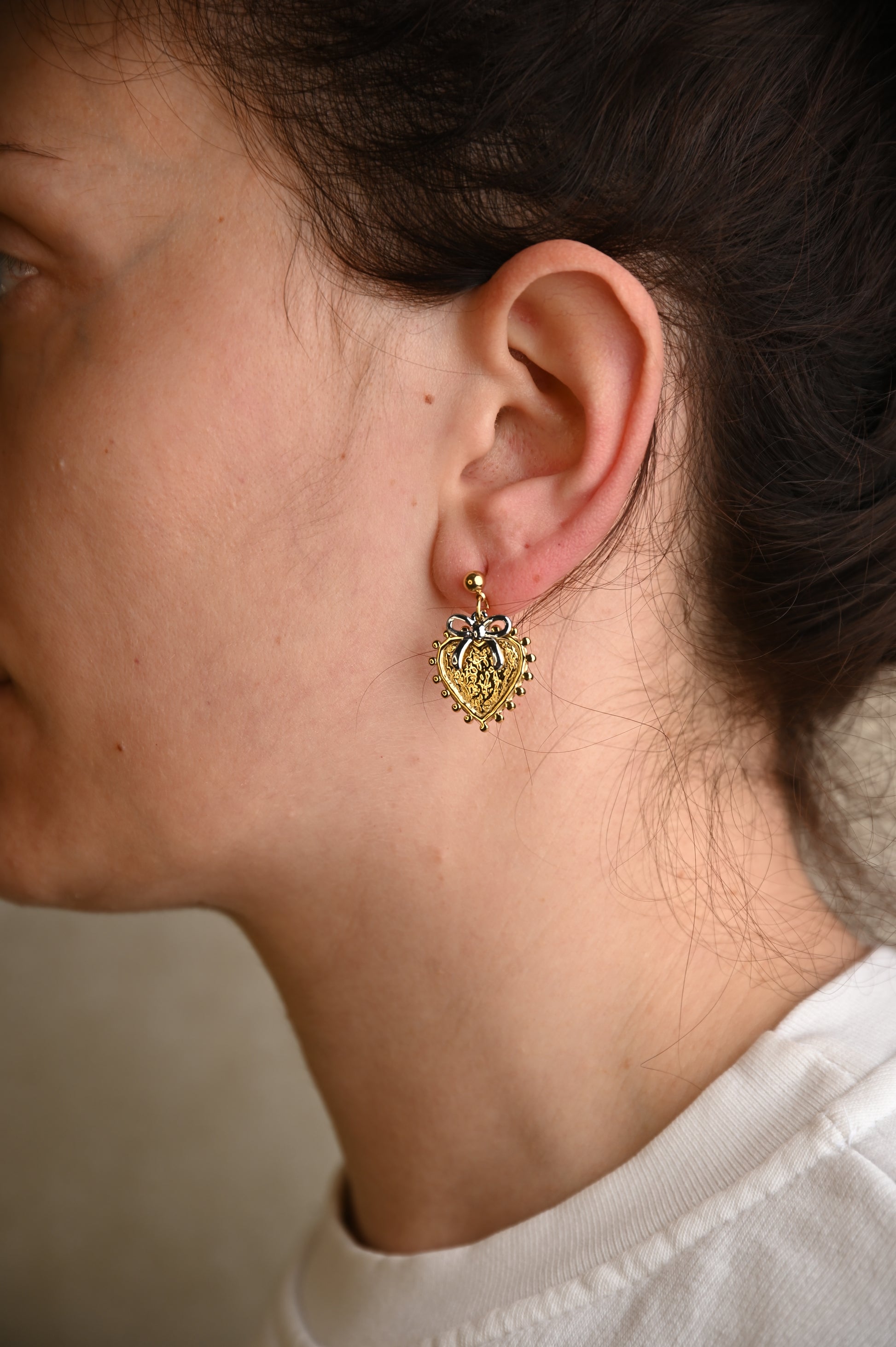 Αυτό το μοναδικό σκουλαρίκι σε σχήμα καρδιάς, με ανάγλυφο χρυσό μοτίβο και ρετρό αισθητική, θυμίζει βυζαντινά ή λατινικά φυλαχτά. Οι λεπτομέρειες σε χρυσό και ασημί προσδίδουν βάθος, ενώ η κορυφή με φιόγκο προσθέτει μια ρομαντική πινελιά. Ένα κόσμημα γεμάτο συμβολισμό και ένταση, ιδανικό για εκφραστικές, καλλιτεχνικές ψυχές.