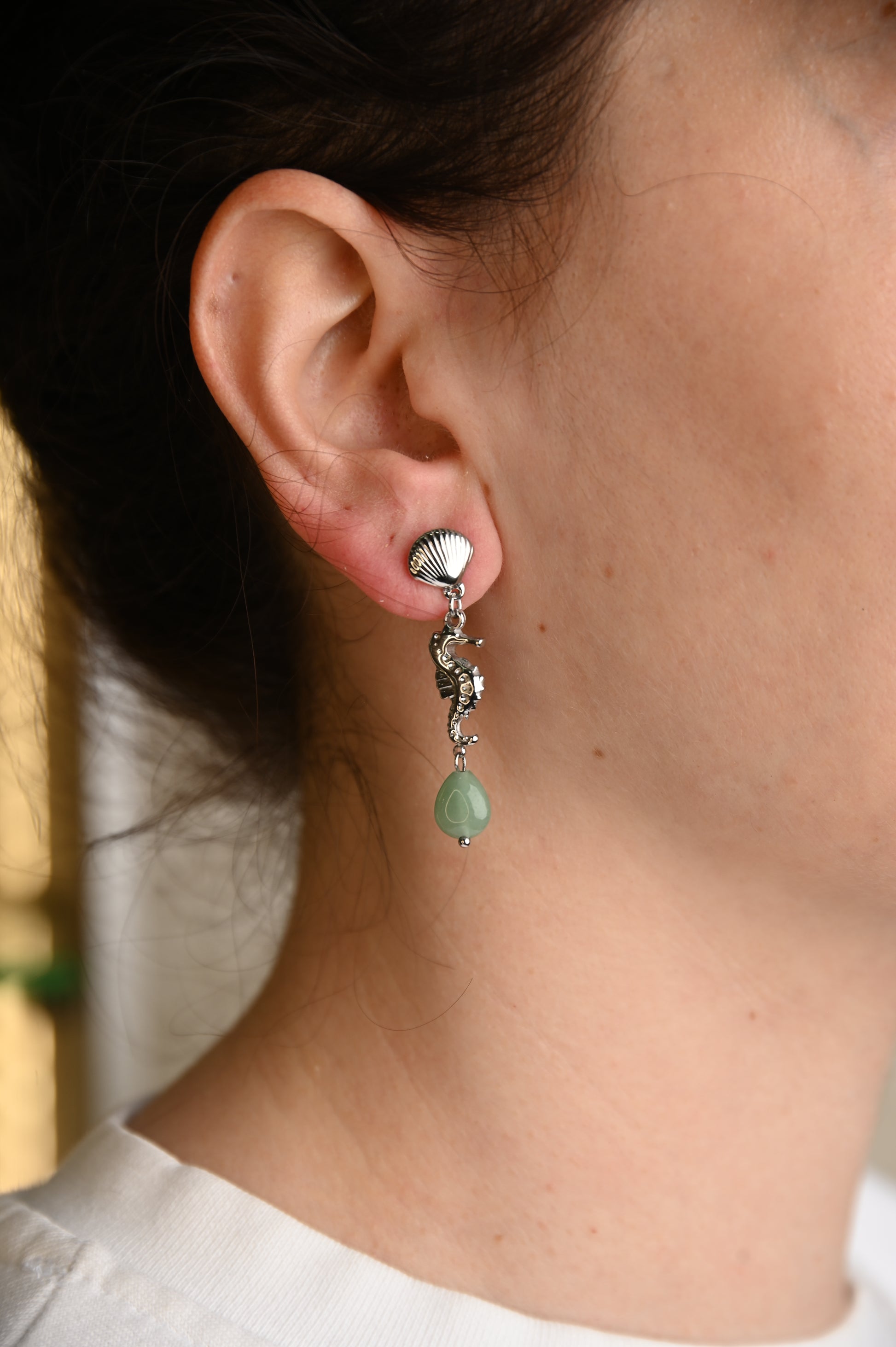 Αναδείξτε την αγάπη σας για τη θάλασσα με αυτό το κομψό σκουλαρίκι. Το σχέδιο ξεκινά με ένα μεταλλικό κέλυφος που αγκαλιάζει τον λοβό του αυτιού, ακολουθούμενο από έναν περίτεχνο ιππόκαμπο σε ασημί τόνο. Στο τελείωμα, μια σταγόνα από γυαλιστερό, πράσινο λίθο προσθέτει μια αίσθηση φρεσκάδας και φυσικής ομορφιάς. Ένα ιδανικό αξεσουάρ για καλοκαιρινές εμφανίσεις ή για όσους θέλουν να κουβαλούν μαζί τους την αύρα της θάλασσας όλο τον χρόνο.