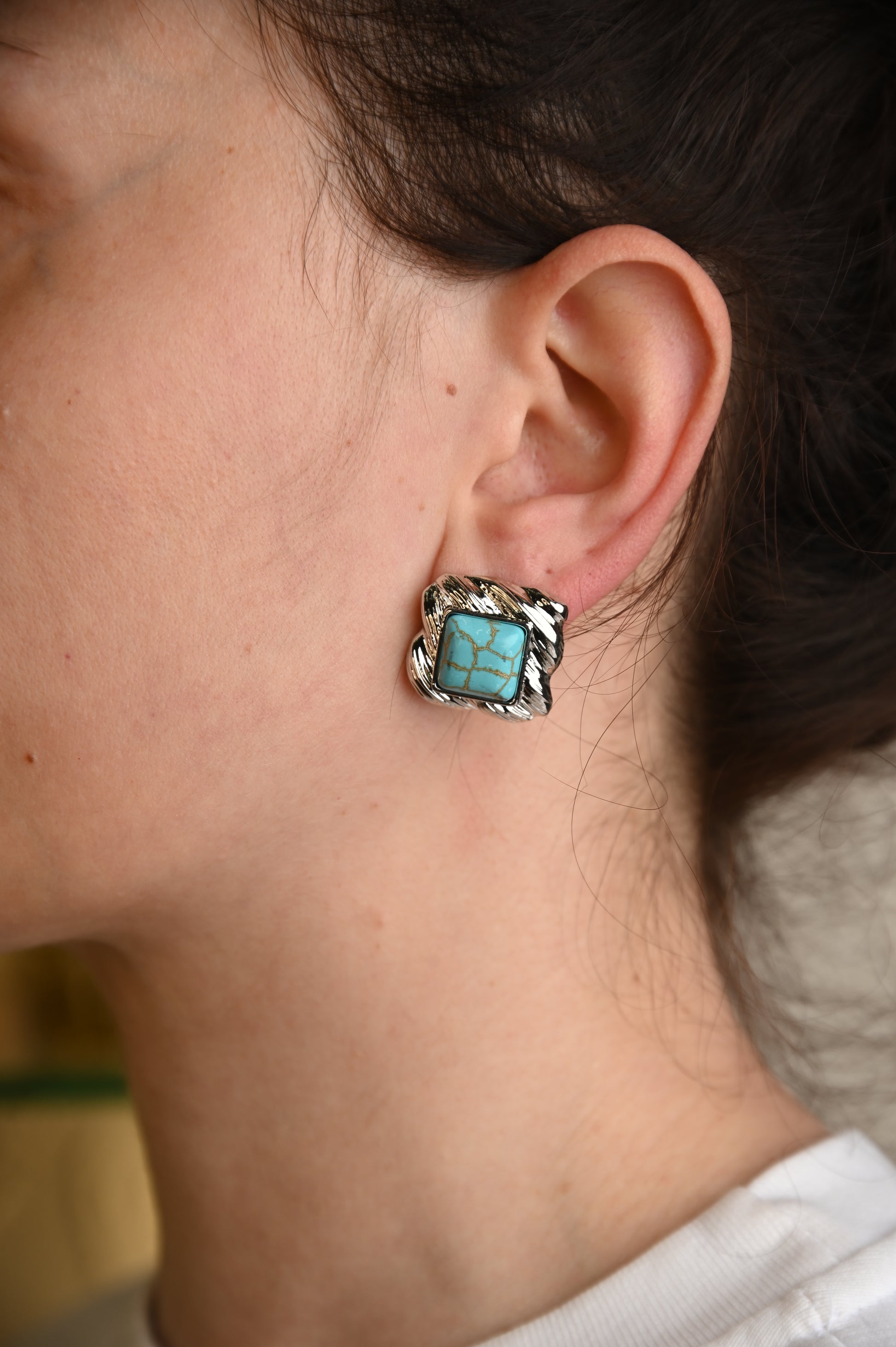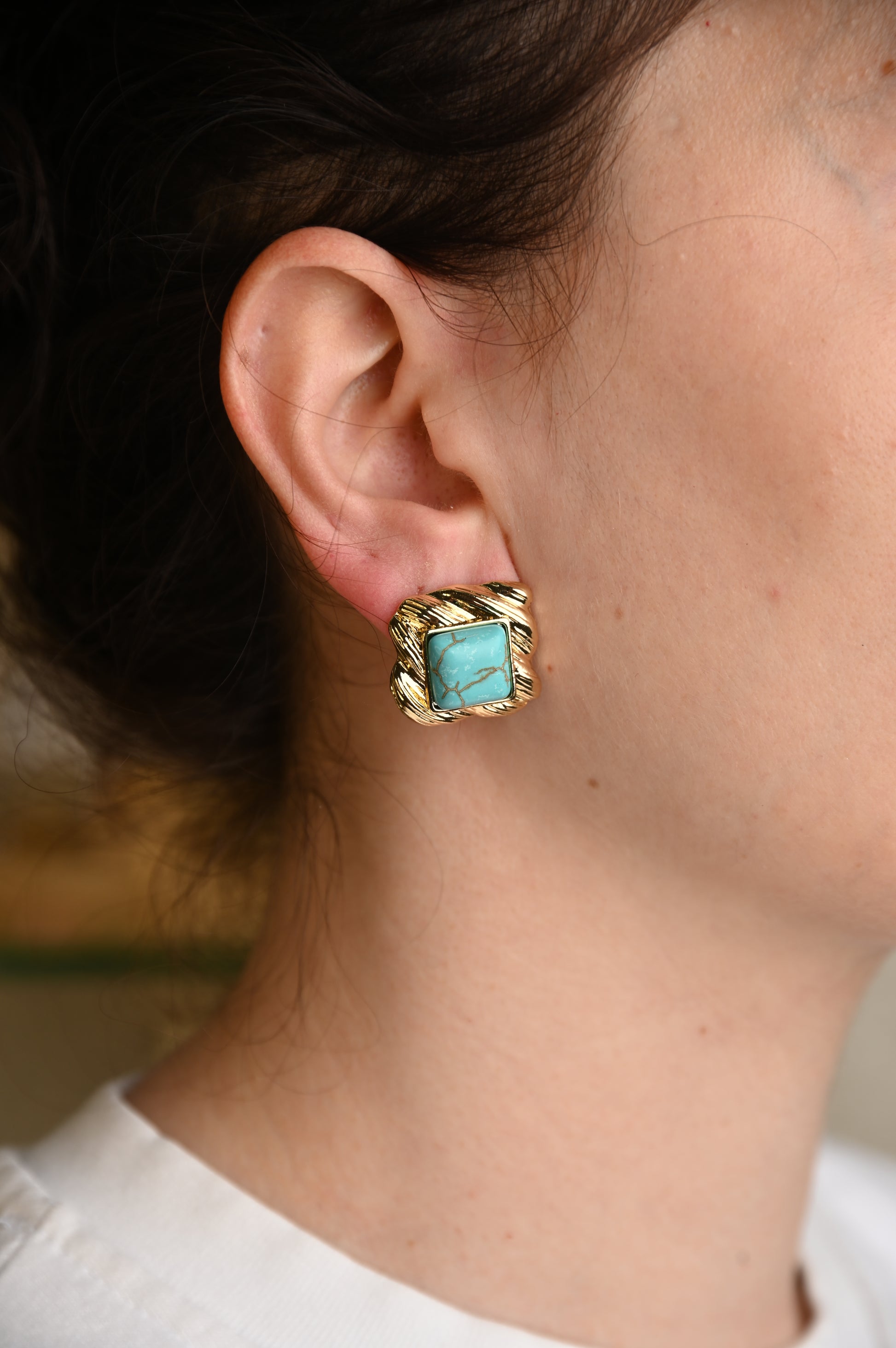 Με vintage διάθεση και εντυπωσιακή παρουσία, αυτό το σκουλαρίκι συνδυάζει την κομψότητα του χρυσού ή ασημί μετάλλου με την αυθεντική γοητεία της τιρκουάζ πέτρας. Το τετράγωνο πλαίσιο διαθέτει ανάγλυφες, σπειροειδείς γραμμές που αγκαλιάζουν τη φυσική πέτρα στο κέντρο, προσφέροντας μία αίσθηση πολυτέλειας και διαχρονικότητας.