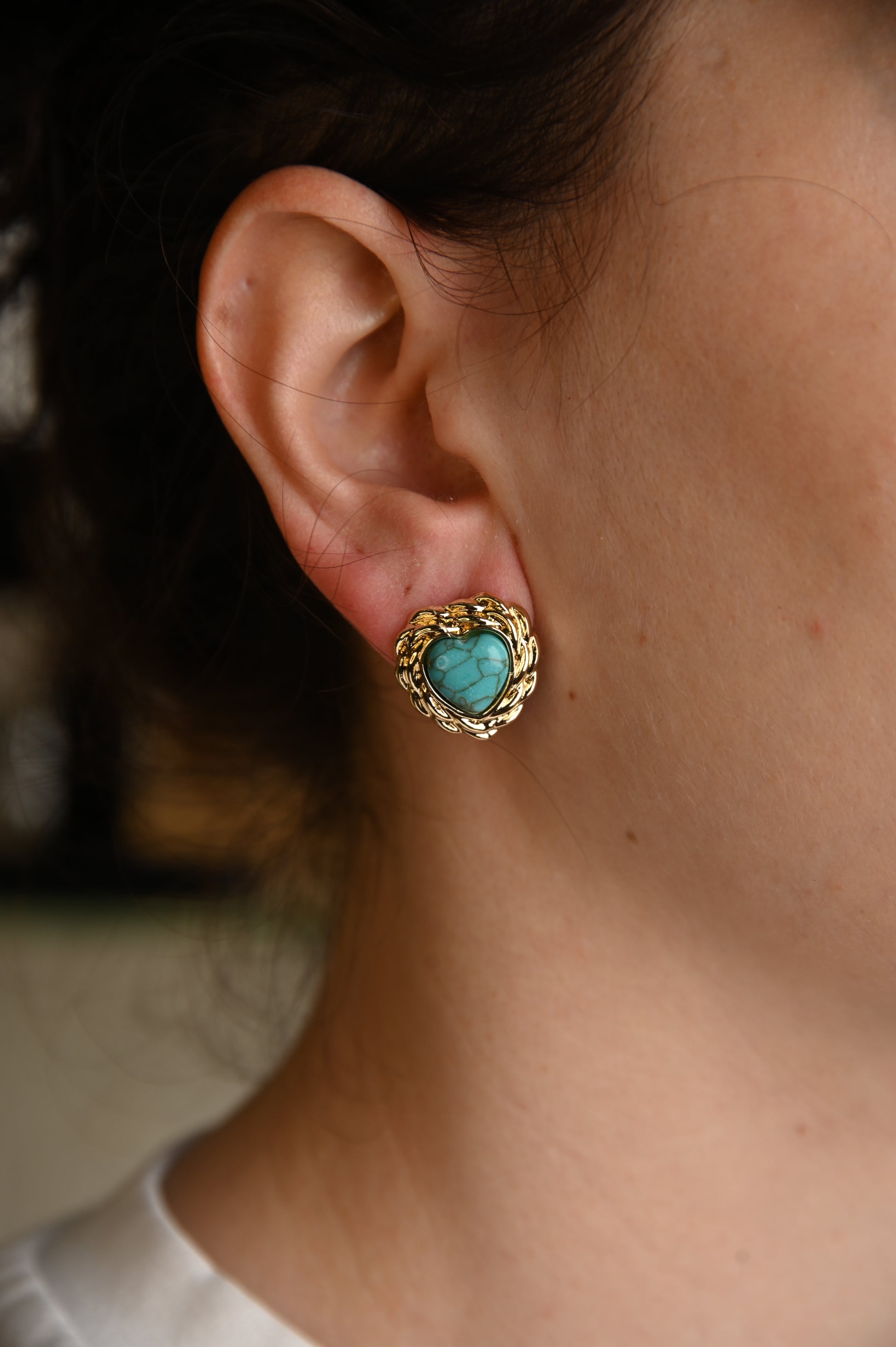 Μια τρυφερή έκφραση στυλ και συναισθήματος, αυτό το σκουλαρίκι σε σχήμα καρδιάς συνδυάζει τον ρομαντισμό με τη φυσική ομορφιά. Η τιρκουάζ πέτρα, με τις μοναδικές της νευρώσεις, είναι αγκαλιασμένη από πλεγμένο μεταλλικό στεφάνι σε χρυσό ή ασημί χρώμα, δημιουργώντας μια αίσθηση ζεστασιάς και χειροποίητου χαρακτήρα.