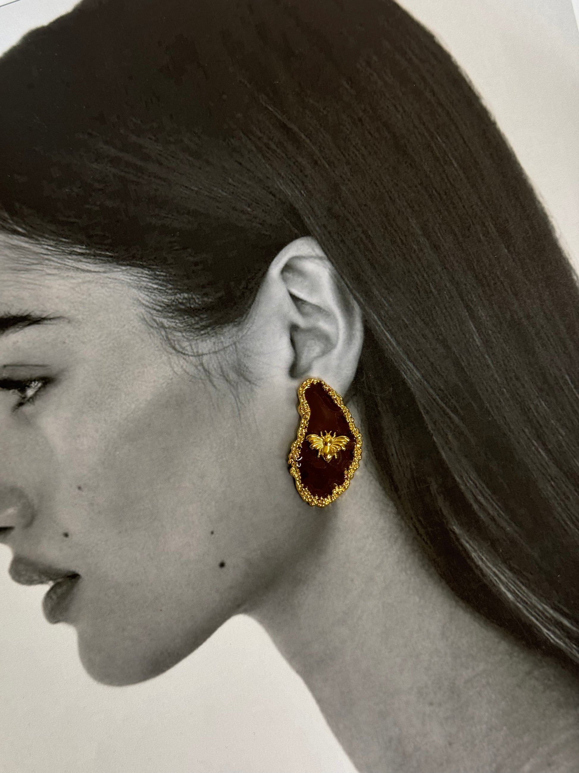 Ένα ξεχωριστό statement σκουλαρίκι που συνδυάζει καφέ χρώμα με χρυσή μέλισσα για βασιλική κομψότητα.